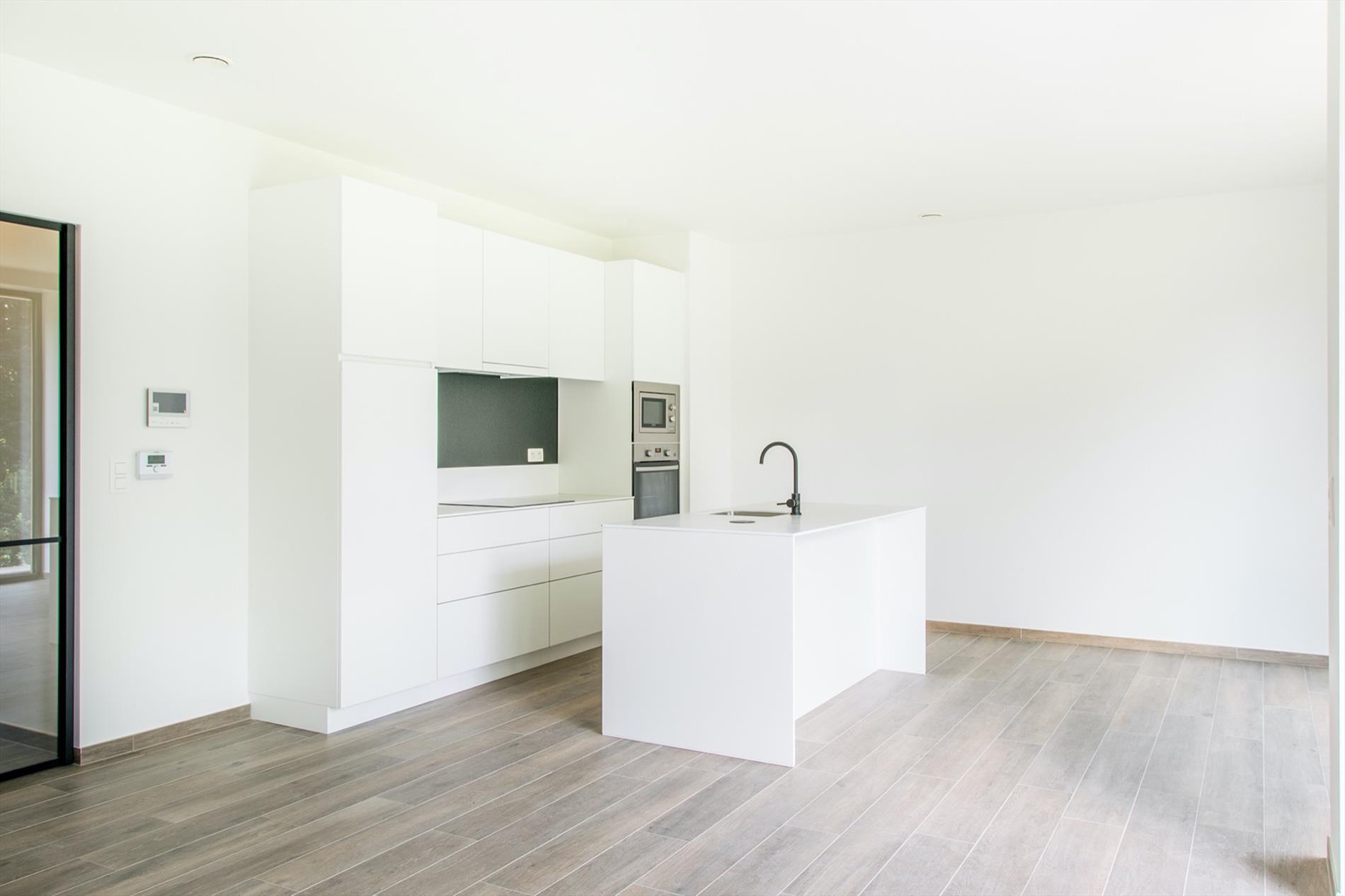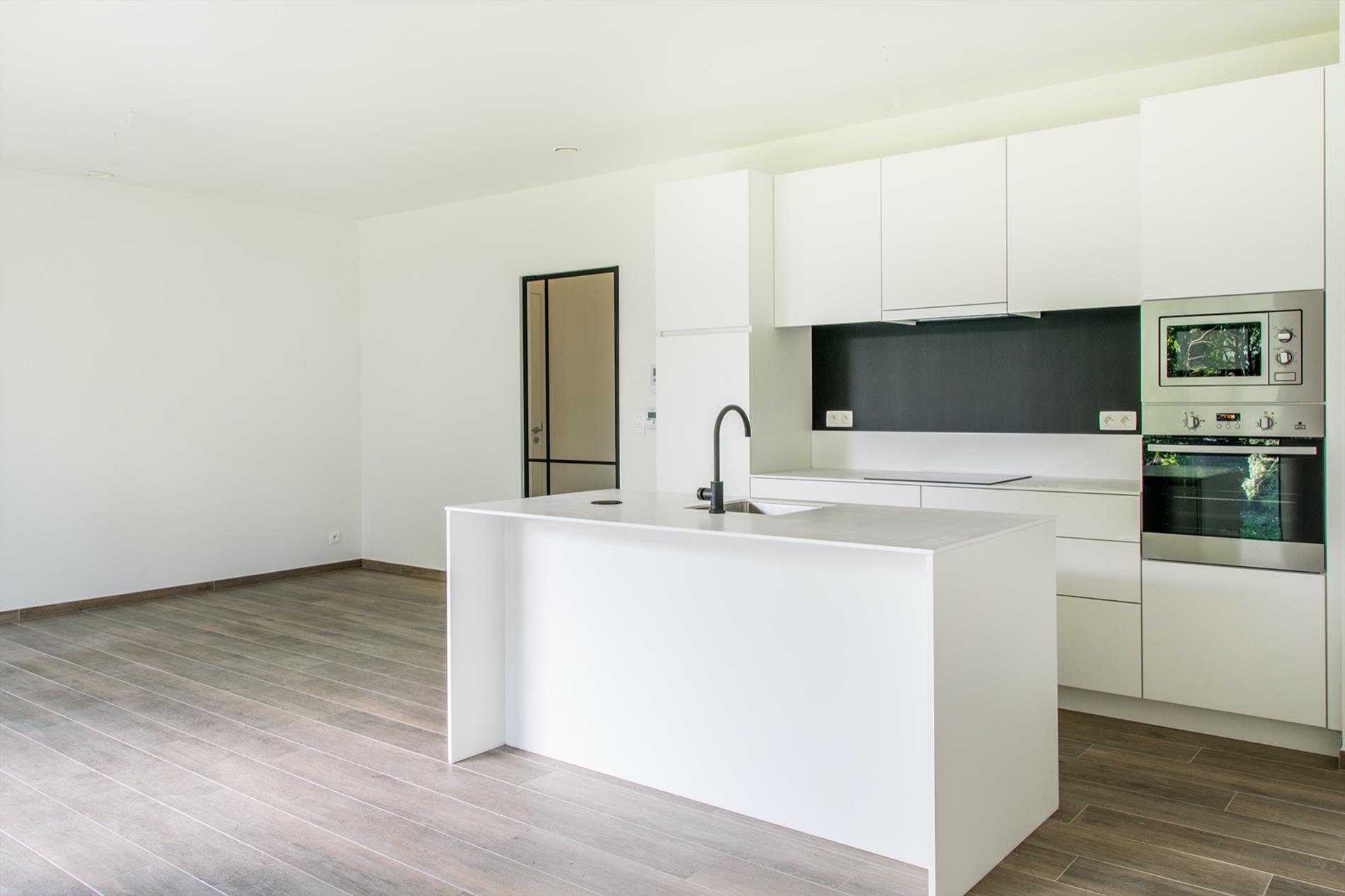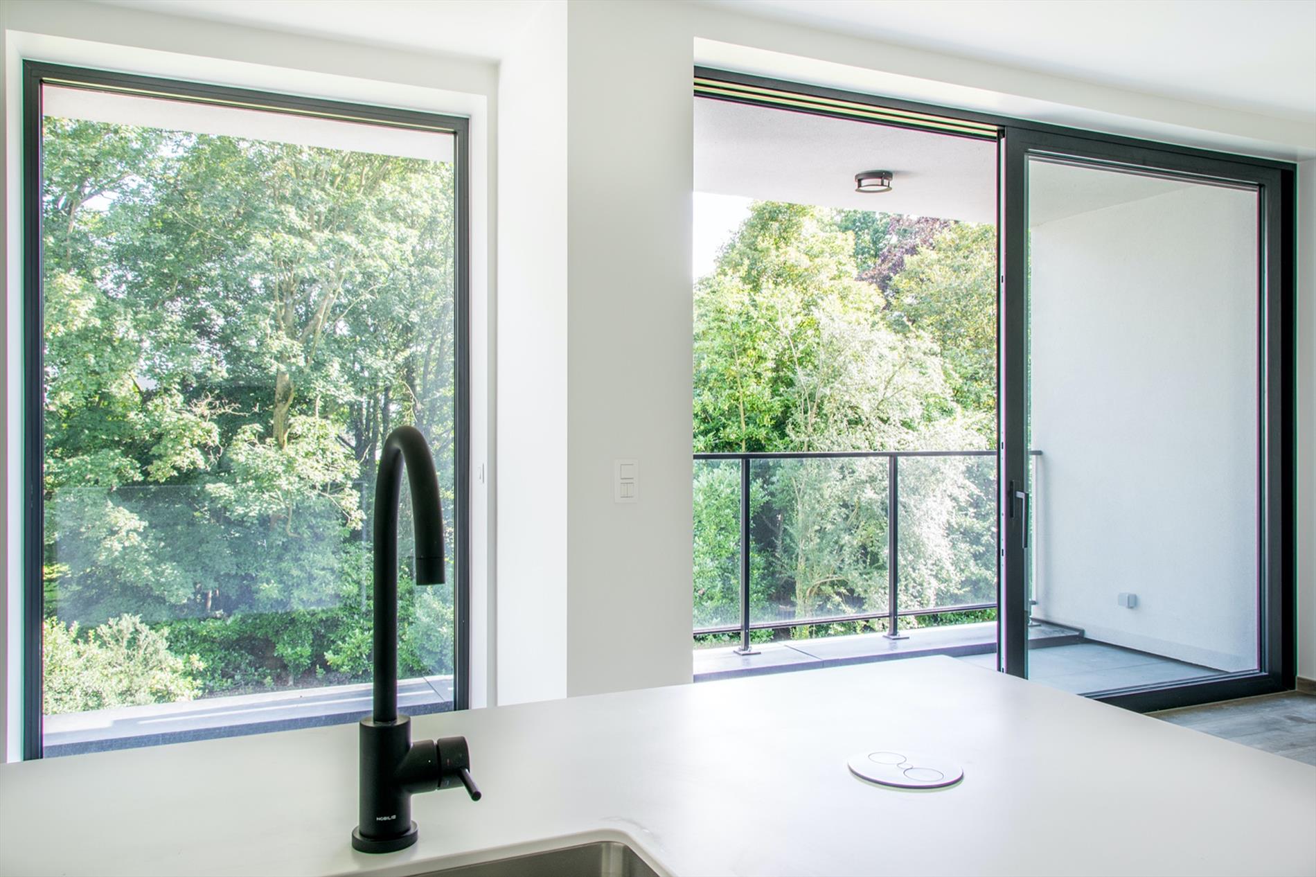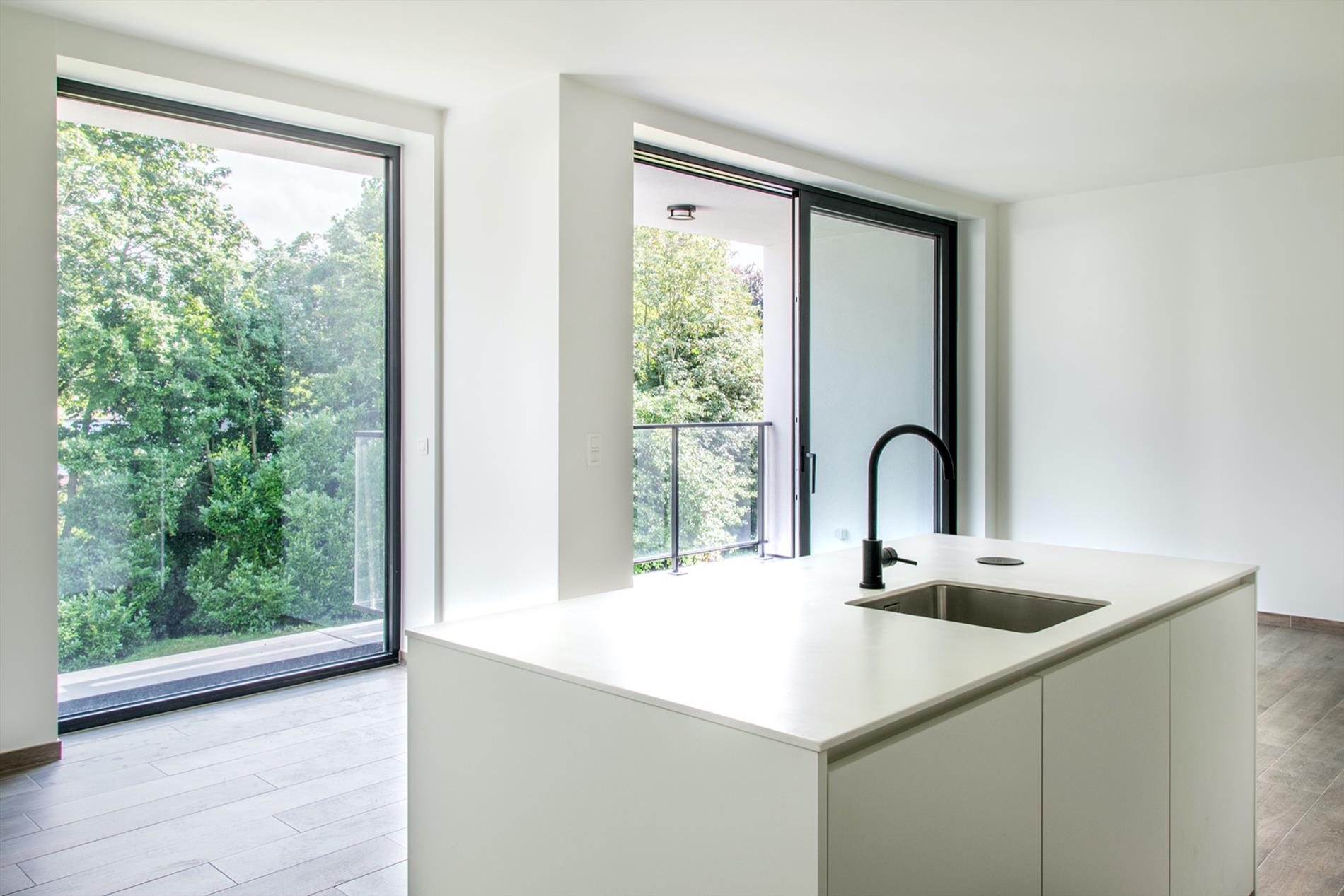 Schrijf u inZegt wonen tussen de bomen je wel iets ? Dan is dit gloednieuw appartement, gelegen op de tweede verdieping, beslist iets voor jou ! De lift in de ruime gemeenschappelijke ruimte brengt je tot aan je voordeur en erachter liggende hall. Via een stijlvolle zwarte stalen glazen deur kom je in de lichtrijke leefruimte met open keuken en kookeiland, van waaruit je een mooi uitzicht hebt op het groen. Het balkon is de ultieme plaats om in de ochtendzon te genieten van je ontbijt. Via de centrale gang (met toilet en technische ruimte) bereik je de andere ruimtes, te beginnen met een praktische badkamer met grote inloopdouche. Daarnaast zijn er twee slaapkamers, beiden met prachtig zicht op de majestueuze bomen. De grootste slaapkamer biedt mogelijkheden voor een inloopdressing, én beschikt over een eigen overdekt balkon. Overal ligt een keramische houtlook vloer die samen met de vloerverwarming zorgt voor een gezellige, klassevolle uitstraling. Ondergrondse parkeerplaats en fietsenstalling. Gem.kosten 60,00 euro/maand.