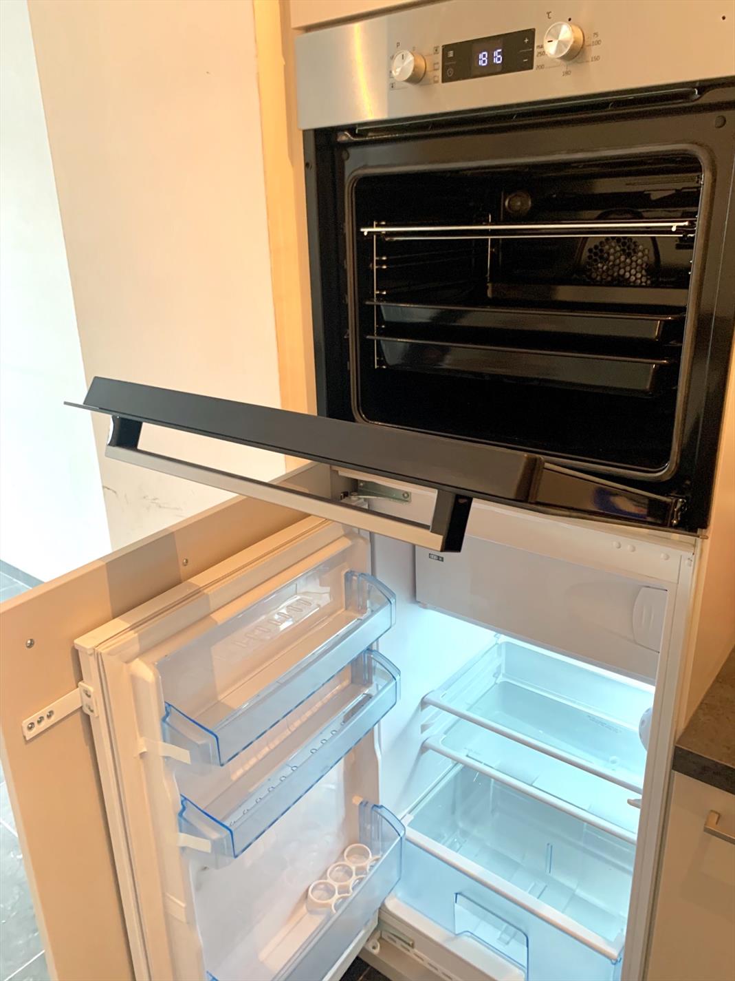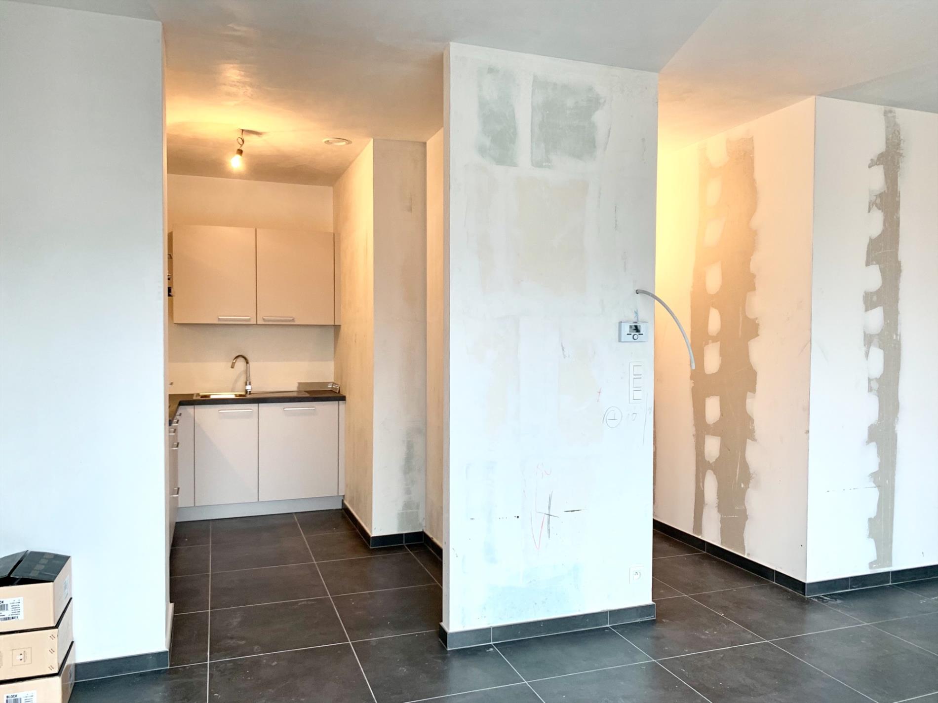 De open keuken is aanpalend aan de woonkamer. In de inkomhal bevindt zich het gastentoilet. Aan de andere zijde van de leefruimte is er nog een ruime berging, badkamer met inloopdouche en lavabomeubel en een ruime slaapkamer.