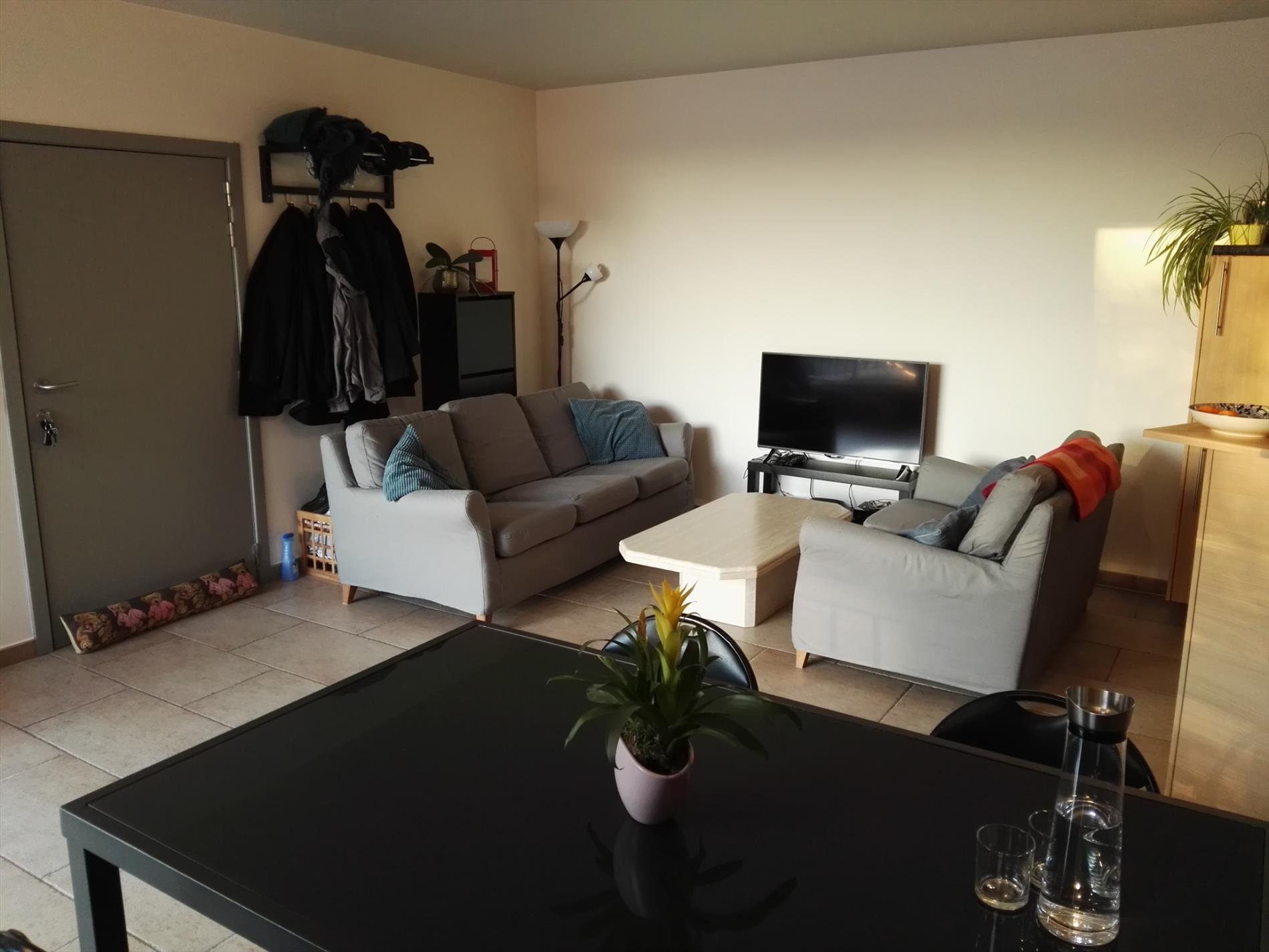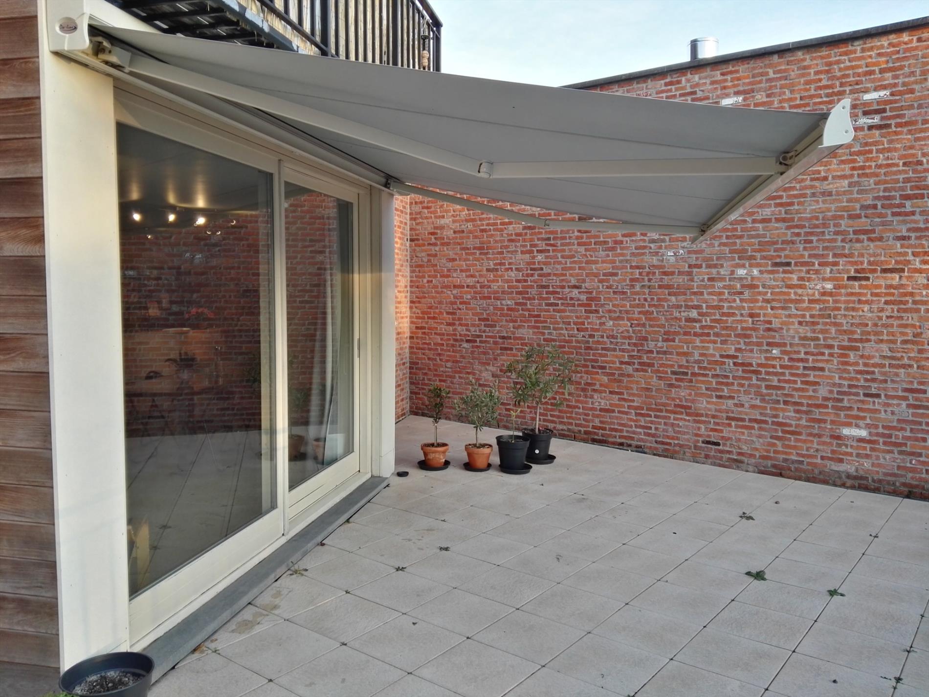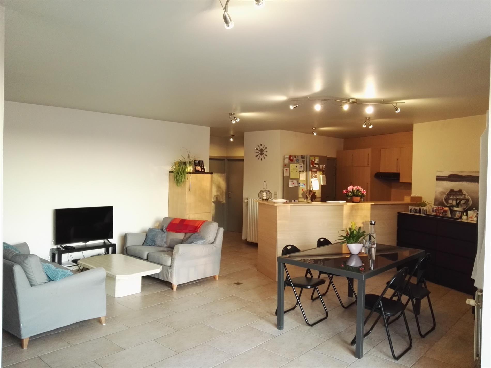 Het appartement is zeer ruim (91 m²), u komt terecht in de grote living met open keuken voorzien van alle nodige toestellen. Er is zeer veel lichtinval langs beide kanten van het appartement. In de living kan u via het grote schuifraam rechtstreeks op het groot zuidgericht terras dat uitgeeft op de zeer rustige binnenkoer.