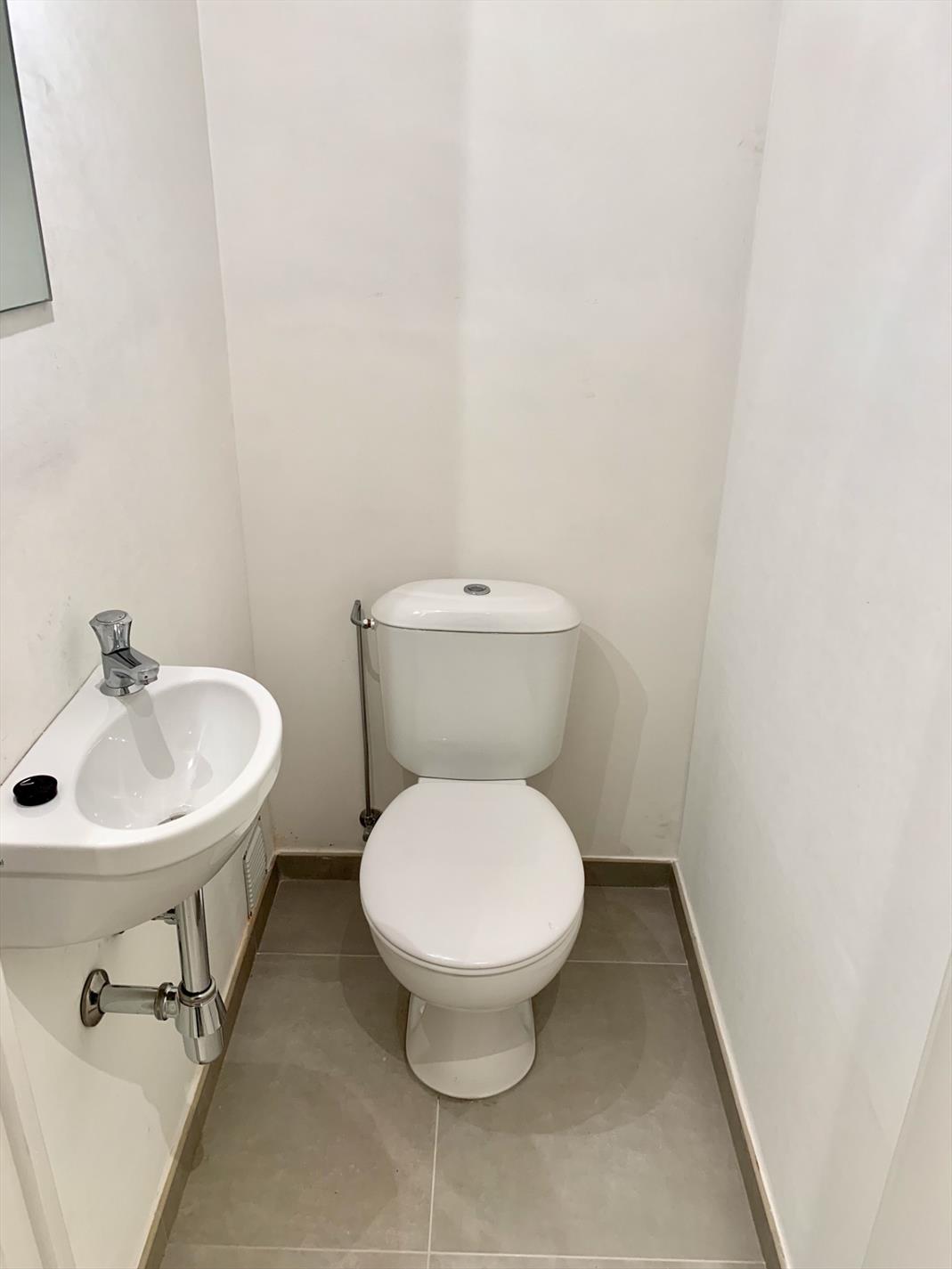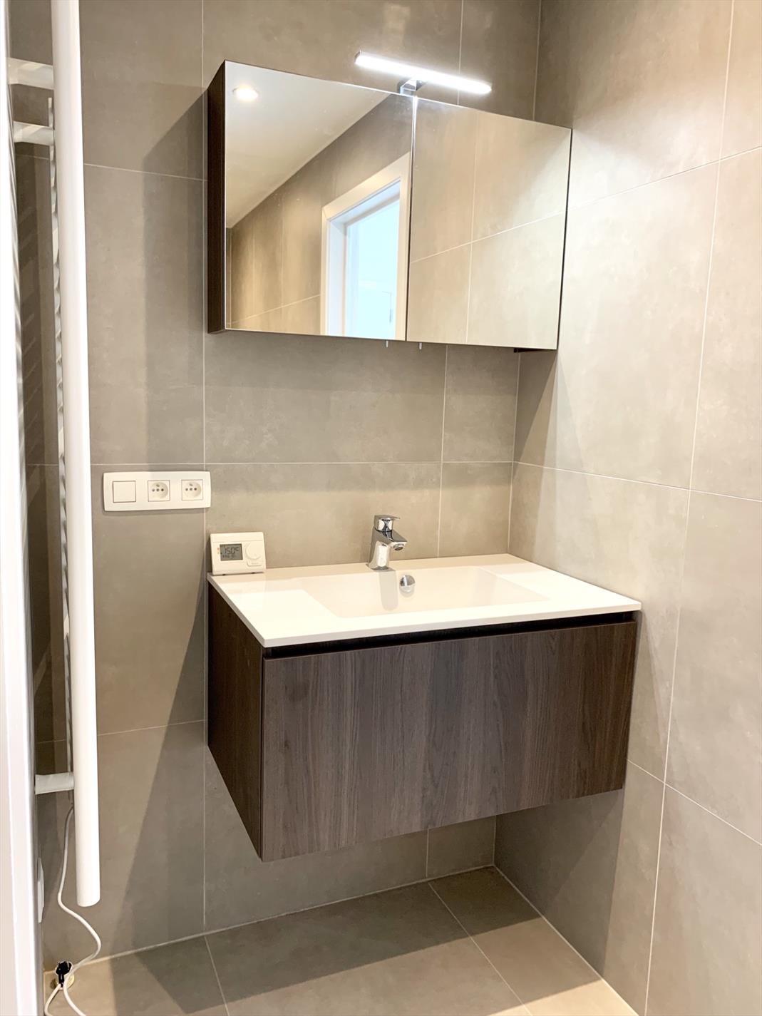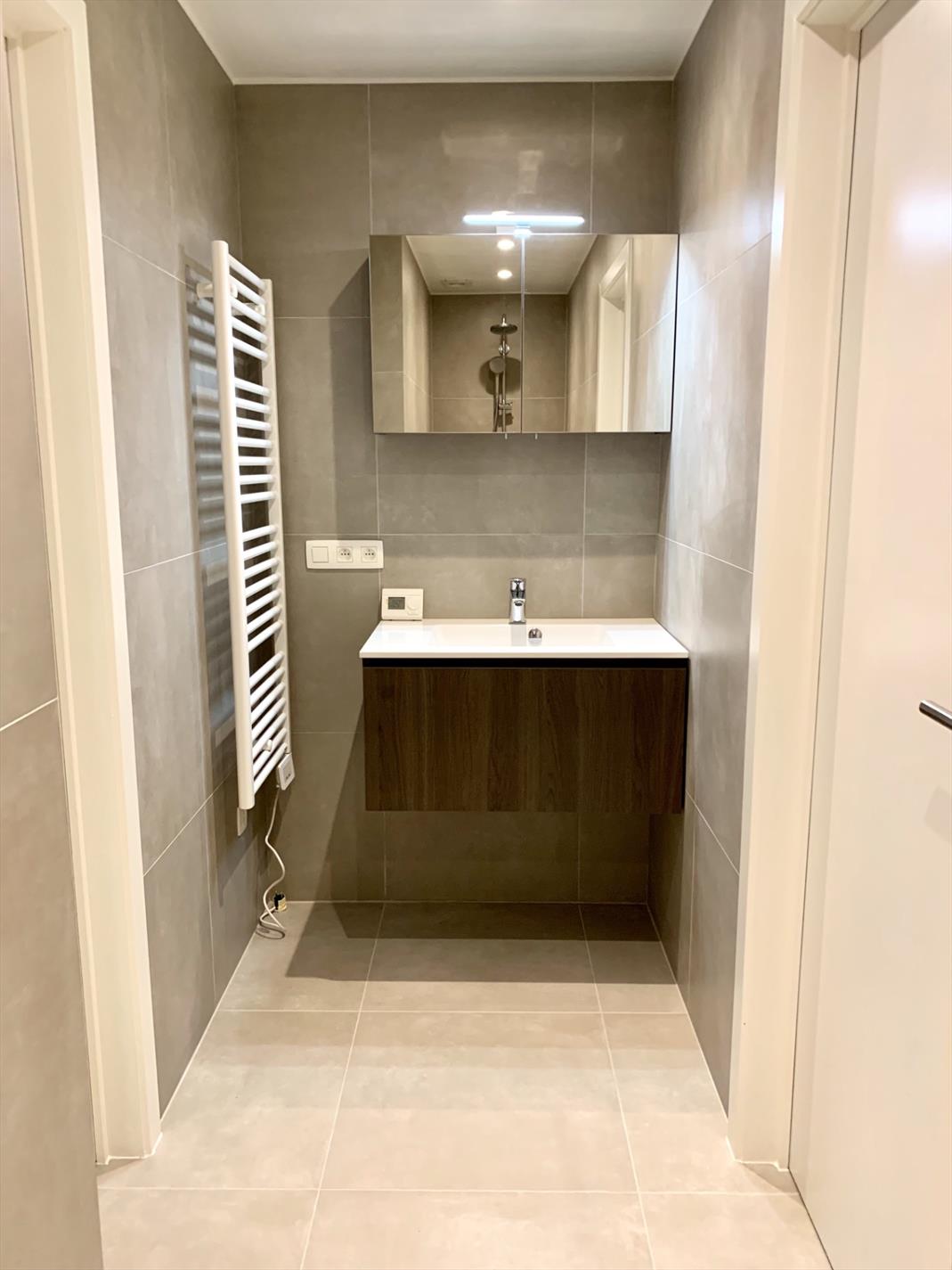 De badkamer is een echte blikvanger. Hier heeft u een prachtige betegelde inloop-regen douche (van 90x180cm) en een lavabomeubel met speigelkastje en extra ladenkast en handoekdroogrek. In de inkomhal is een apart toilet en een wasruimte voorzien.