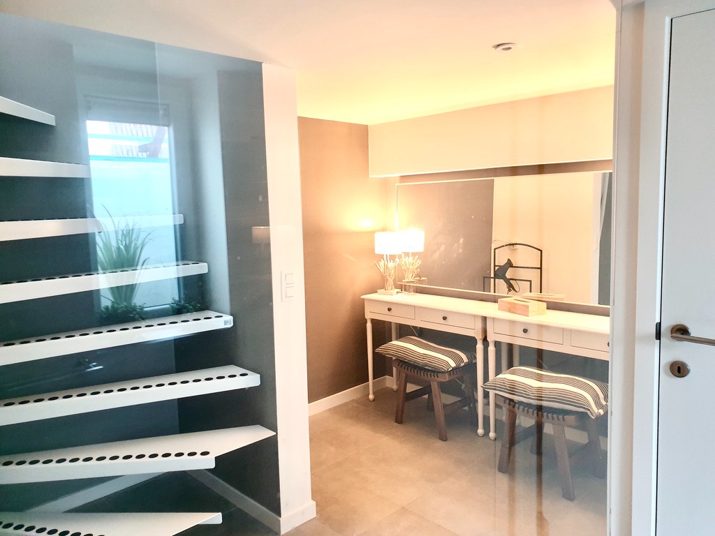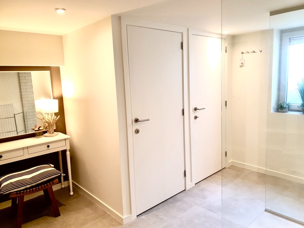 Aan de andere zijde bevindt zich het slaap gedeelte. De scheidingswand met draaitrap is de doorgang naar de volledig afgewerkte kelderverdieping waar niet alleen de dames lang zullen vertoeven in de prachtige badkamer met inloopdouche, lavabo-meubel en make-up room. Er is ook nog een apart toilet en aparte berging.