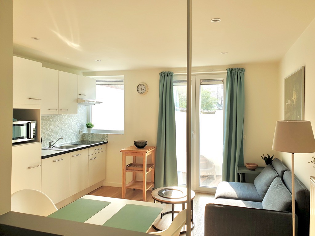 Via de gemeenschappelijke inkom komt u aan het gelijkvloers appartement. De woon-, studeerkamer is sfeervol ingericht samen met de open keuken die voorzien is van alle nodige toestellen, zelfs een vaatwasser. Aansluitend kan u naar het gezellige binnenterras waar u geen inkijk heeft.