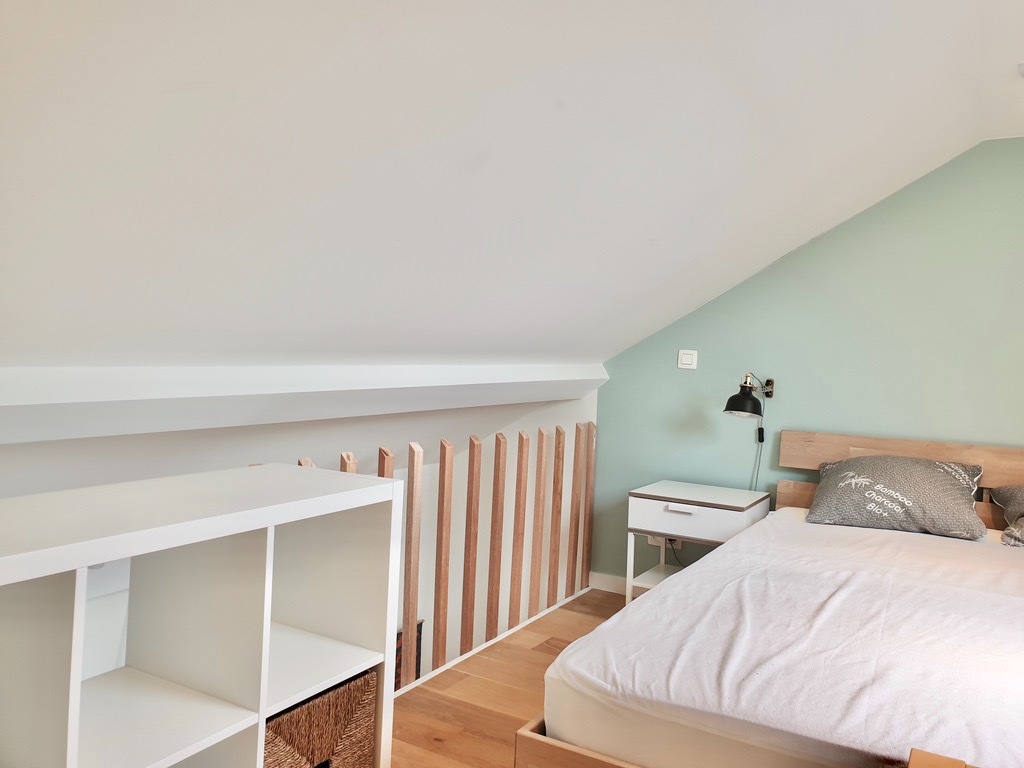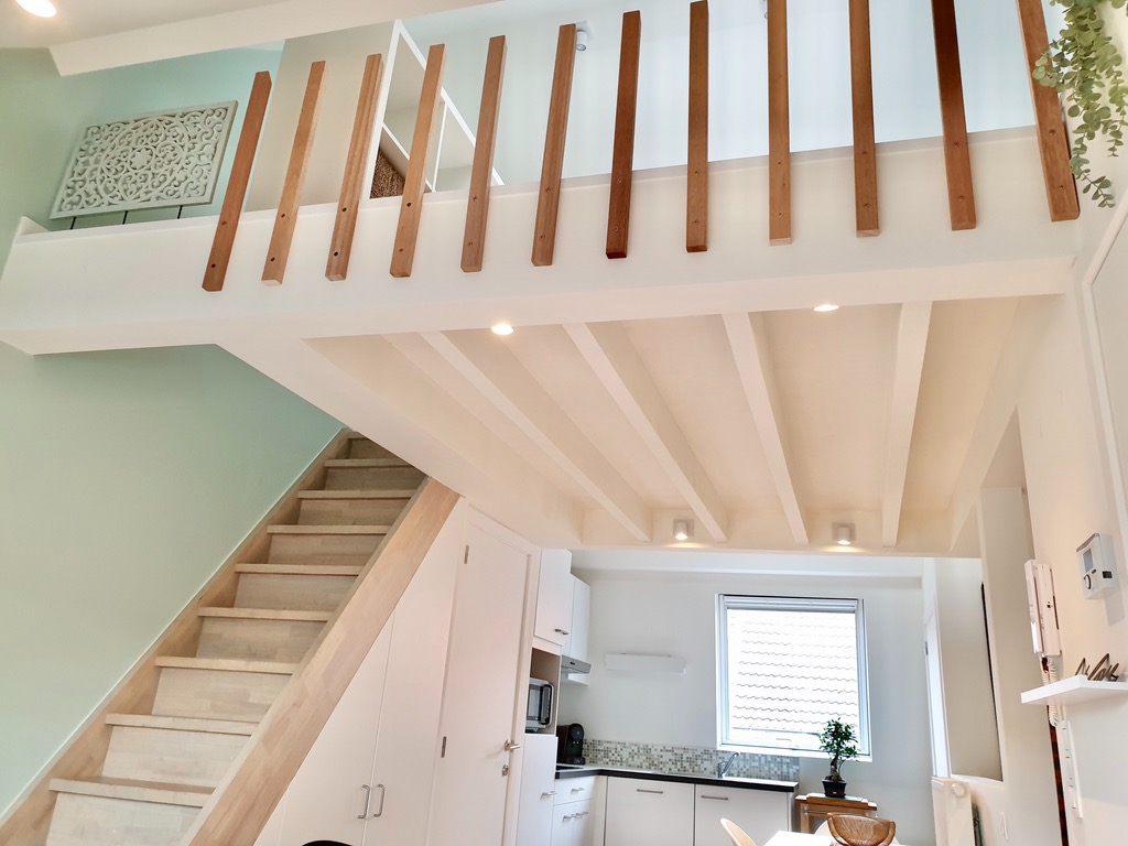 De slaapkamer is te bereiken via een vaste trap in de woonkamer.