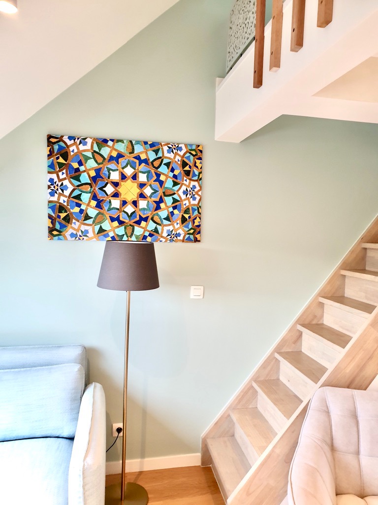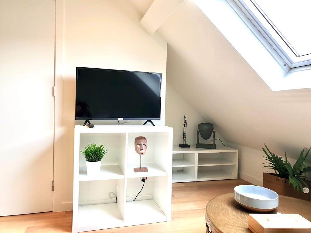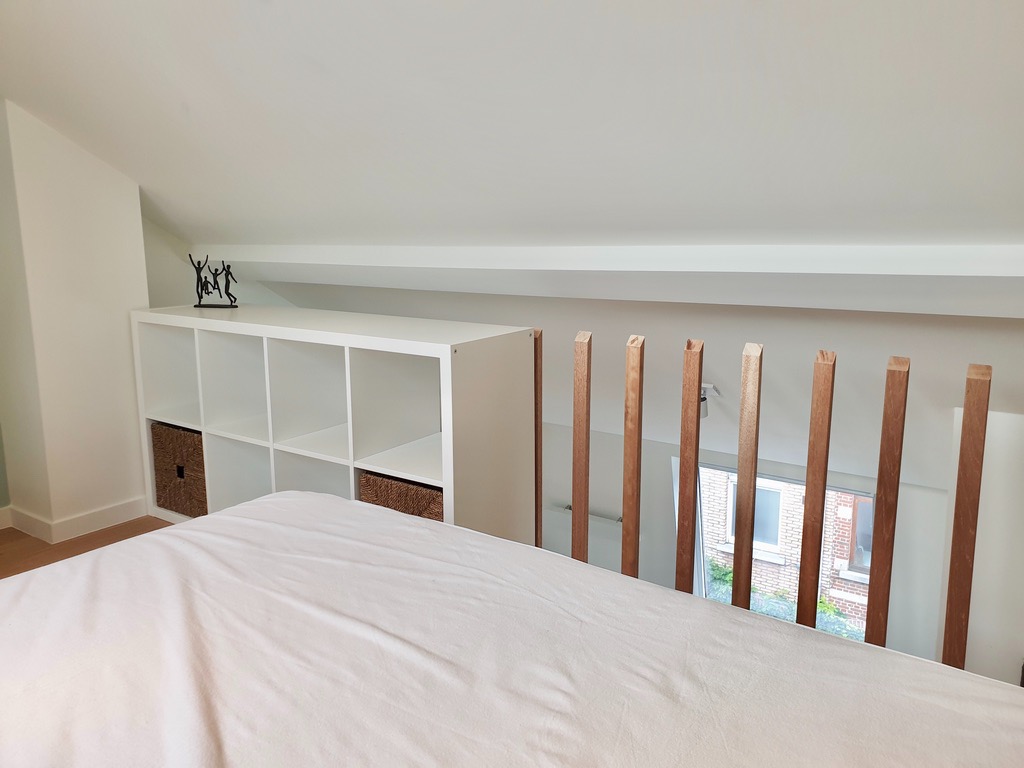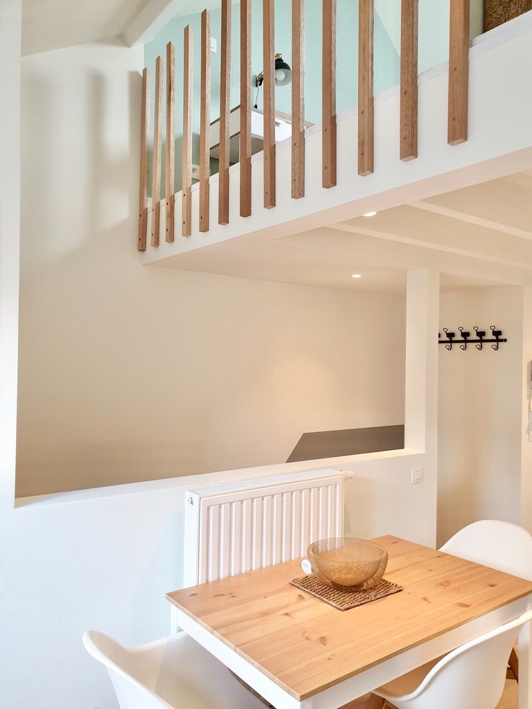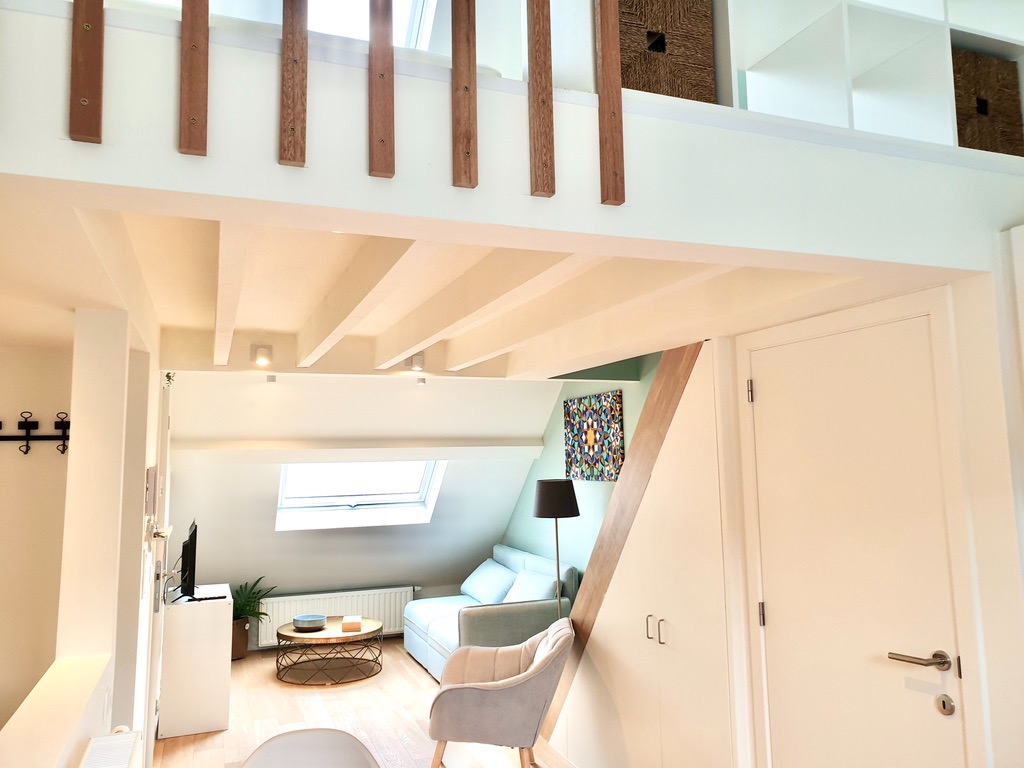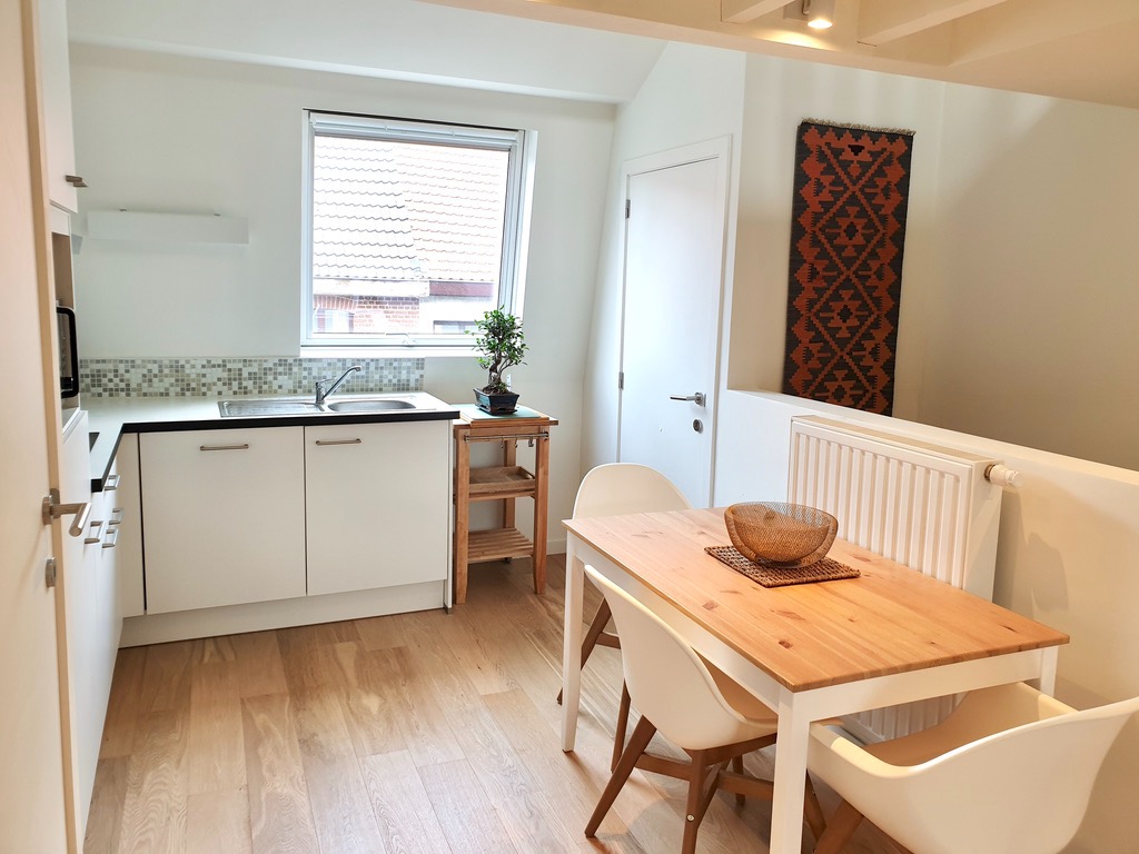 Via de gemeenschappelijke inkom komt u aan de trap om naar de tweede verdieping te gaan. De woon-, studeerkamer is sfeervol ingericht samen met de open keuken die voorzien is van alle nodige toestellen, zelfs een vaatwasser.