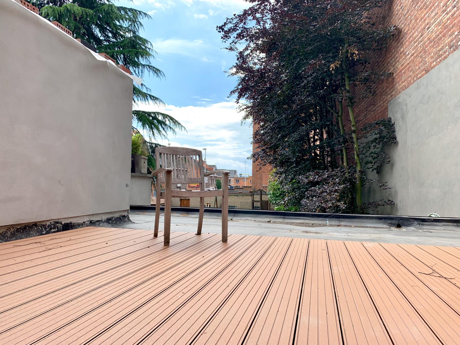 Op de eerste verdieping bevinden zich een ruime woonkamer met balkonnetje, een doorloop naar de half open keuken incl alle nodige toestellen, grote berging en een prachtig dakterras van 20m2. (Balustrades worden nog geplaatst)