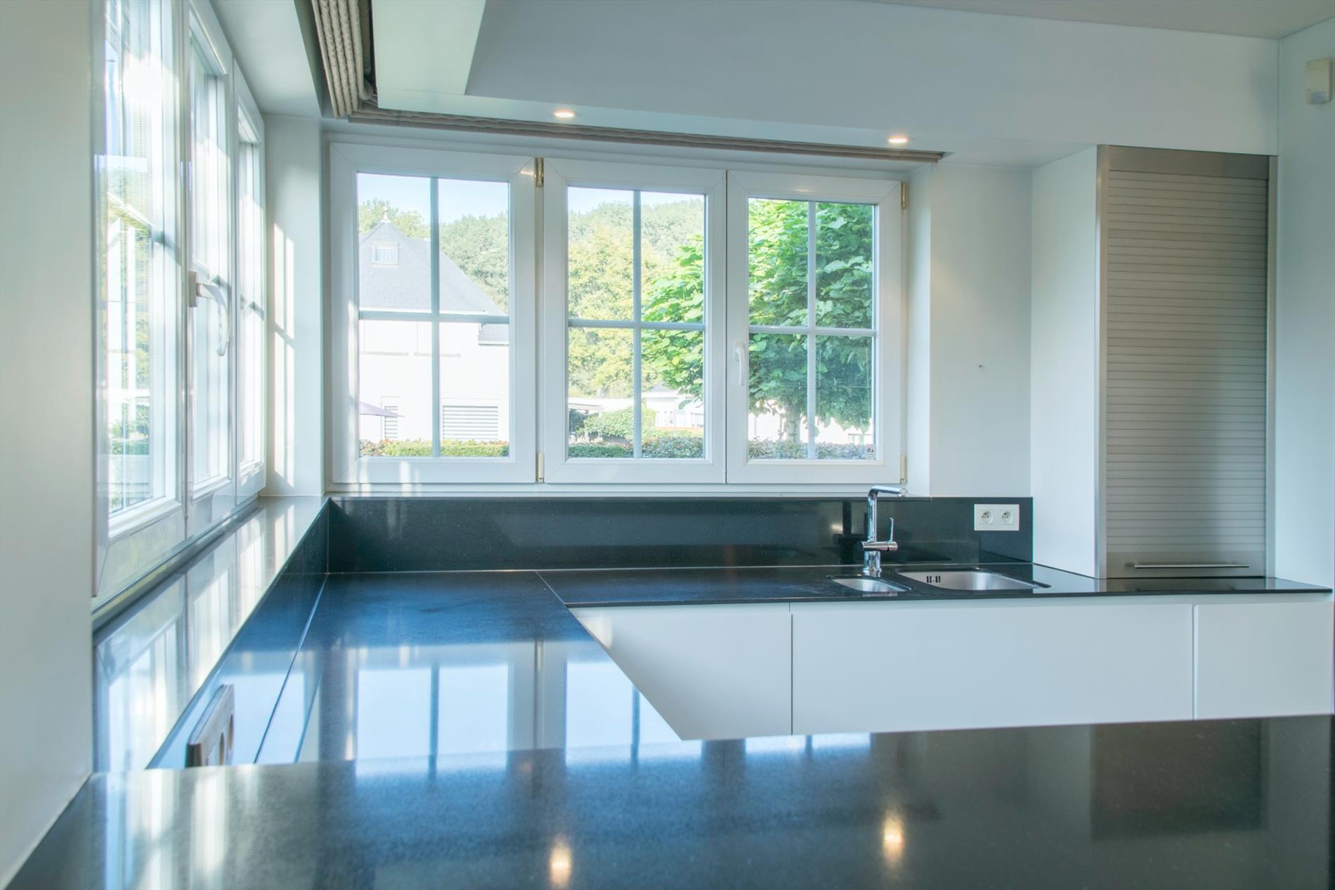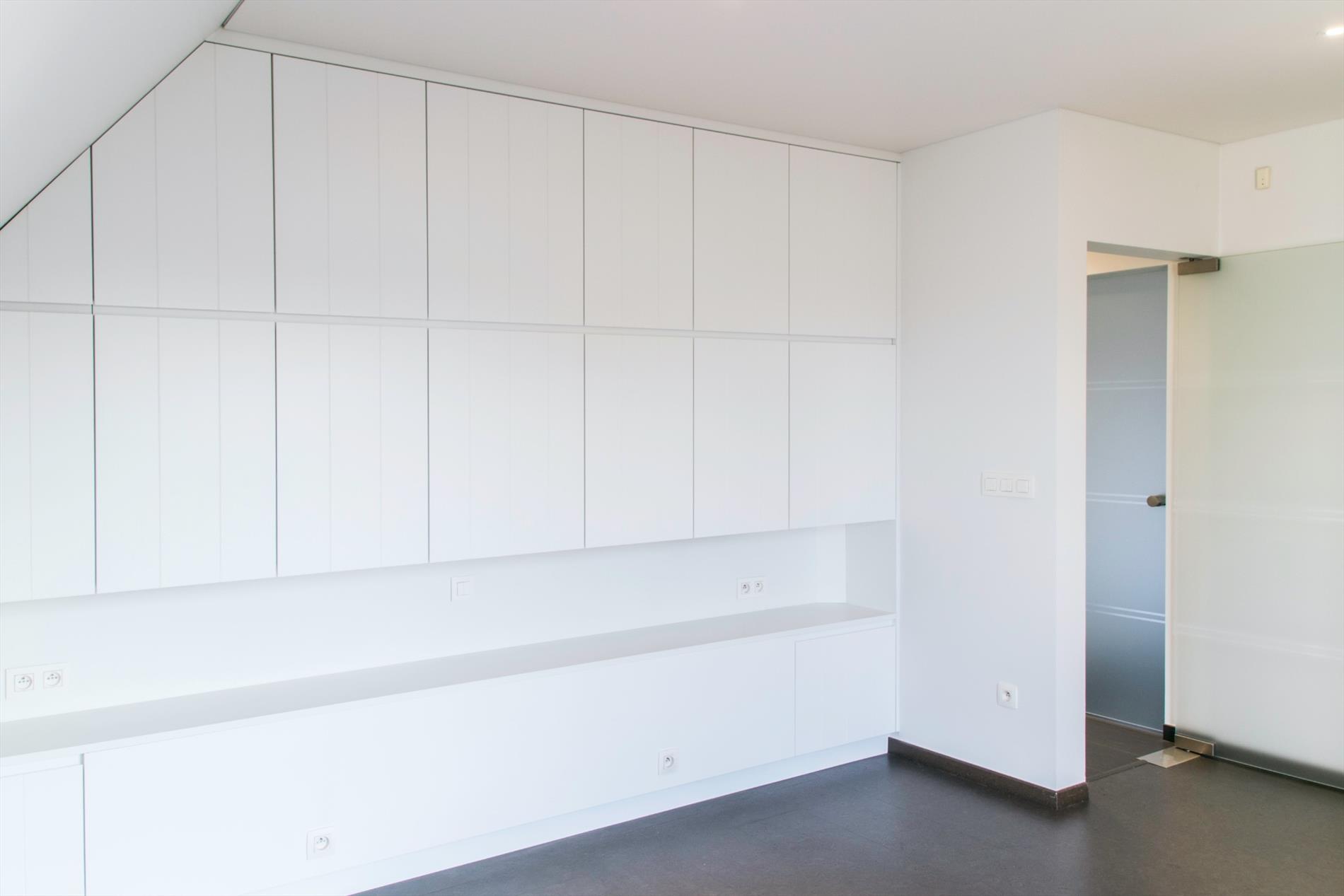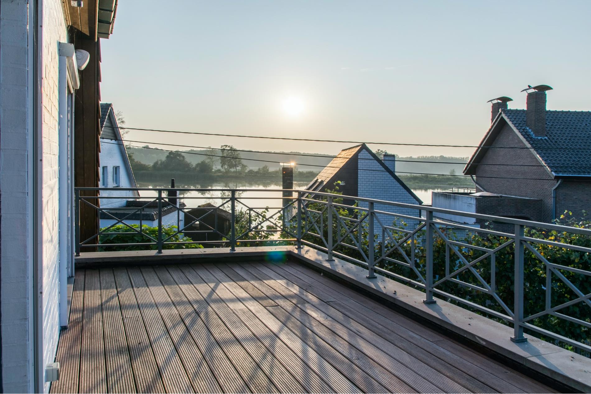 De open leefruimte met open keuken gaat door op datzelfde elan. Overal mooie ingemaakte kasten, via domotica aangestuurde gordijnen - verlichting - zonneschermen - alarmsysteem : wat wil een mens nog meer ? Met als absolute eyecatcher tijdens gezellige donkere avonden : de automatische gashaard. Toegang tot het terras en de mooi aangelegde tuin heb je via een groot schuifraam, waar een automatische luifel voor de schaduw zorgt op te warme dagen. Achteraan in de afgesloten tuin kan u via het tuinhek uw auto parkeren. Op het gelijkvloers bevindt zich ook nog een bergruimte en een bureau of extra slaapkamer. Via de verlichte trap kom je op de eerste verdieping, waar zich naast de alweer modern uitgeruste badkamer (met regendouche) en afzonderlijk toilet, nog drie mooie slaapkamers bevinden. Twee ervan hebben toegang tot het tweede terras, met een adembenemend uitzicht op het Donkmeer. Ook deze twee slaapkamers hebben zeer stijlvolle ingemaakte kasten.