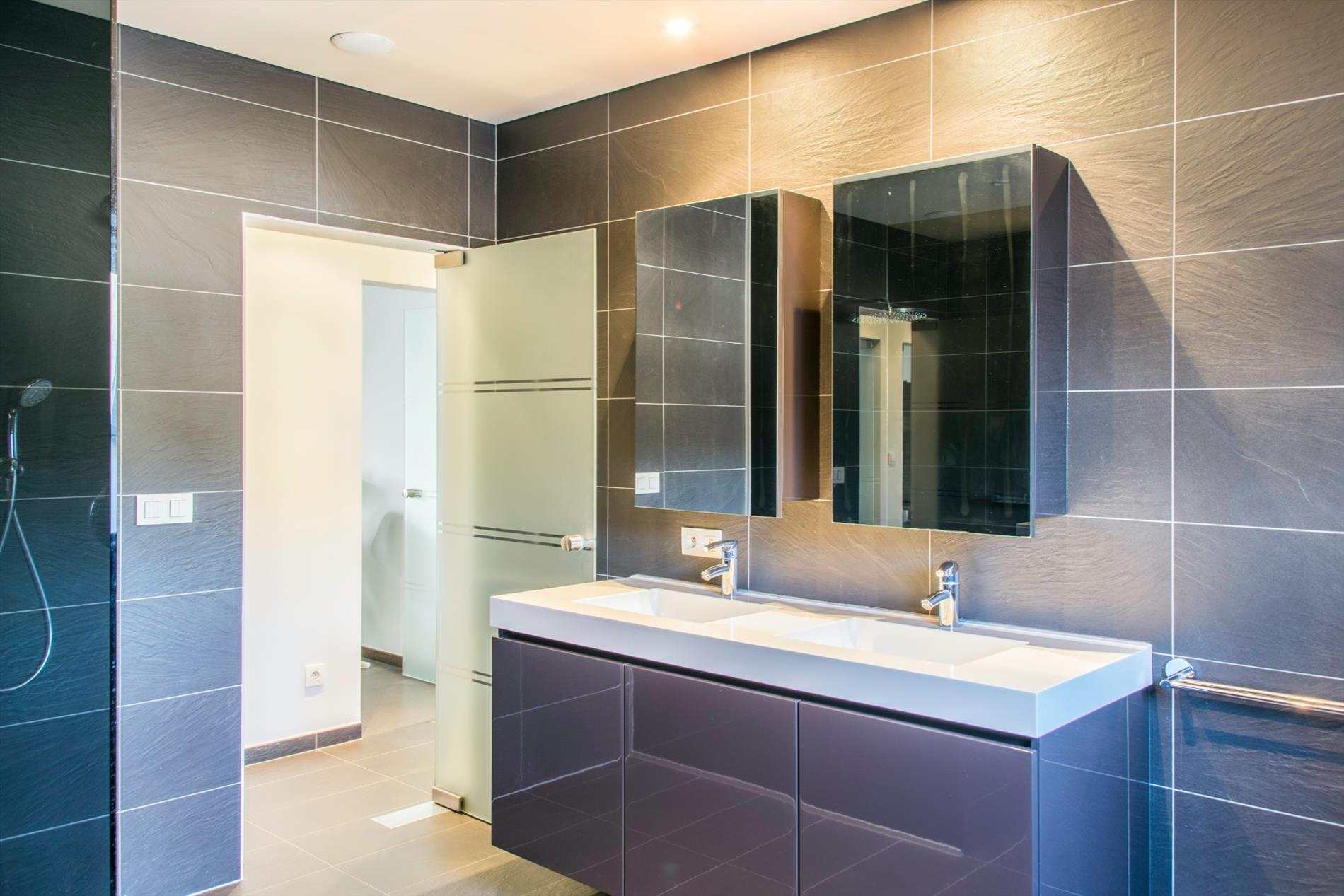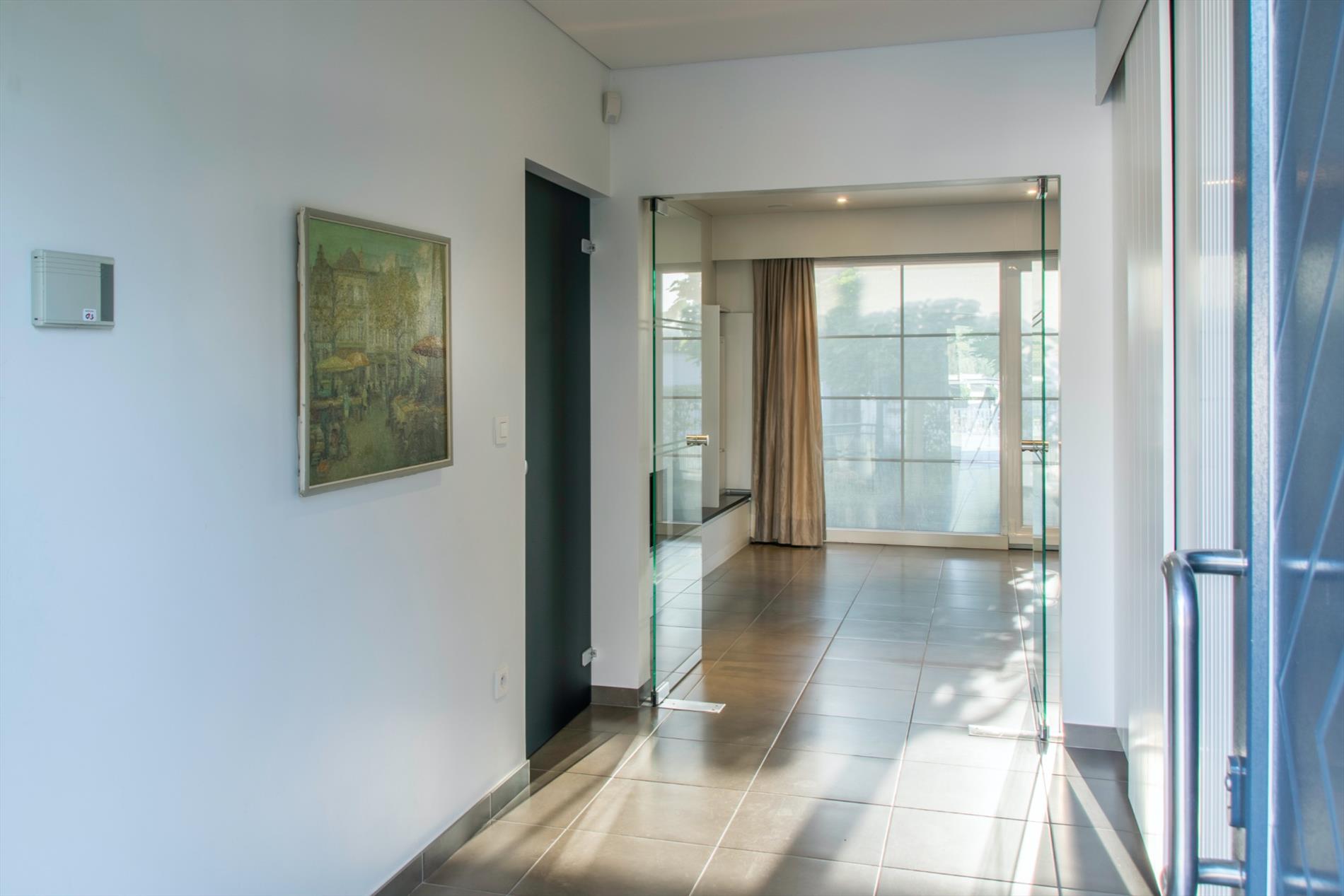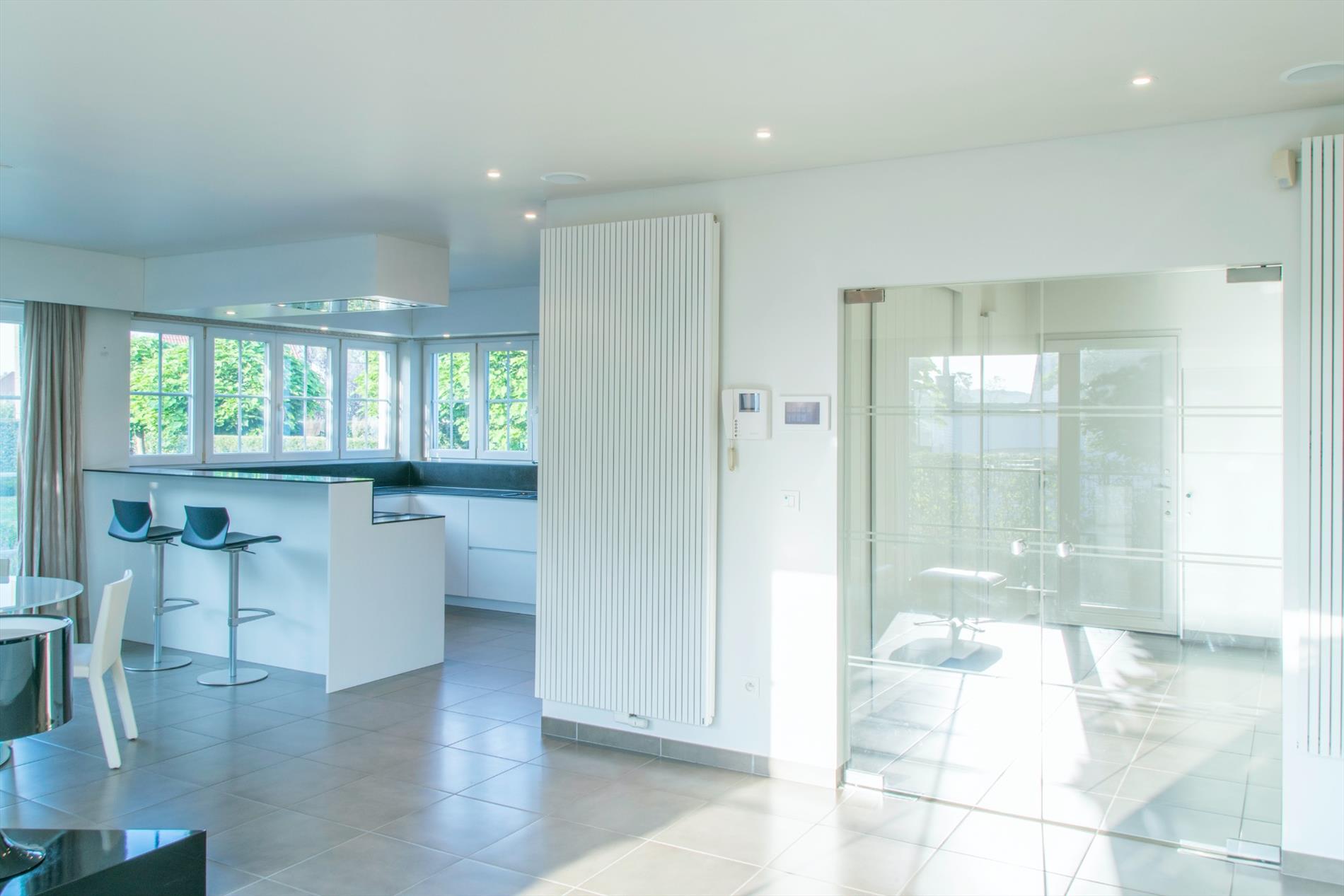 Schrijf u inDeze eigentijdse woning betreed je via een zeer ruime inkomhal, waar de ingemaakte kasten een zee aan bergruimte verbergen. Zelfs aan het gastentoilet merk je het : hier is heel stijlvol omgesprongen met kwaliteitsmaterialen.