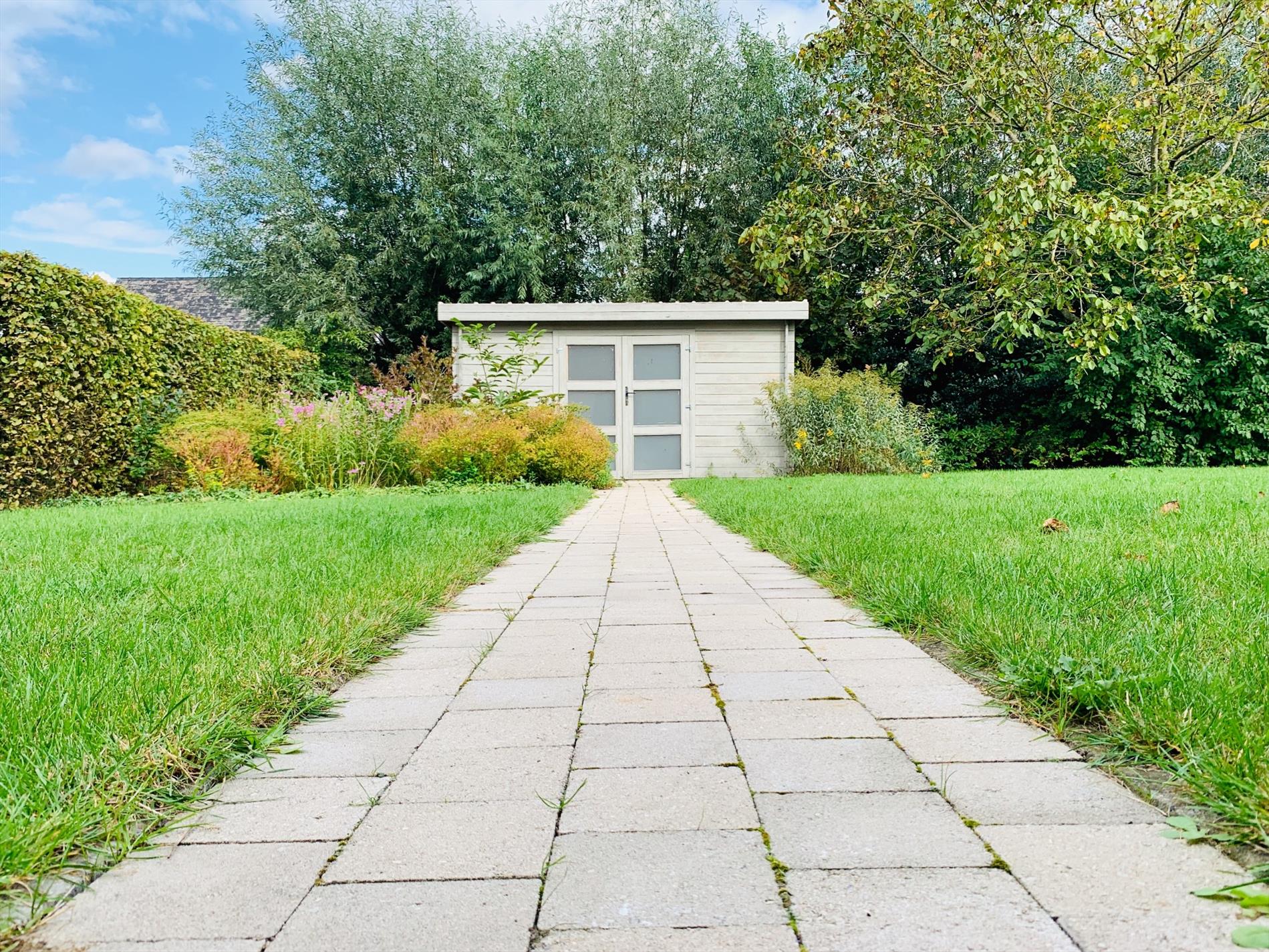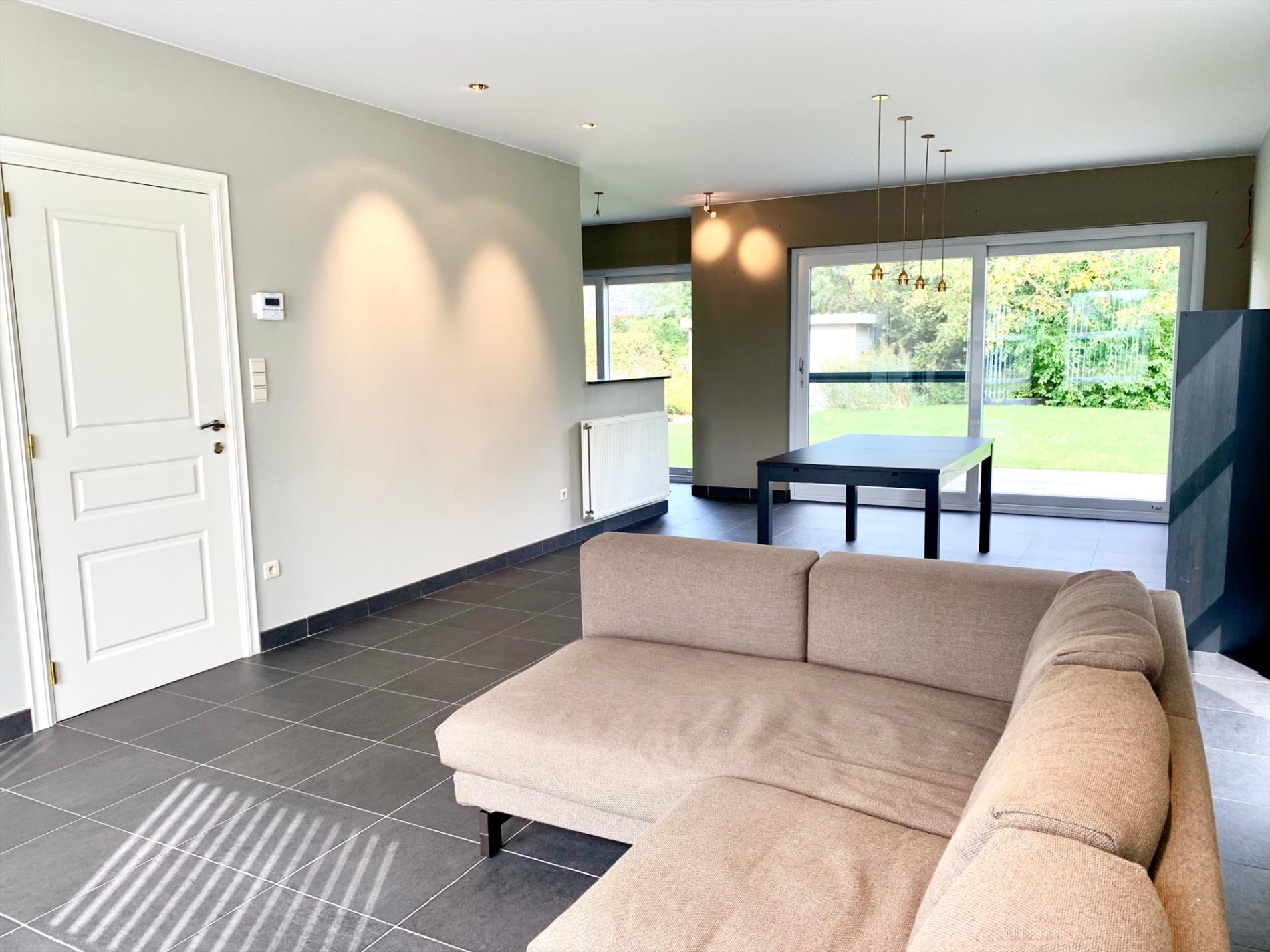 Via de zeer lichtrijke inkomhal met gastentoilet loopt u door naar de ruime woonkamer met half open keuken. In de keuken bevinden zich alle nodige toestellen en er zal nog een nieuwe combi-oven geplaatst worden. Via de 2 grote schuiframen komt er enorm veel licht binnen en kan u rechtstreeks naar het grote nieuw aangelegd terras vlakbij de tuin. De goed onderhouden tuin is west-gericht,maar toch kan u hier de gehele dag in de zon vertoeven. Er is ook een tuinhuis voorzien. Naast de keuken is een ruime wasplaats die ook verbinding geeft naar de garage met elektrische poort.