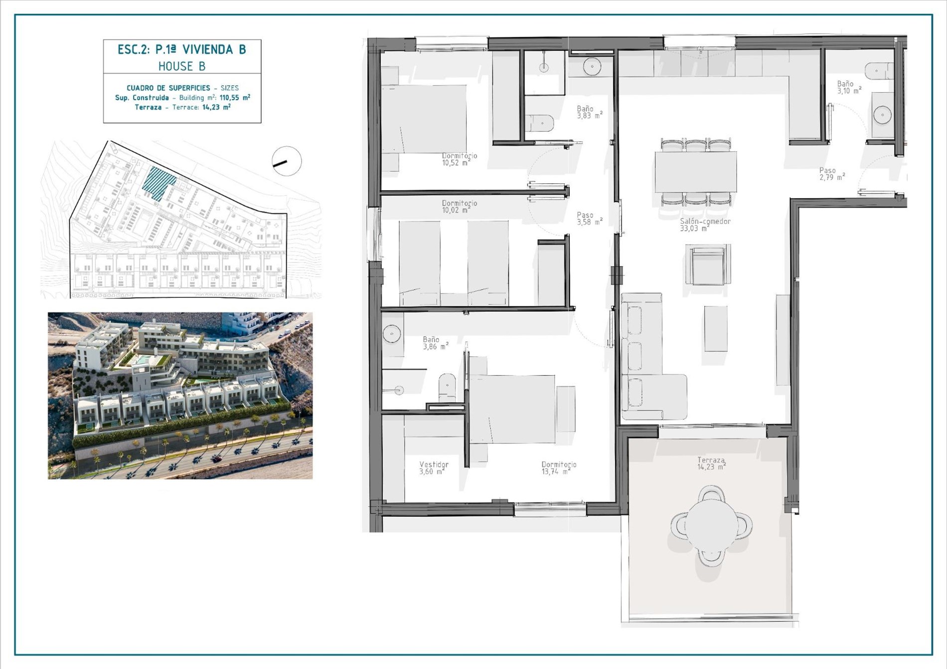 Nieuwbouw complex bestaat uit 36 appartementen met 3 en 2 slaapkamers verdeeld over 4 moderne blokken, uitgerust met 2 gemeenschappelijke zwembaden en gemeenschappelijke garage met parkeerplaats en berging voor elke woning; en 10 elegante villa's met 4 slaapkamers en 3 badkamers, elk met een eigen zwembad.