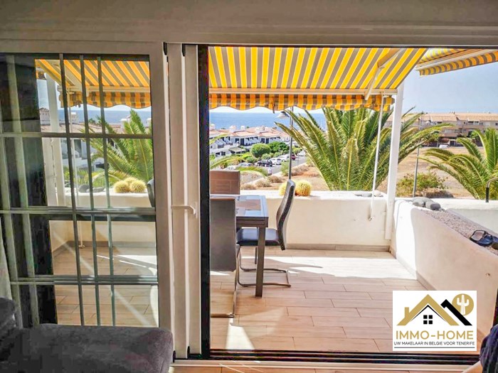 De woonkamer geeft uit op het zonovergoten terras (10 m2) met uitzicht op de zee. (incl zonneluifel)