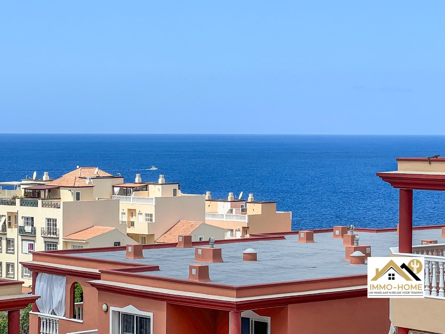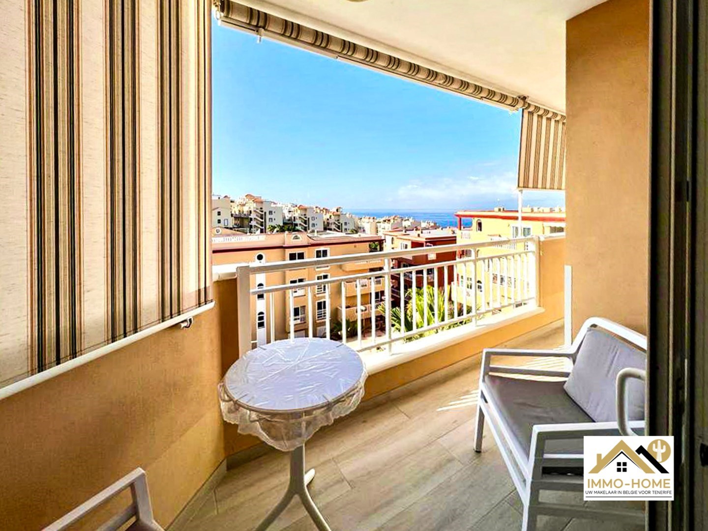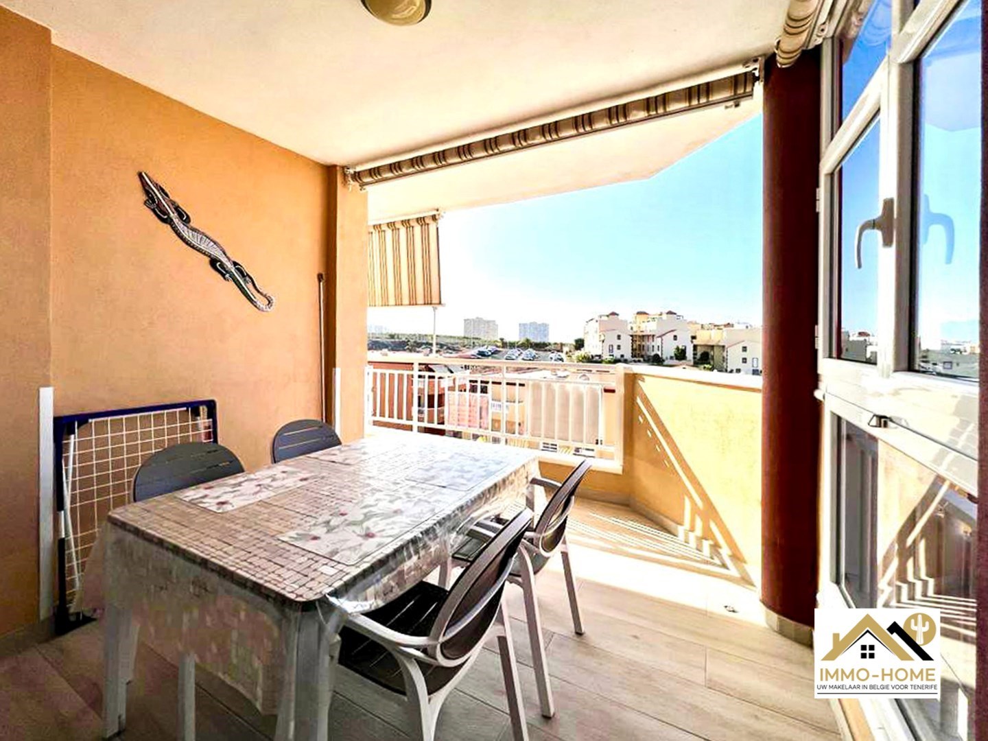 Het mooie terras (met zeezicht en zicht op La Gomera) loopt rondom door en is te bereiken via 3 grote schuiframen. Het overdekt gedeelte kan volledig afgesloten worden.