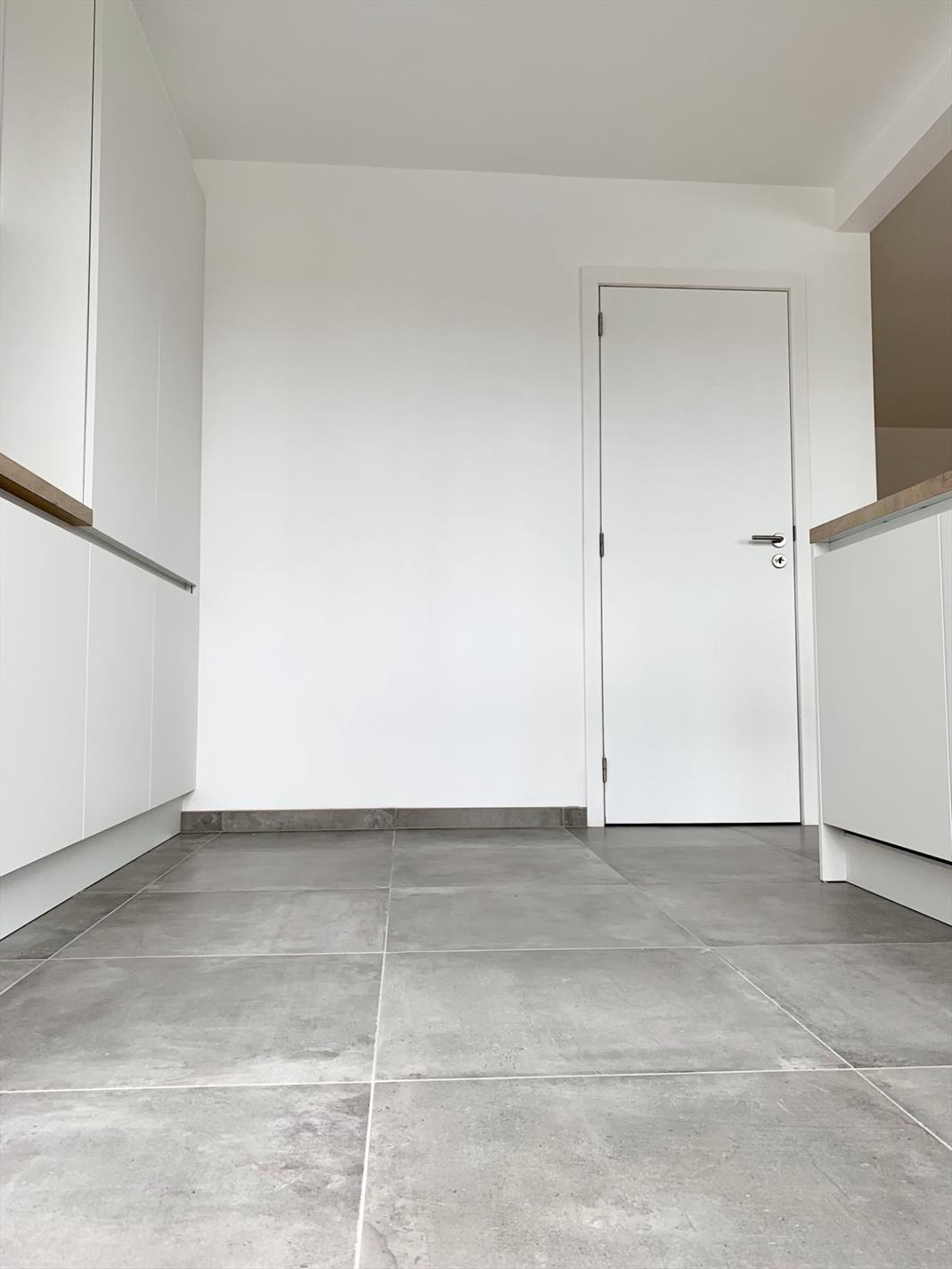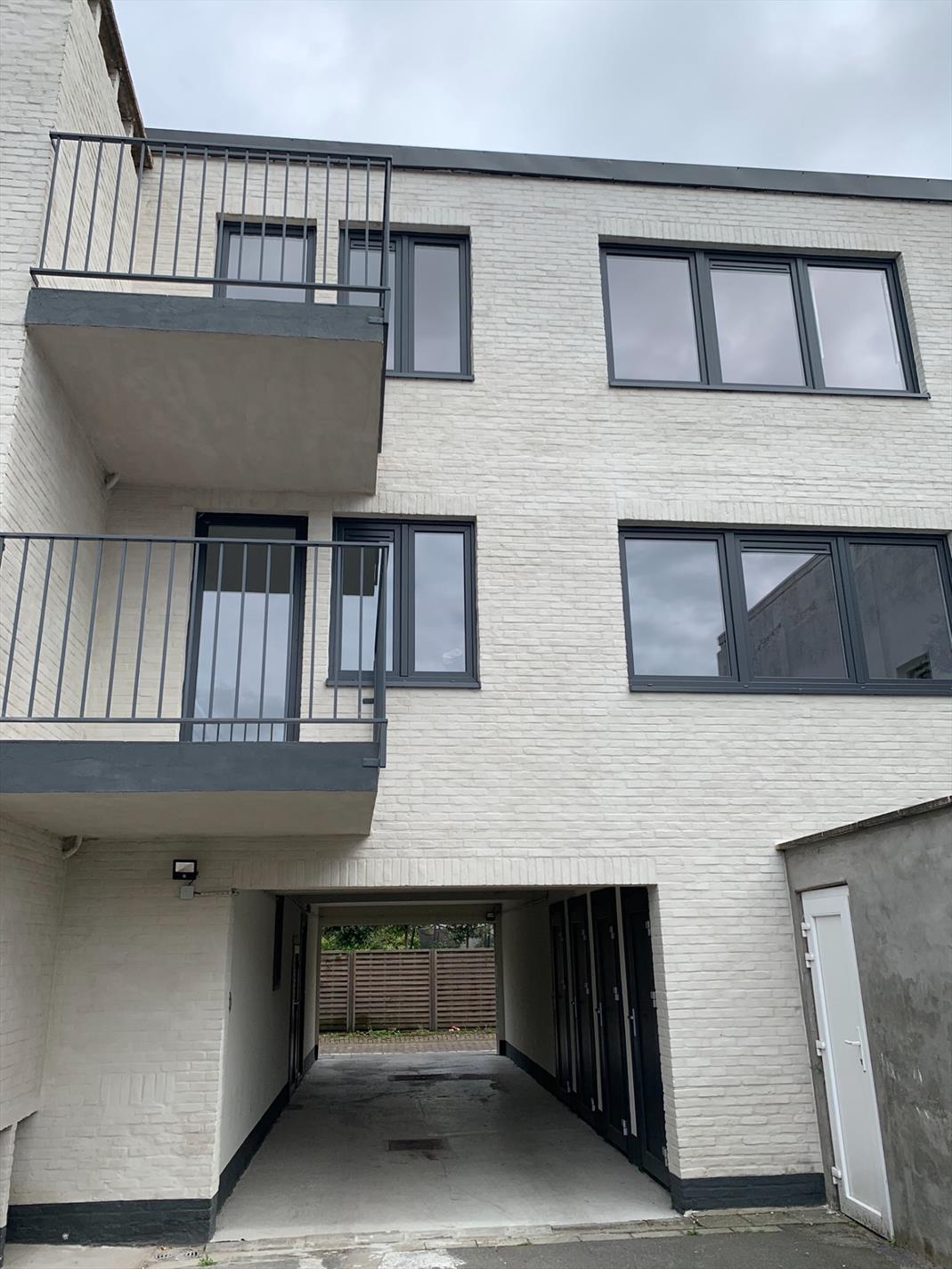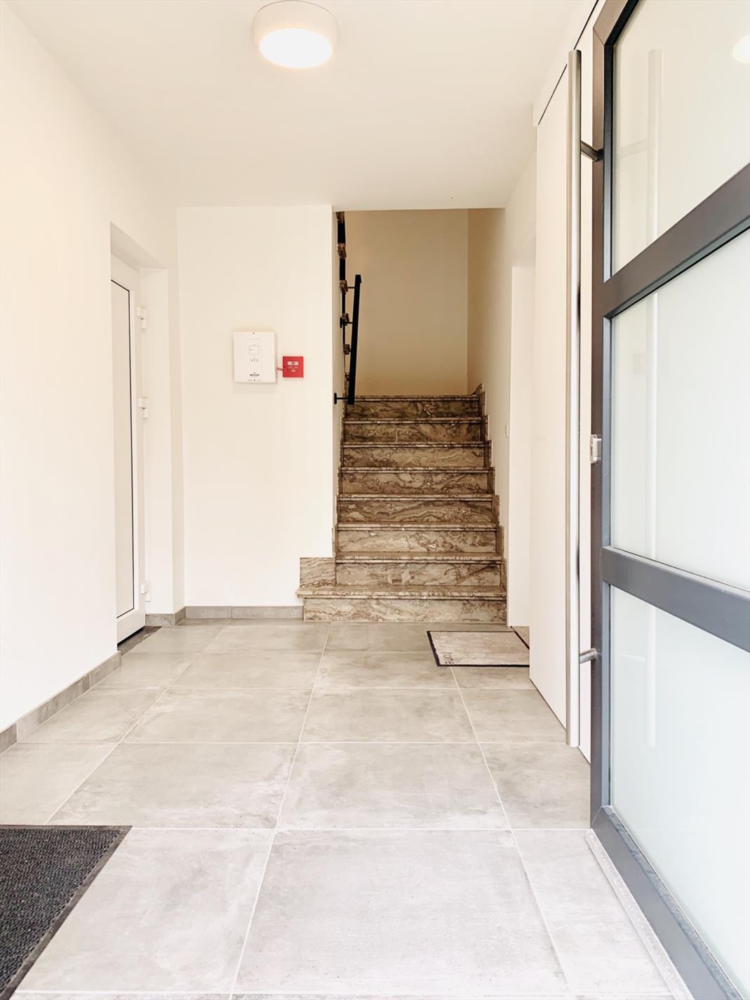Vanaf de ruime inkomhal zal u de bewust gekozen strakheid ervaren. Eenvoud siert en is voor ieder interieur geschikt. De zwarte, matte metalen trapleuningen begeleiden u naar de tweede verdieping. Alle materialen die gebruikt werden in het appartement zijn van hoogwaardige kwaliteit. De antraciet grijze vloeren lopen overal door tot in het appartement. Het appartement is zeer praktisch ingedeeld. Bij het binnenkomen heeft u rechts de prachtige badkamer met inloopdouche, lavabo meubel, toilet en handdoekdroger. Aan de linkse zijde zijn er 2 gelijke grote slaapkamers. De grootste troef is de enorm lichtrijke woonkamer met zijn kwaliteitsvolle parket en moderne open keuken incl. alle nodige toestellen. Aansluitend is er een zeer gezellig terrasje. Er zijn 2 bergingen, 1 aan de keuken en 1 op het gelijkvloers (mee aan te kopen), ook mogelijkheid tot aankoop van garage. Berging €4850, garage €18900 (10% registratie)