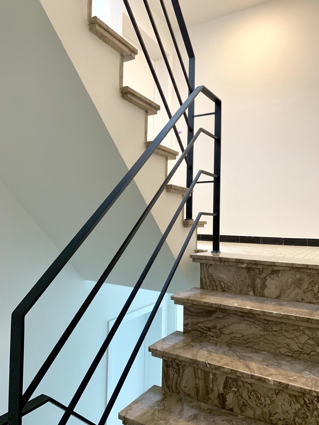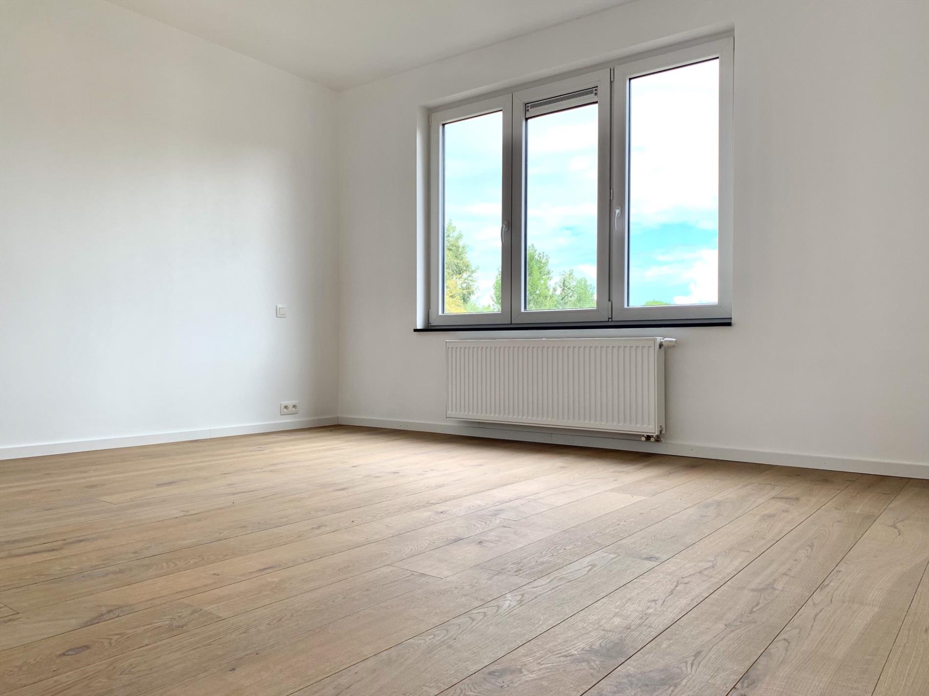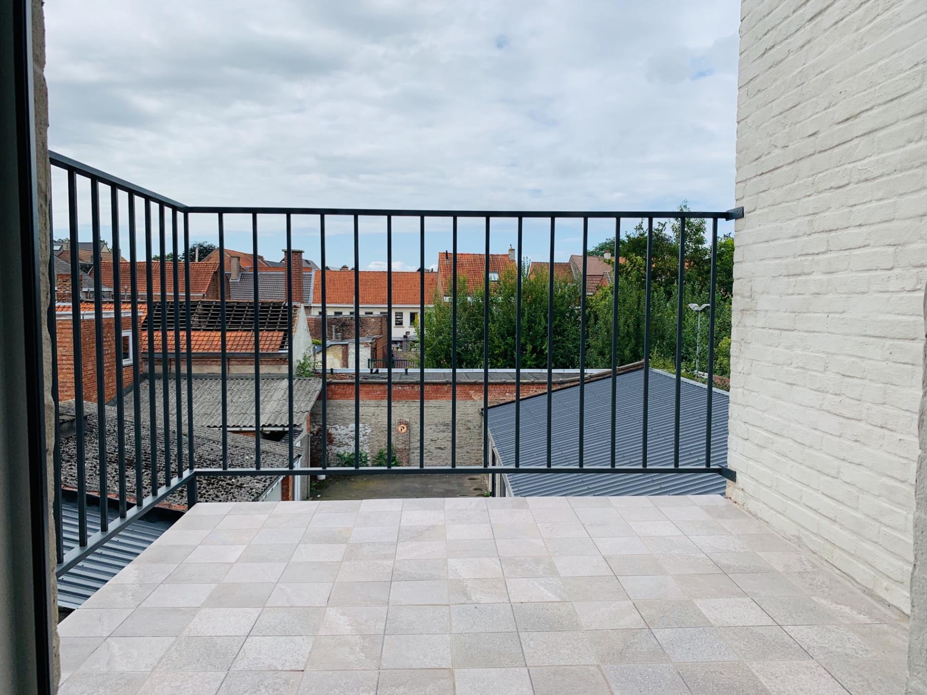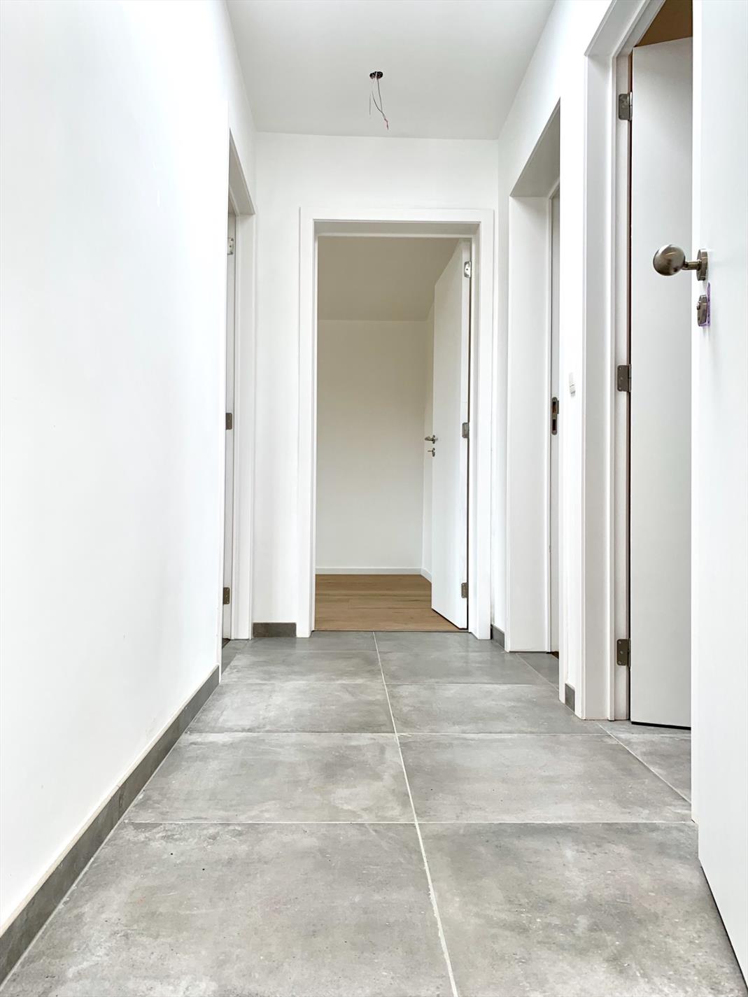 Vanaf de ruime inkomhal zal u de bewust gekozen strakheid ervaren. Eenvoud siert en is voor ieder interieur geschikt. De zwarte, matte metalen trapleuningen begeleiden u naar de tweede verdieping. Alle materialen die gebruikt werden in het appartement zijn van hoogwaardige kwaliteit. De antraciet grijze vloeren lopen overal door tot in het appartement. Het appartement is zeer praktisch ingedeeld. Bij het binnenkomen heeft u rechts de prachtige badkamer met inloopdouche, lavabo meubel, toilet en handdoekdroger. Aan de linkse zijde zijn er 2 gelijke grote slaapkamers. De grootste troef is de enorm lichtrijke woonkamer met zijn kwaliteitsvolle parket en moderne open keuken incl. alle nodige toestellen. Aansluitend is er een zeer gezellig terrasje. Er zijn 2 bergingen, 1 aan de keuken en 1 op het gelijkvloers (mee aan te kopen), ook mogelijkheid tot aankoop van garage. Berging €4850, garage €18900 (10% registratie)