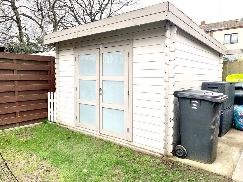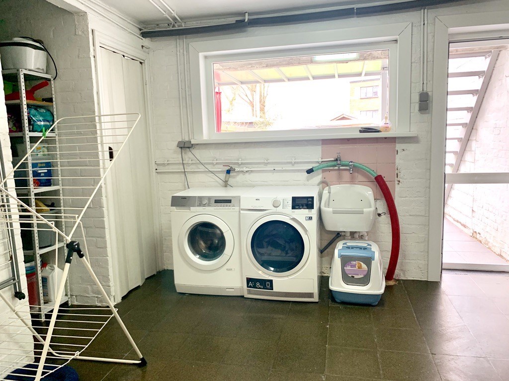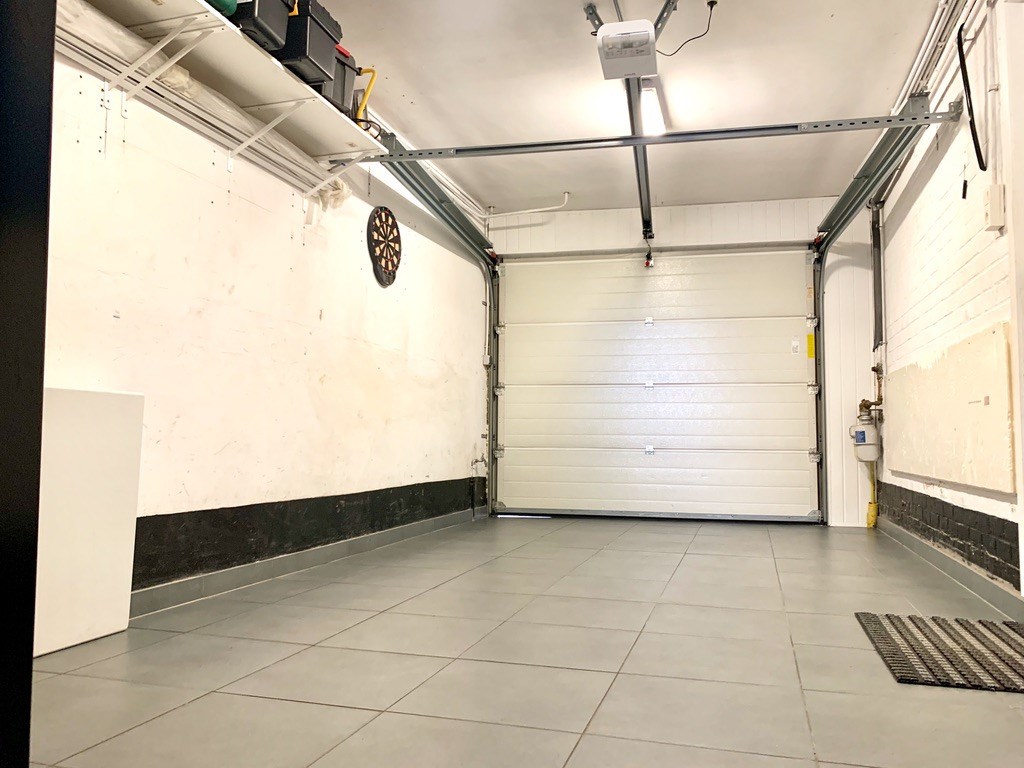 De garage is aangebouwd en is voorzien van een elektrische poort. Daarachter bevinden zich nog een gastentoilet en wasplaats/berging. Van hieruit kan u ook naar de zuid-west gerichte tuin. Het aangelegde terras beneden ligt onder het terras van de eerste verdieping. Achteraan in de tuin staat een modern tuinhuisje.