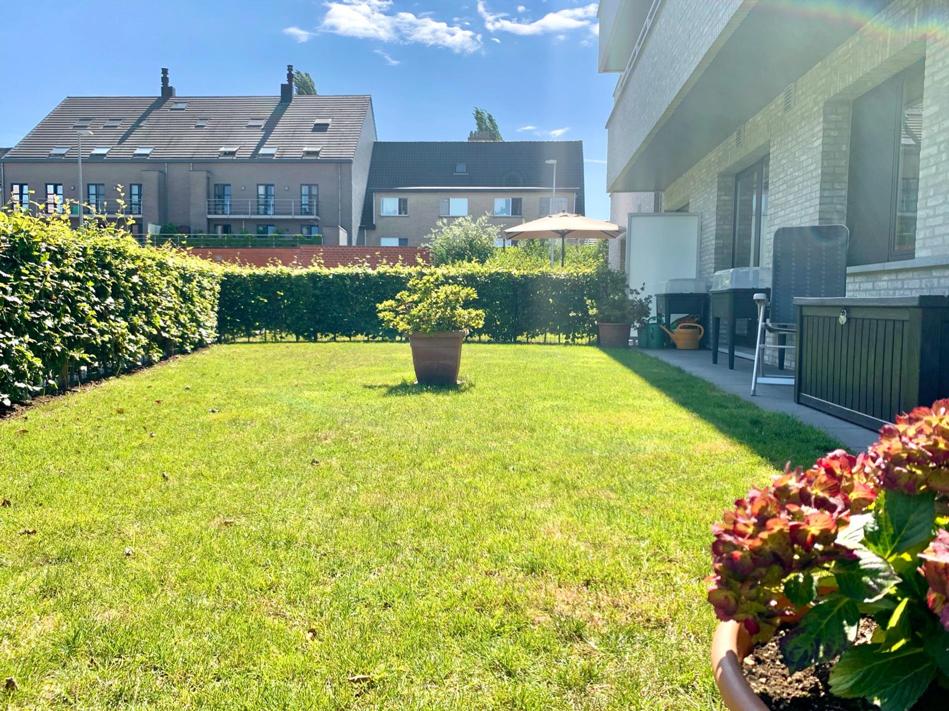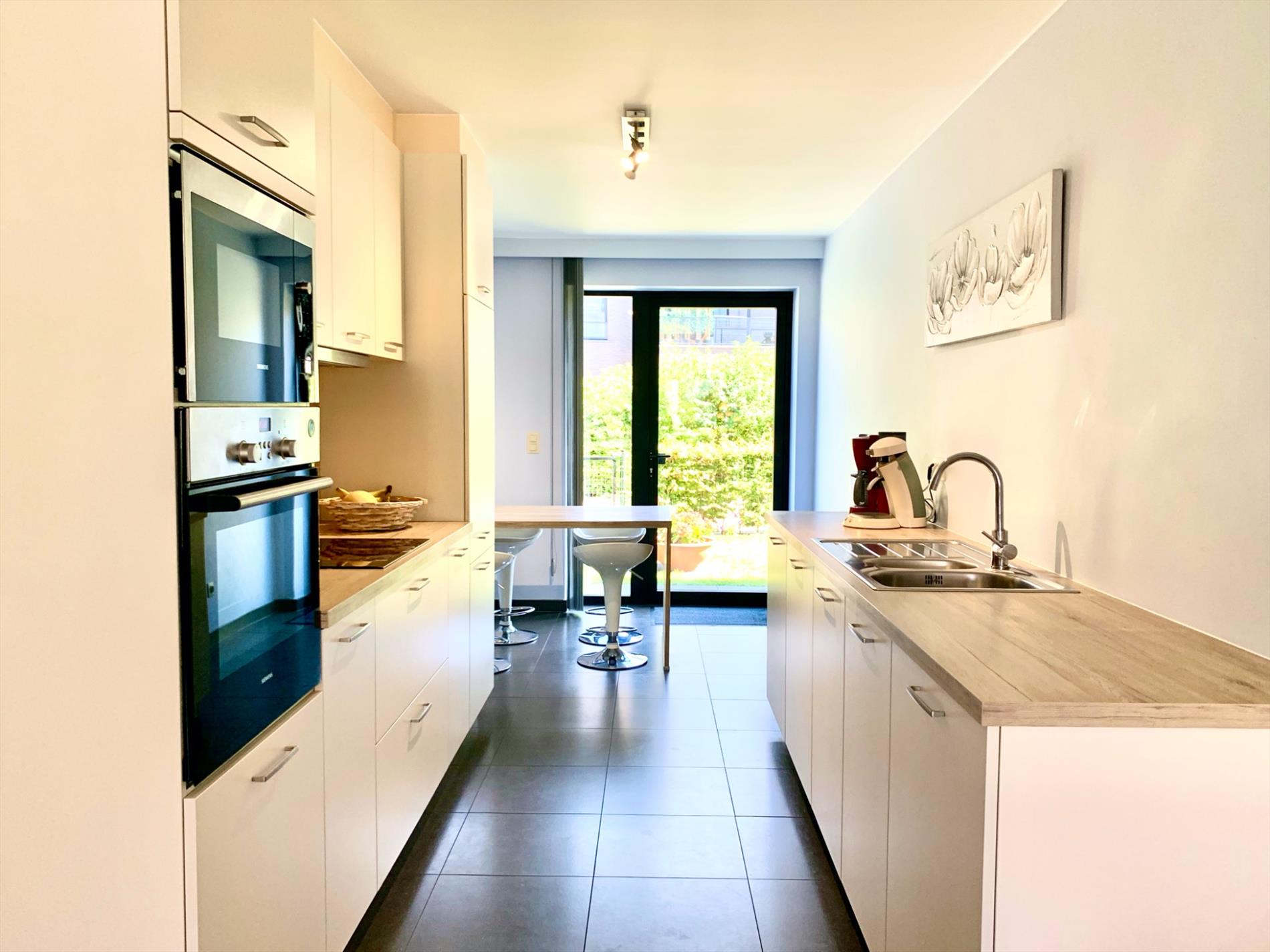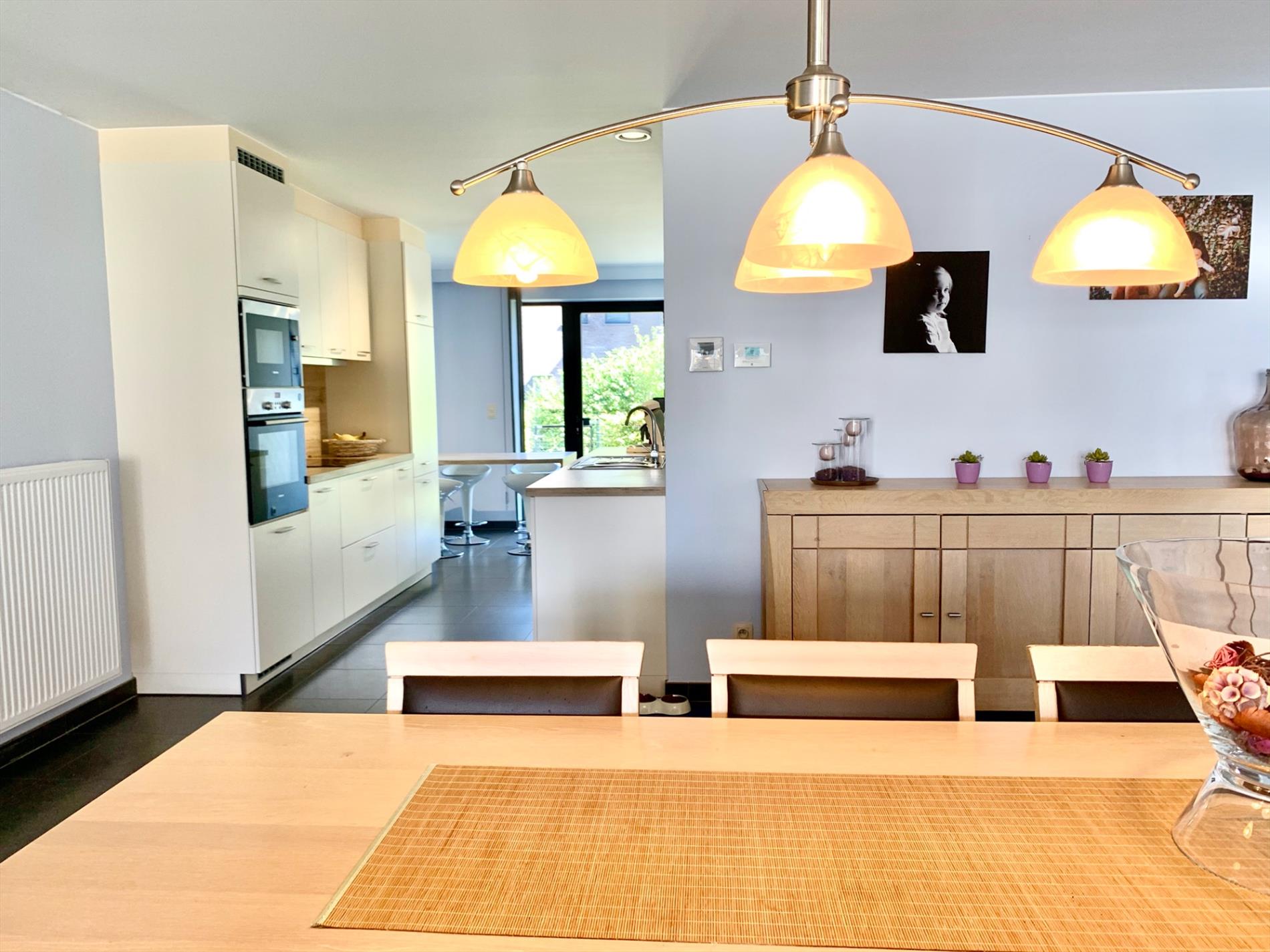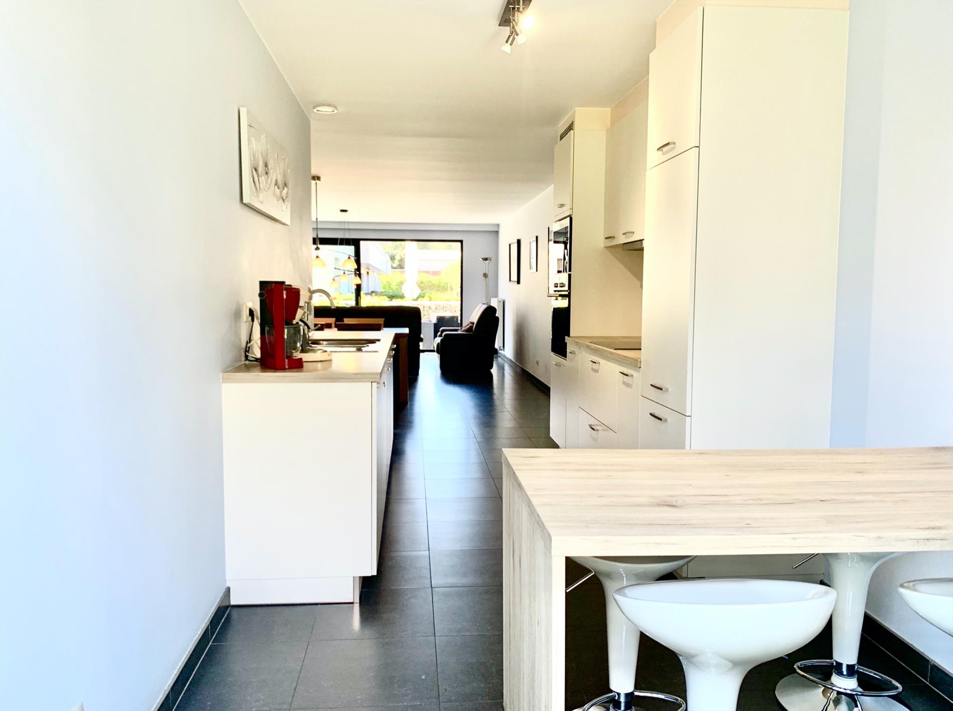 De open keuken incl alle nodige toestellen is ook voorzien van een bijhorende eettafel. Van hieruit gaat u naar de achtertuin met afgesloten haag en tuinpoortje.