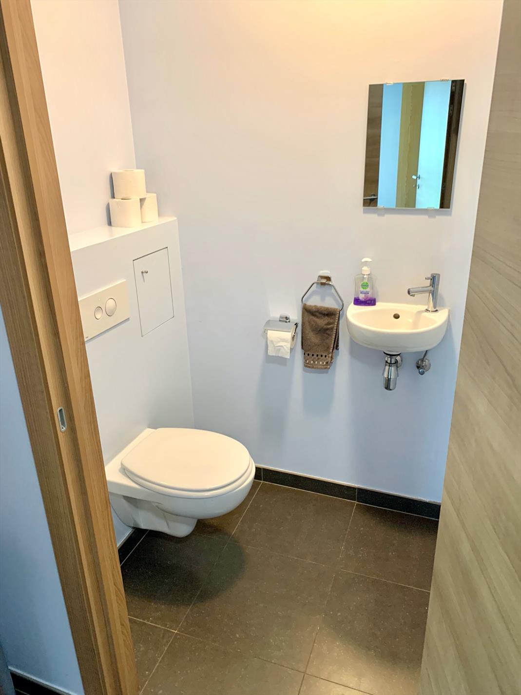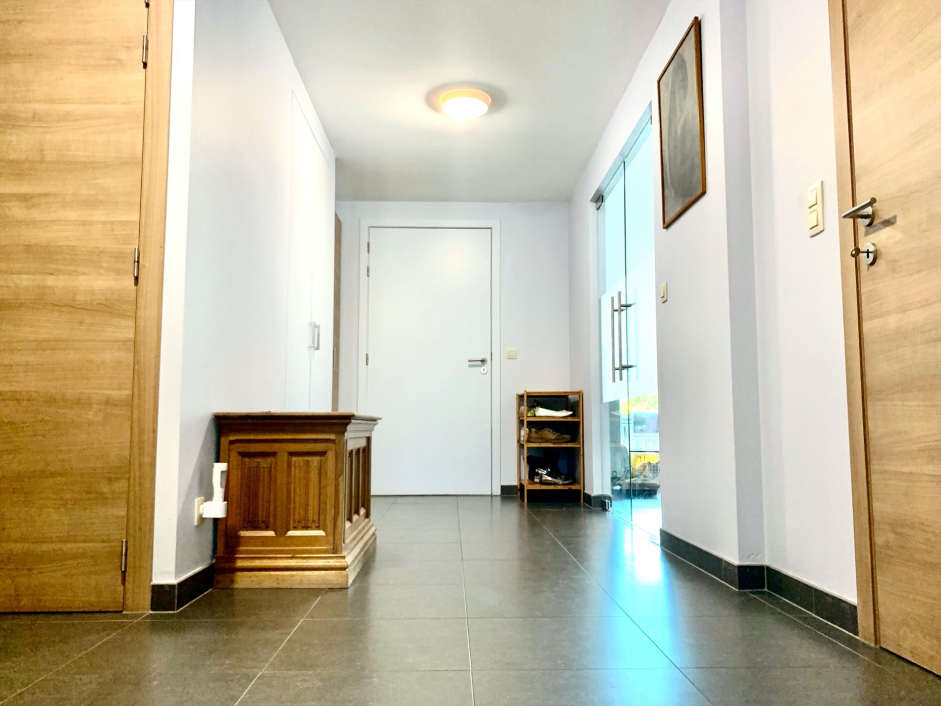 Via de gemeenschappelijke inkomhal komt u aan dit prachtig appartement. De inkomhal is vrij ruim en voorzien van ingemaakte kasten, gastentoilet en wasplaats/berging. Via de dubbele glazen deur loopt u de volumineuze en lichtrijke woonkamer in, deze is voorzien van 2 schuiframen. Aanpalend is er een bureauruimte met aparte ingang. (Kan afgesloten worden) Vanuit de woonkamer kan u naar het eerste zonneterras met klein tuintje.