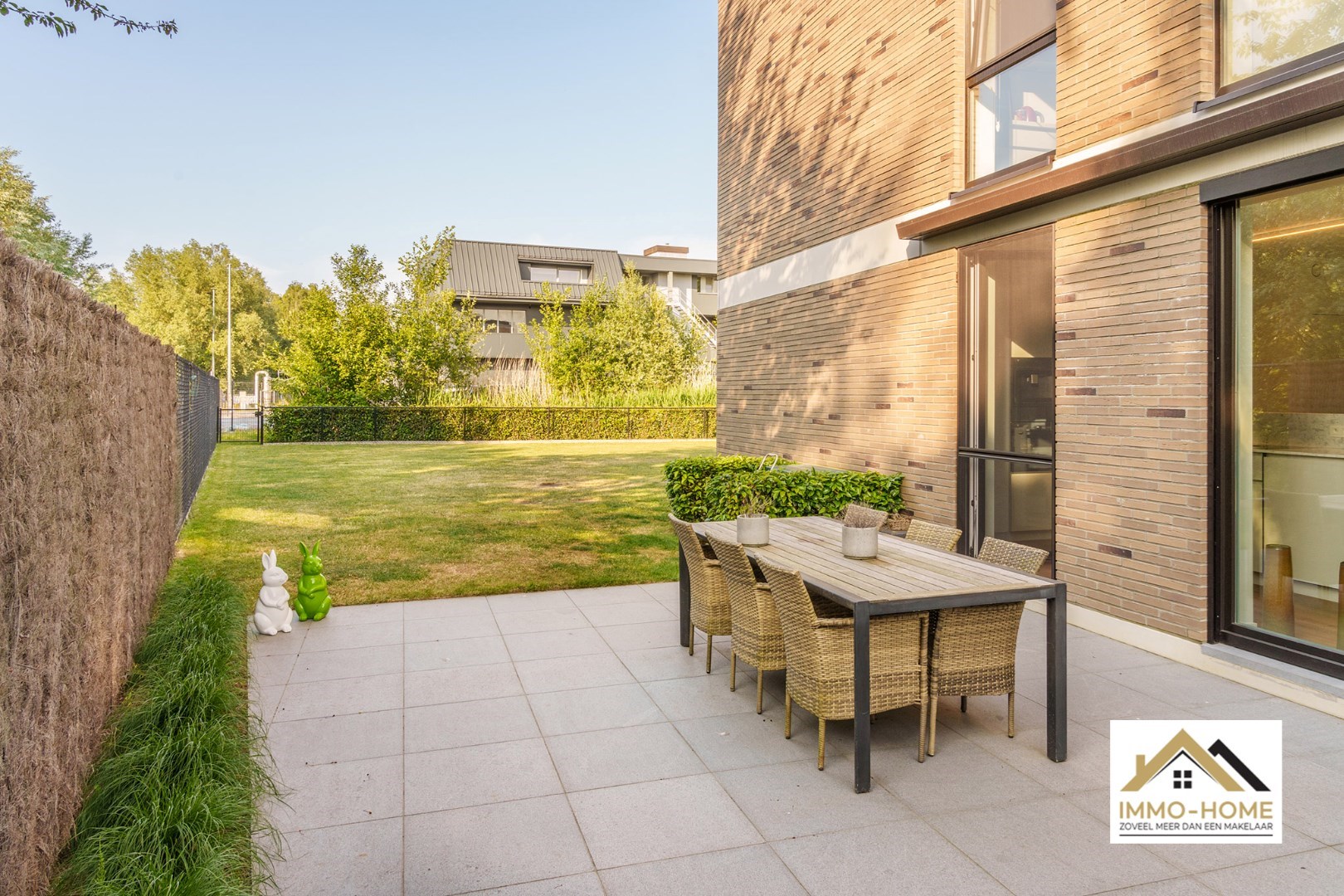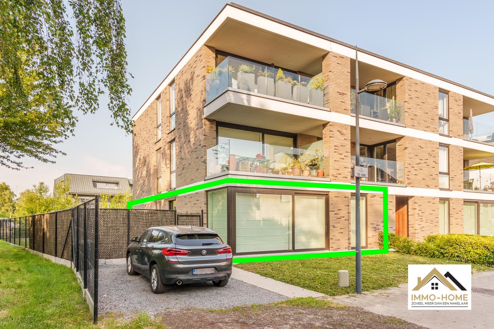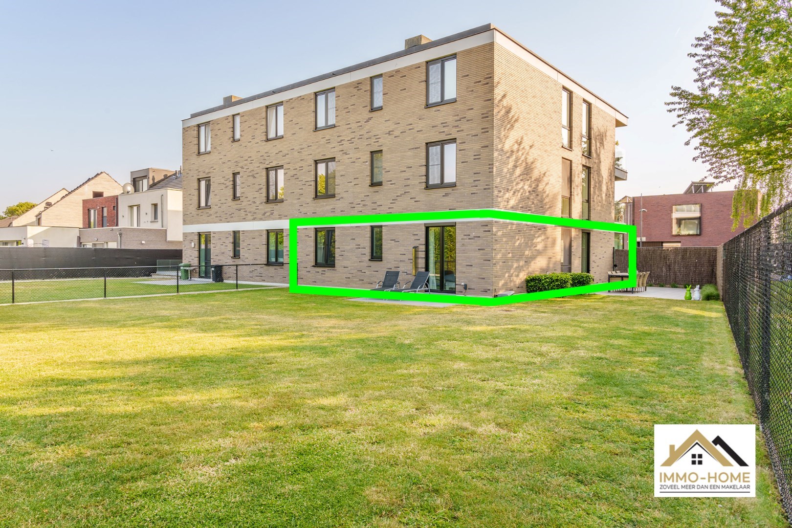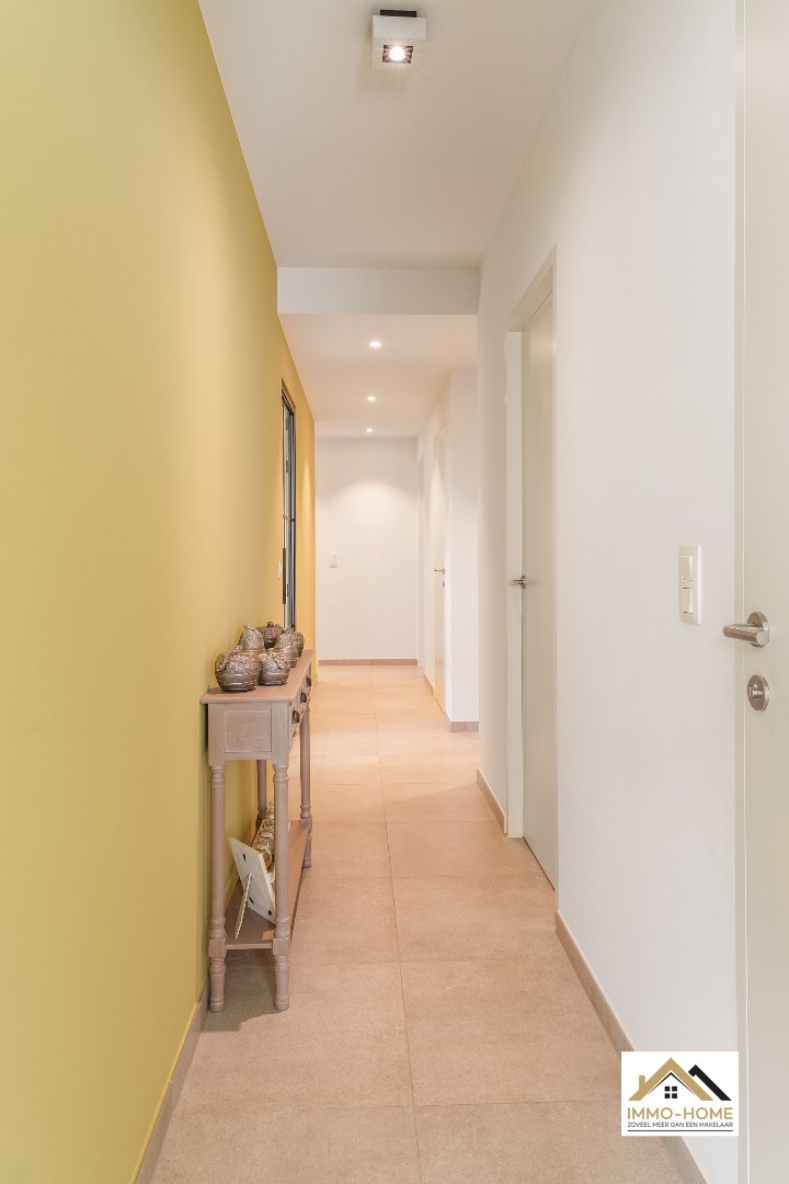 Schrijf u inDit gelijkvloerse appartement is onderdeel van een gloednieuw complex, dat ligt op het einde van een doodlopende straat, én met veel groen naast de deur. Via de statige centrale hal kom je in je eigen inkomhal, waar een vestiaire met ingemaakte kasten is voorzien. De stijlvolle zwartmetalen glazen deur brengt je naar de prachtige leefruimte, die door de vele grote raampartijen bijzonder lichtrijk is. De open keuken is voorzien van een kookeiland en alle hypermodern comfort. Aanpalend aan de leefruimte is er een mooie bureelruimte aanwezig. Via de centrale gang van het appartement kom je in de twee ruime slaapkamers, de twee badkamers, het gastentoilet en een handige berging. Je beschikt bovendien over een grote tuin met leuk terras, en twee autostaanplaatsen (één vooraan naast het gebouw, en een ondergrondse). Dit is een instelprijs. Inschrijvingen via mail naar tommy@immo-home.be, geen telefonische inschrijvingen! Volg ons op Fb en insta. Voor meer info: www.immo-home.be