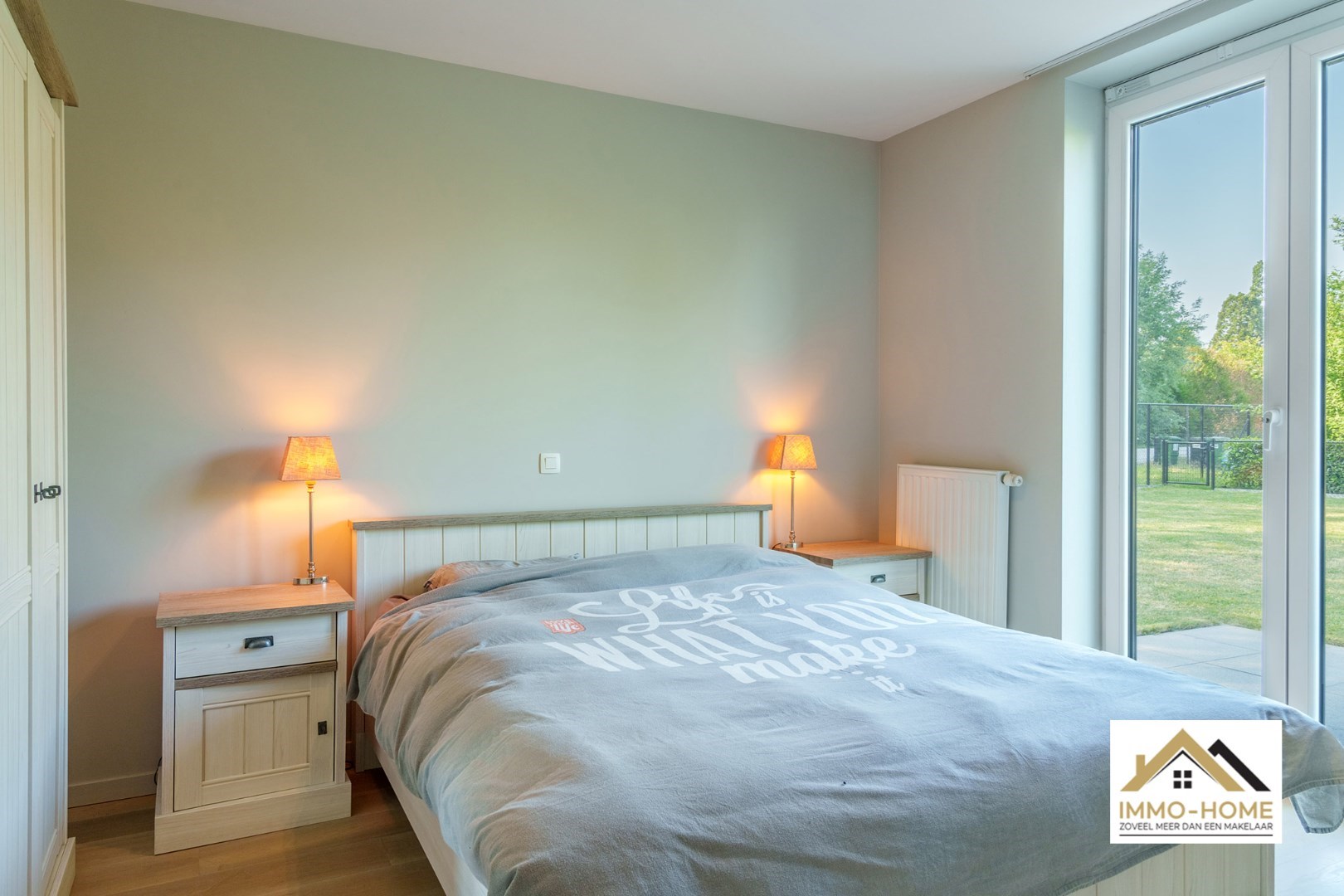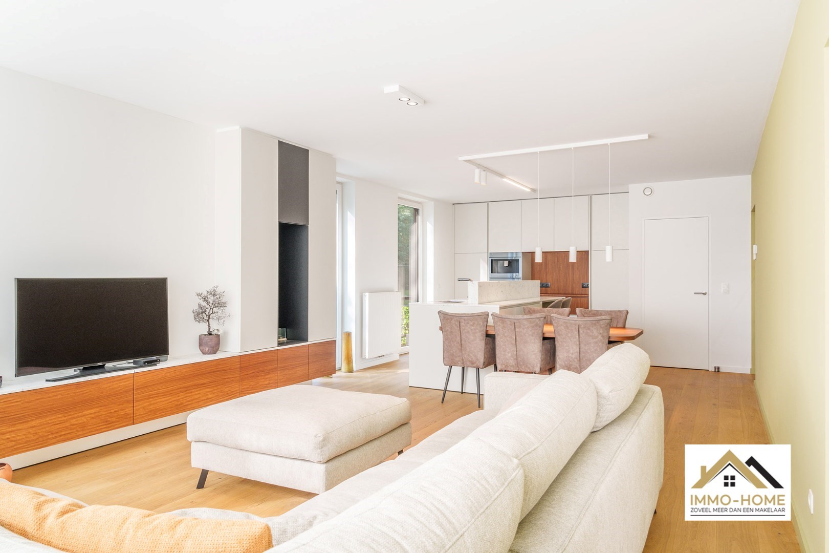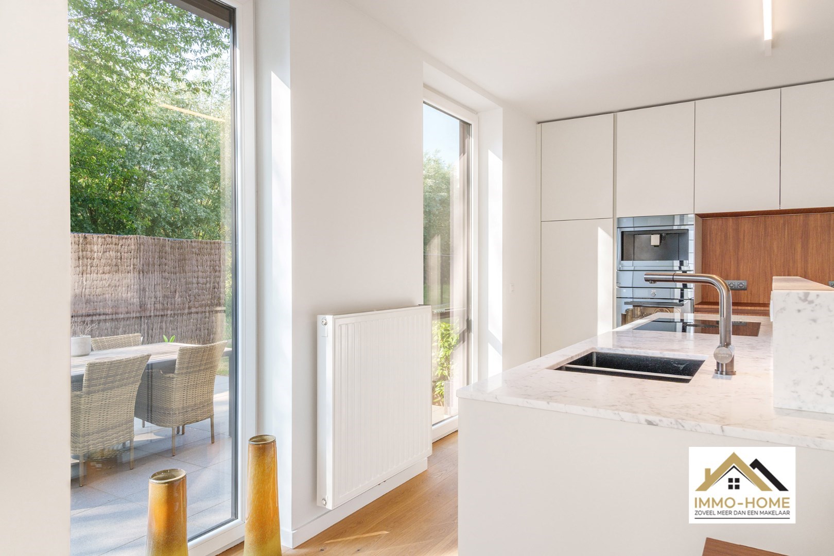 Schrijf u inDit gelijkvloerse appartement is onderdeel van een gloednieuw complex, dat ligt op het einde van een doodlopende straat, én met veel groen naast de deur. Via de statige centrale hal kom je in je eigen inkomhal, waar een vestiaire met ingemaakte kasten is voorzien. De stijlvolle zwartmetalen glazen deur brengt je naar de prachtige leefruimte, die door de vele grote raampartijen bijzonder lichtrijk is. De open keuken is voorzien van een kookeiland en alle hypermodern comfort. Aanpalend aan de leefruimte is er een mooie bureelruimte aanwezig. Via de centrale gang van het appartement kom je in de twee ruime slaapkamers, de twee badkamers, het gastentoilet en een handige berging. Je beschikt bovendien over een grote tuin met leuk terras, en twee autostaanplaatsen (één vooraan naast het gebouw, en een ondergrondse). Dit is een instelprijs. Inschrijvingen via mail naar tommy@immo-home.be, geen telefonische inschrijvingen! Volg ons op Fb en insta. Voor meer info: www.immo-home.be