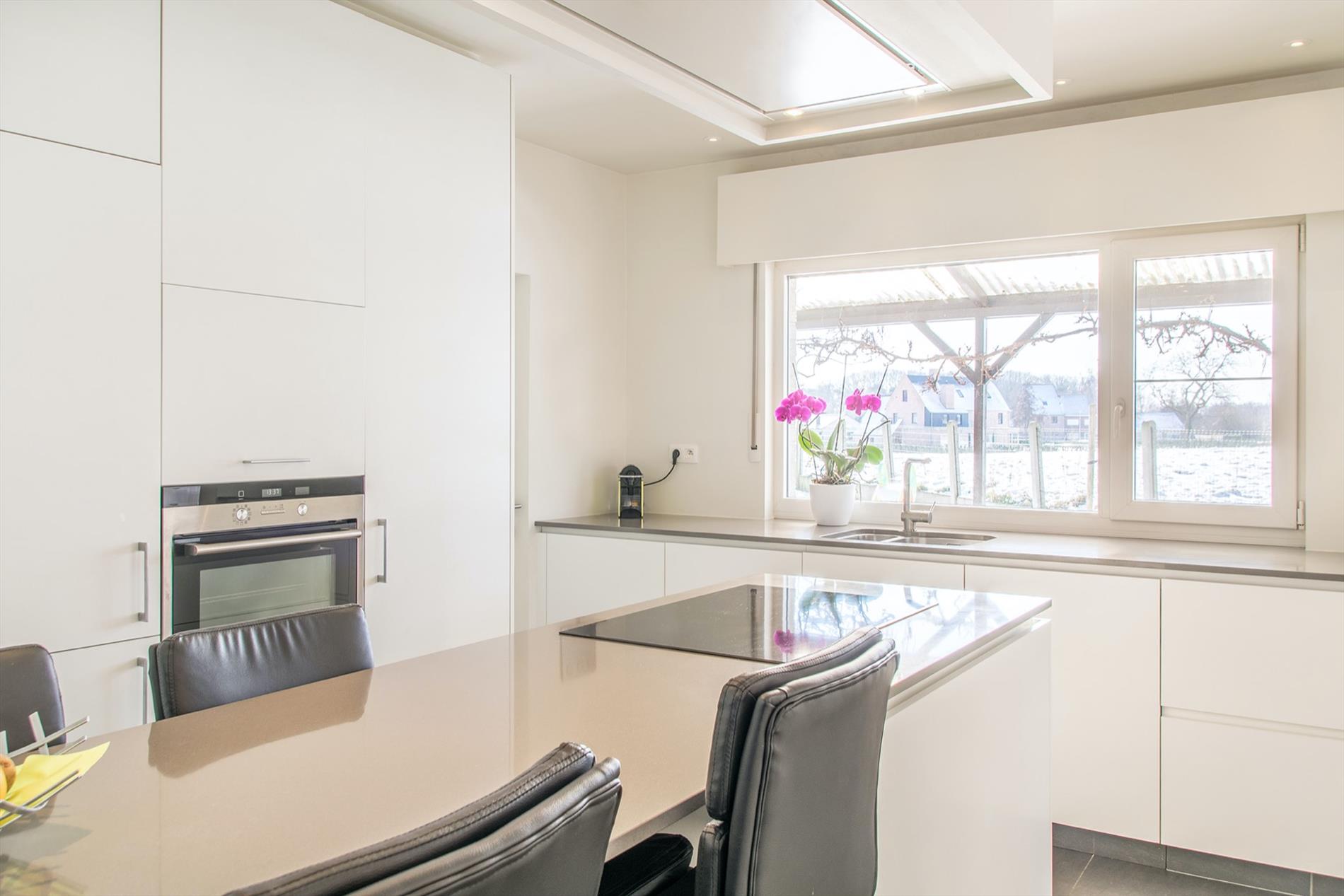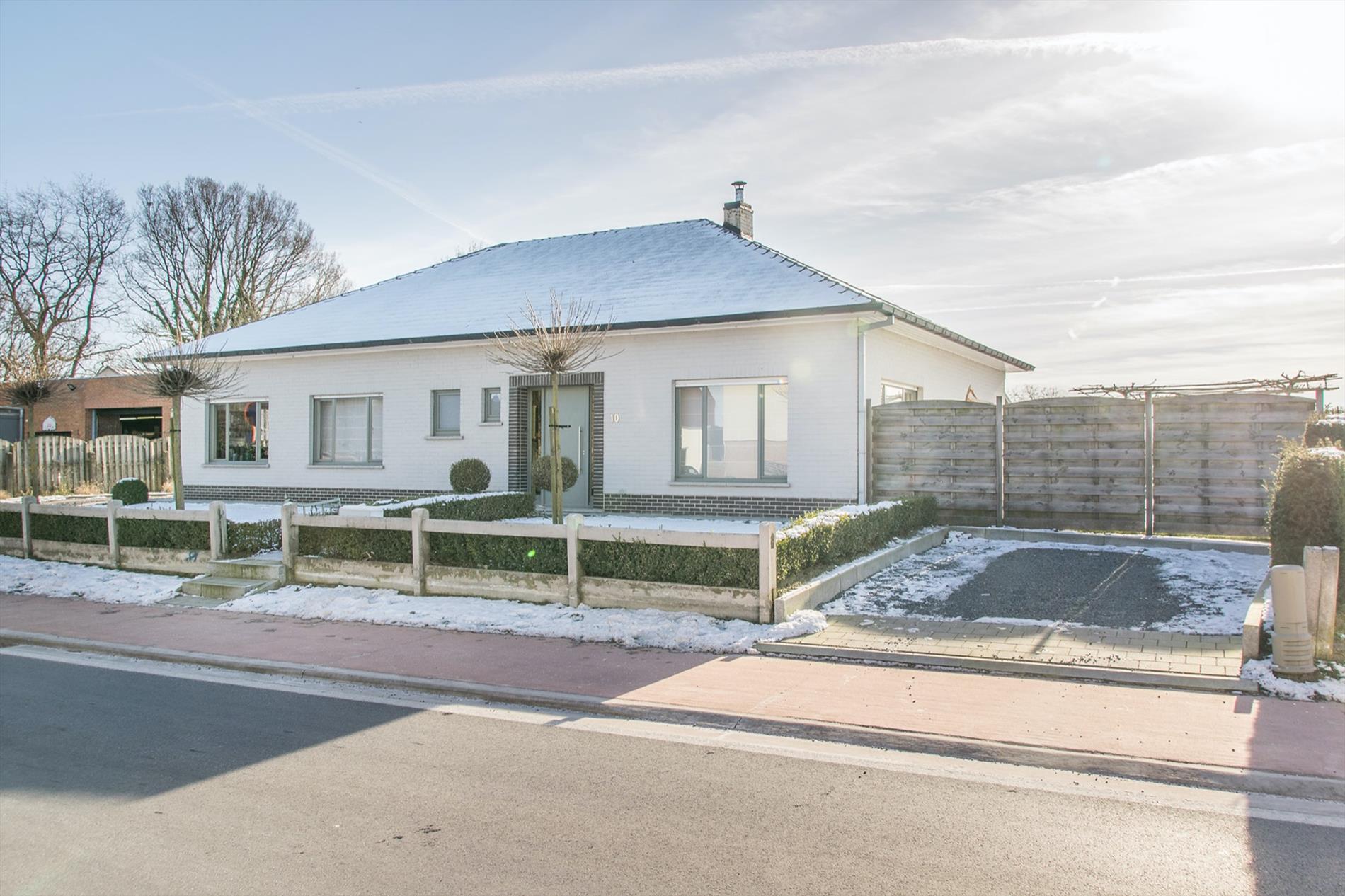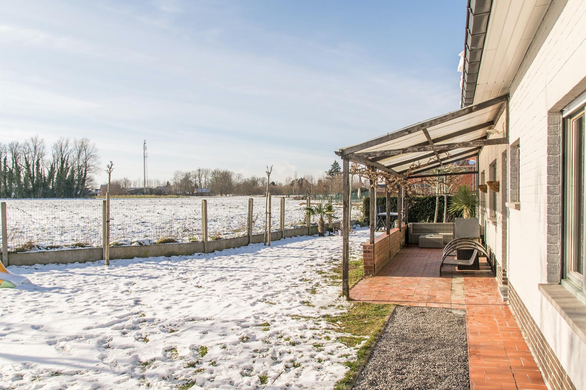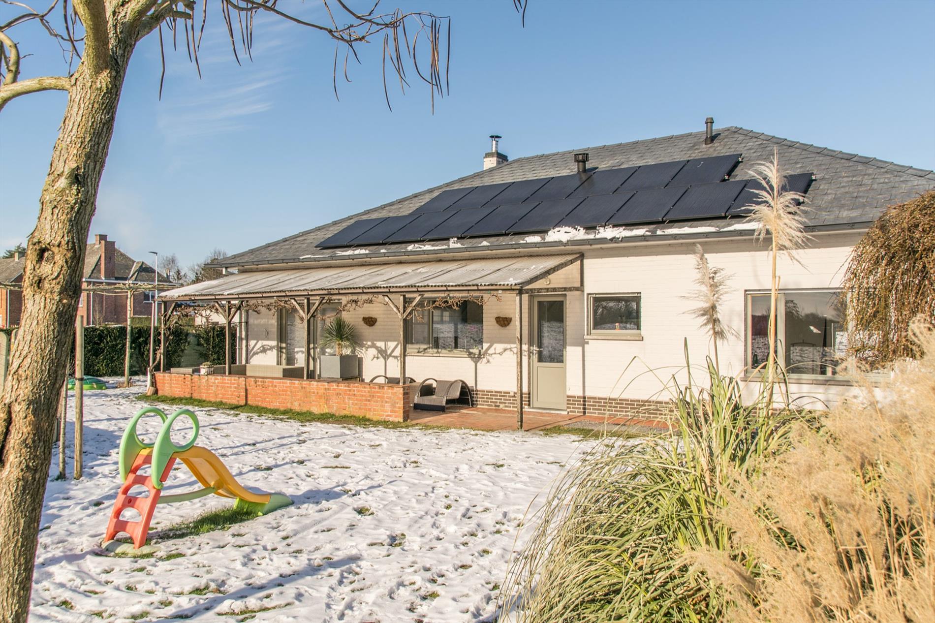Op zoek naar een instapklare, zuid-gerichte ruime woning mét uitzicht op de velden ? Dan is deze bungalow misschien wel iets voor jou ! De grote inkomhal (met gastentoilet) vormt de centrale as in de woning, deze verbindt alle ruimtes. Te beginnen met de zeer mooie, open leefruimte, die baadt in het licht met grote ramen rondom en een gezellige houthaard. Aansluitend bevindt zich de nieuwe strakke open keuken met kookeiland, die voorzien is van alle comfort en mét een magistraal uitzicht als kers op de taart (dit is landbouwgebied, hier kan dus nooit op gebouwd worden) ! Via een handige bergruimte kom je in de tuin, waar een gezellig terras zeker uitnodigt om veel van de buitenlucht te genieten. Verder in de woning bevinden zich nog een badkamer met wellness-allures met de met keien beklede wanden, inclusief grote inloopdouche met regendouche en aanpalend ook 3 zeer ruime slaapkamers. De derde kamer is momenteel ingericht als bureel. Mocht dit nog niet volstaan, er is op de zolder ruimte om ongeveer 60 m² extra woonoppervlakte te creëren. Tot slot is er nog een vrijstaande garage met extra bergruimte, en er liggen maar liefst 17 zonnepanelen op het zuidgerichte dak.
