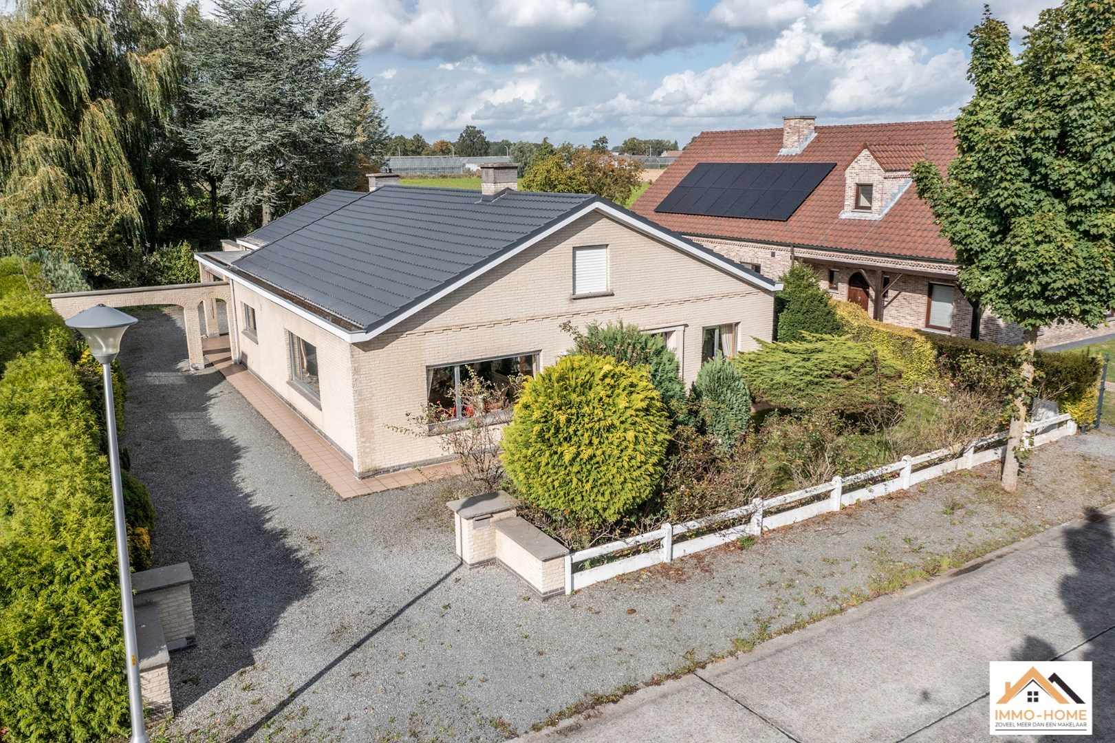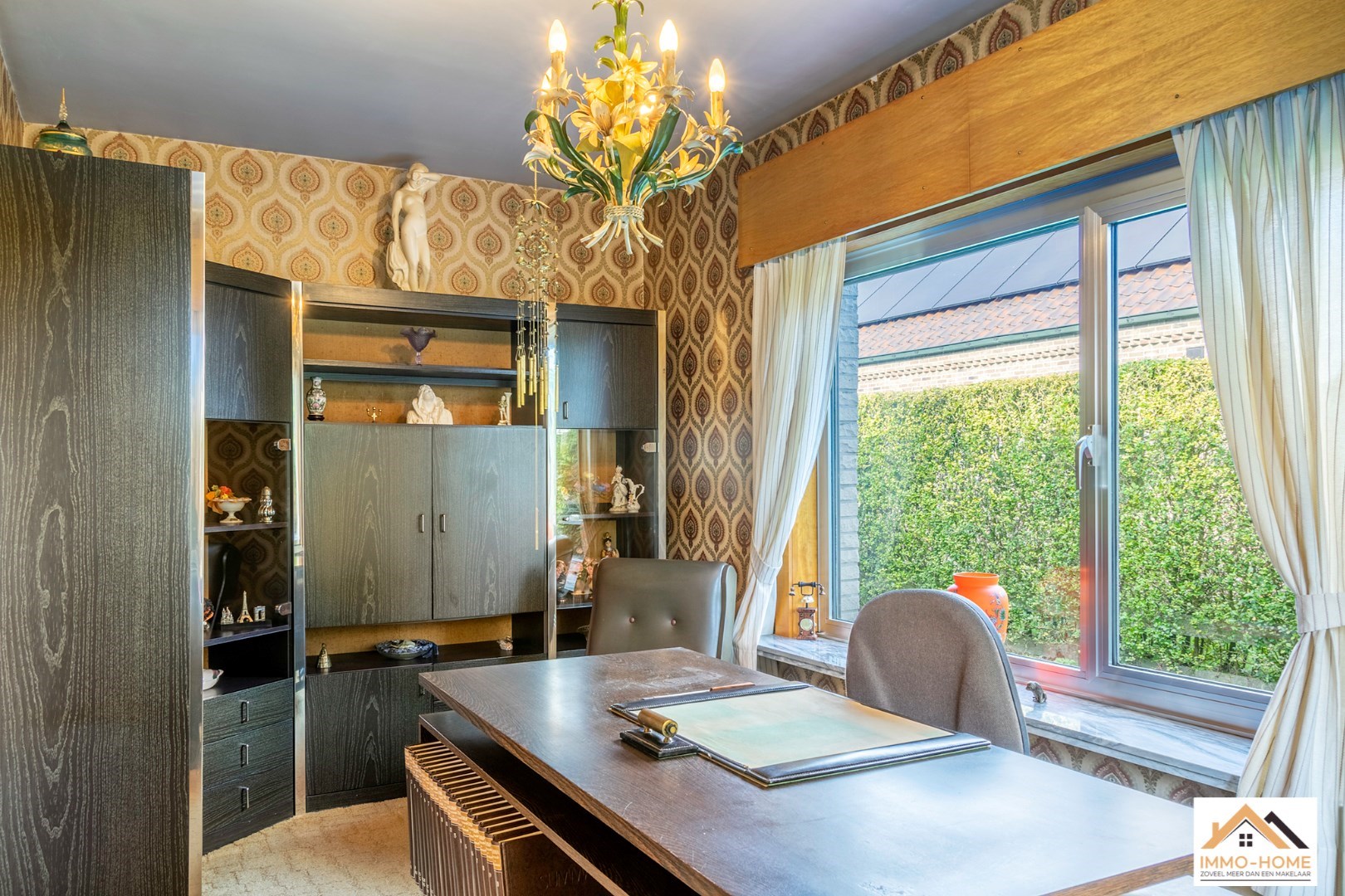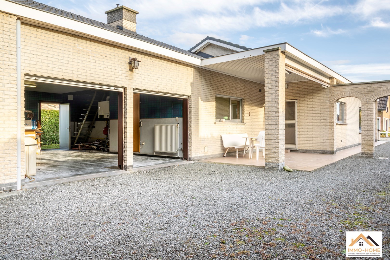 Schrijf u inDeze bungalow met 926m2 grond is bijzonder rustig gelegen in een aangename buitenwijk van Lochristi. De inkomhal en de gang vormen de centrale as van de woning. Aan één zijde bevindt zich de lichtrijke leefruimte met open haard met daarachter de ruime leefkeuken. Aan de andere kant van de inkomhal (met ingemaakte vestiairekast) bevindt zich vooraan een bureel, en daarachter zijn er twee ruime slaapkamers. Ook het gastentoilet en de grote badkamer bevinden zich hier. Helemaal achteraan de gang is er een koele berging (net naast de keuken) en een ruime wasplaats/bijkeuken. Deze komt tot slot uit in de grote garage met twee automatische poorten. Het terras is bereikbaar vanuit de keuken, en bovenop dit alles is er een ruime zolder met aan de voorzijde van de woning voldoende hoogte om er extra kamers in te voorzien bovenop de solide betonnen gewelven.
