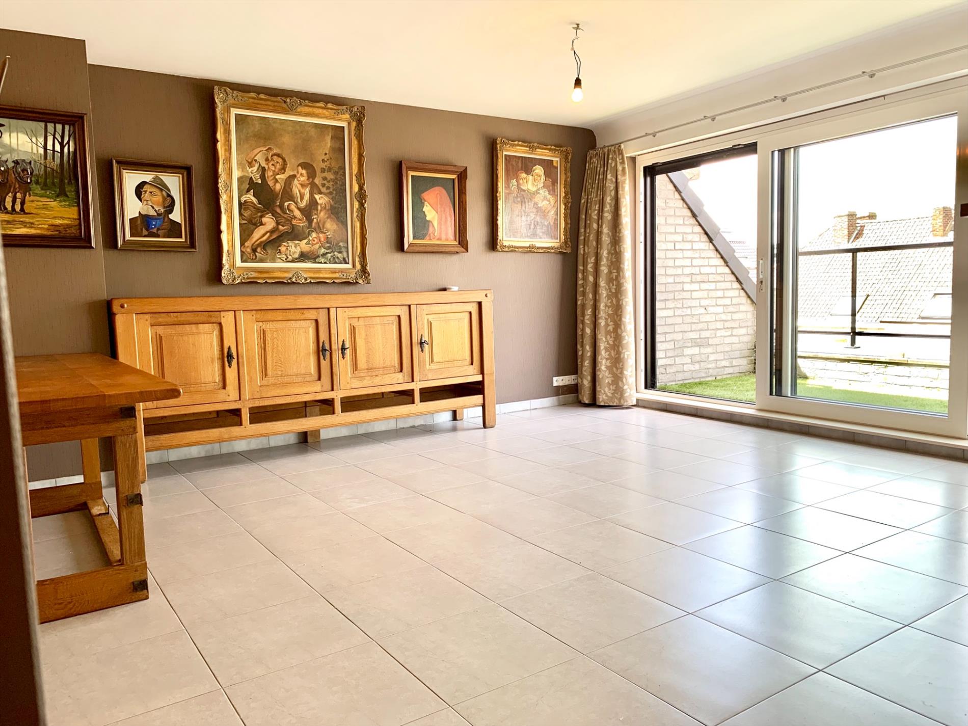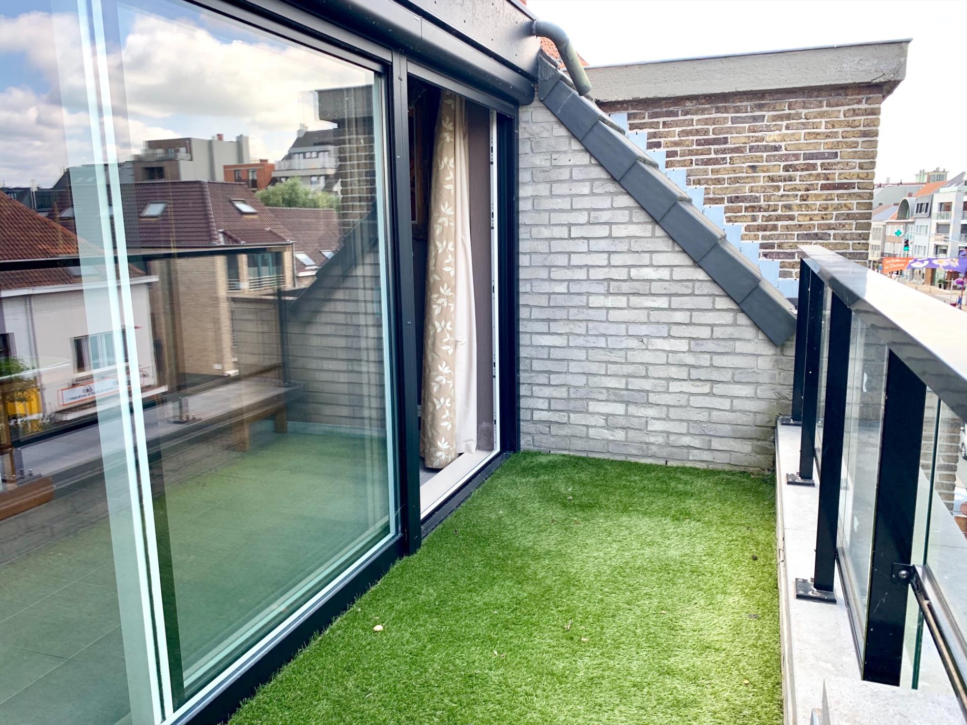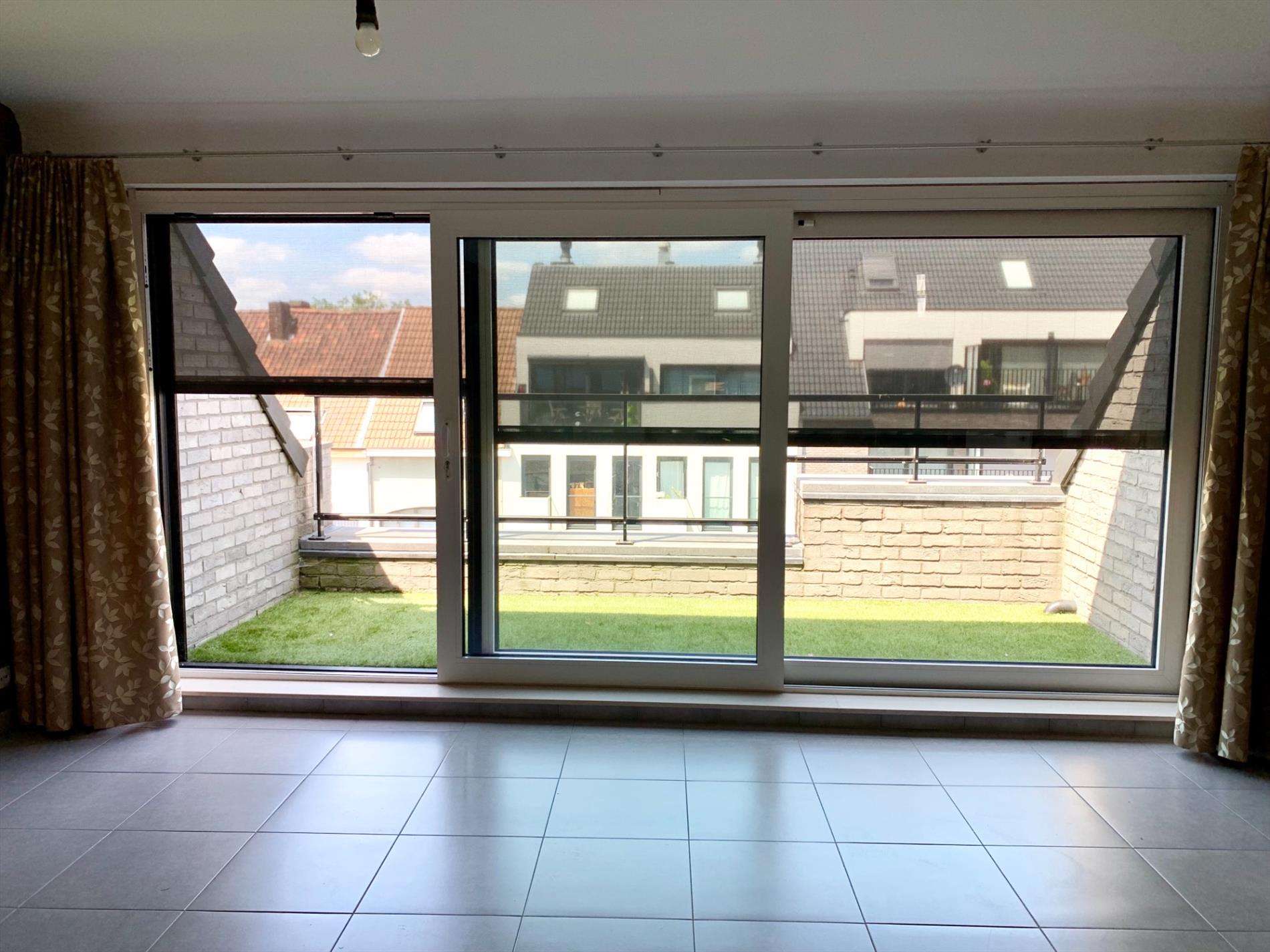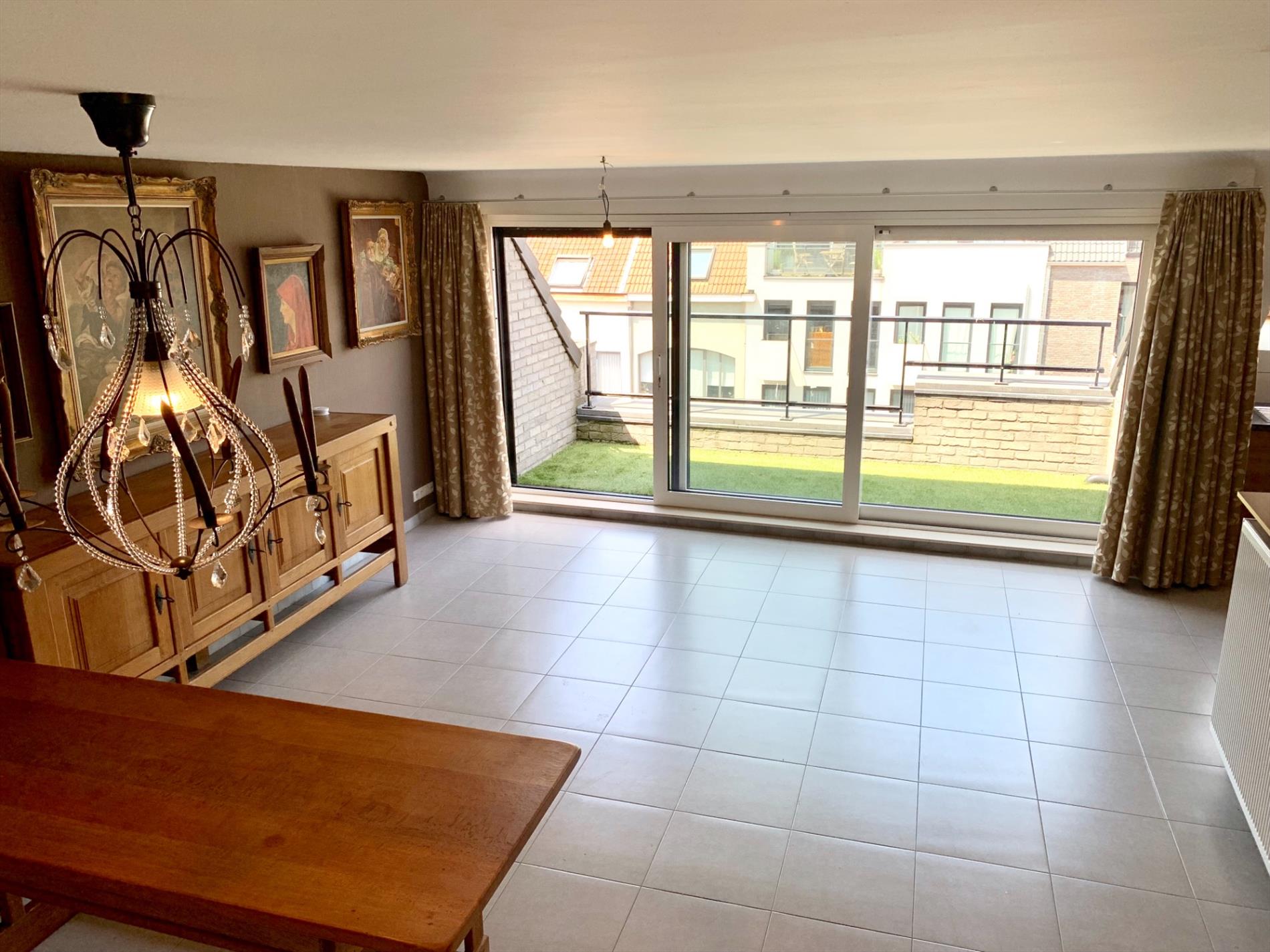 Aan de buitenzijde is al duidelijk te zien dat het om een zeer kwaliteitsvol complex gaat. Via de mooie strakke inkomhal neemt u de lift naar boven. Bij het binnen wandelen in het appartement heeft u direct zicht op het terras door het grote schuifraam. Op het terras ligt een bangkirai houten vloer waar nu een grasmat over ligt maar kan weggenomen worden. In de woonkamer is enorm veel lichtinval, de warmte blijft buiten door de recent geplaatste, automatische screens. Indien deze naar beneden zijn kan u nog steeds naar buiten kijken. Aansluitend is een open keuken met alle nodige toestellen en aparte berging.