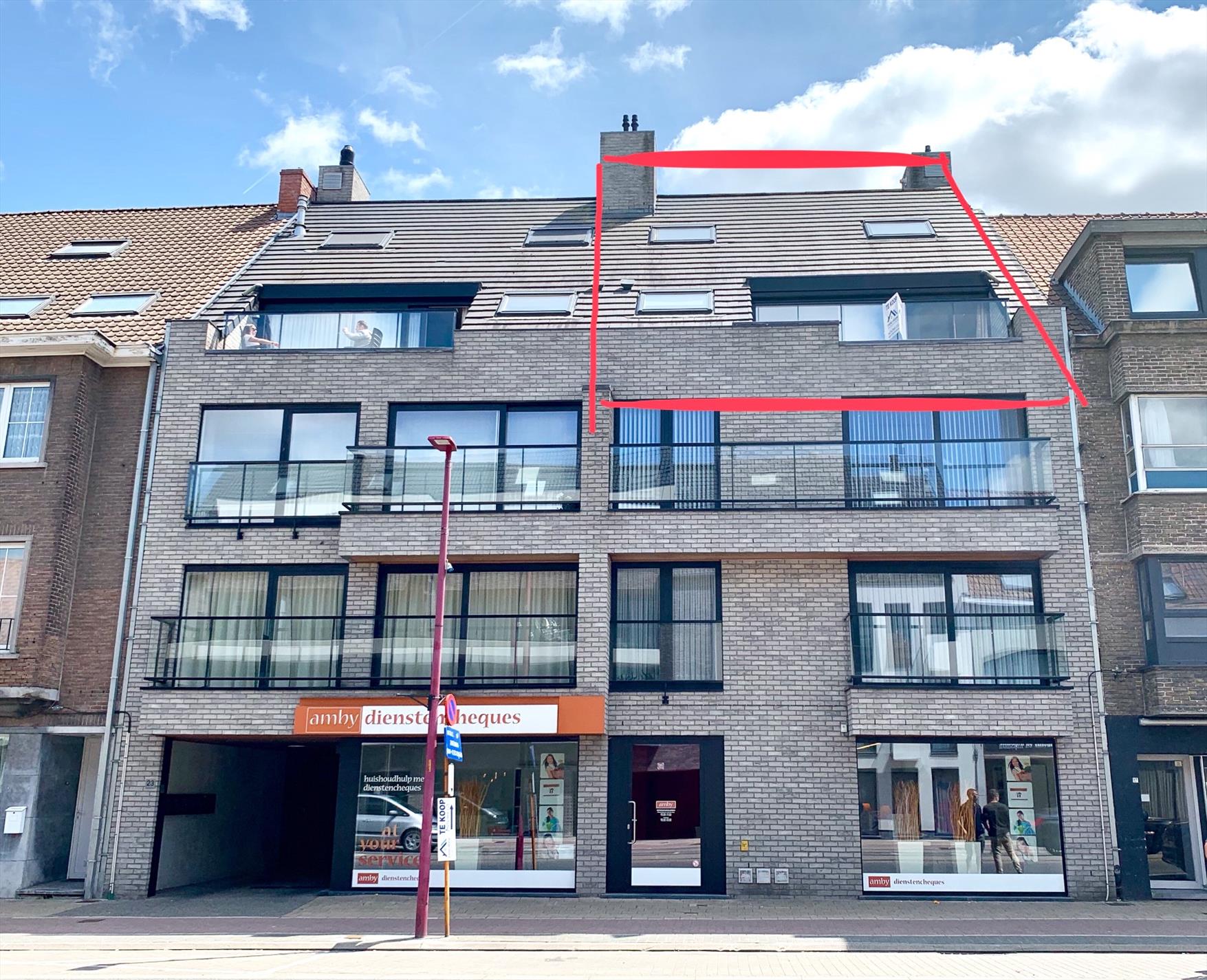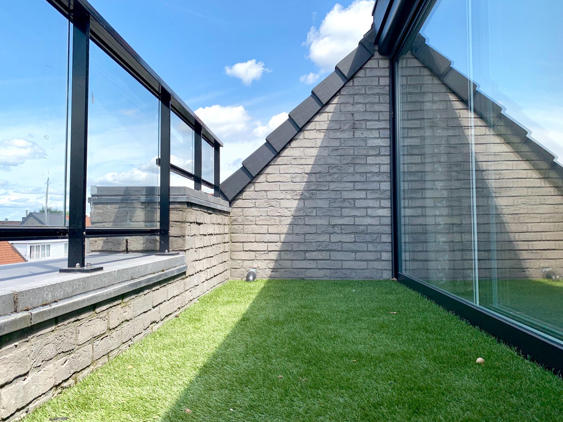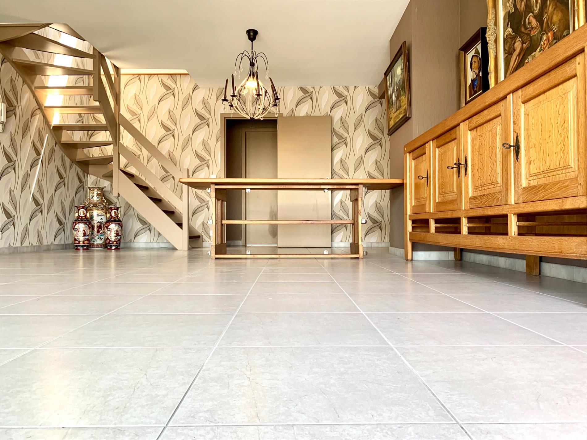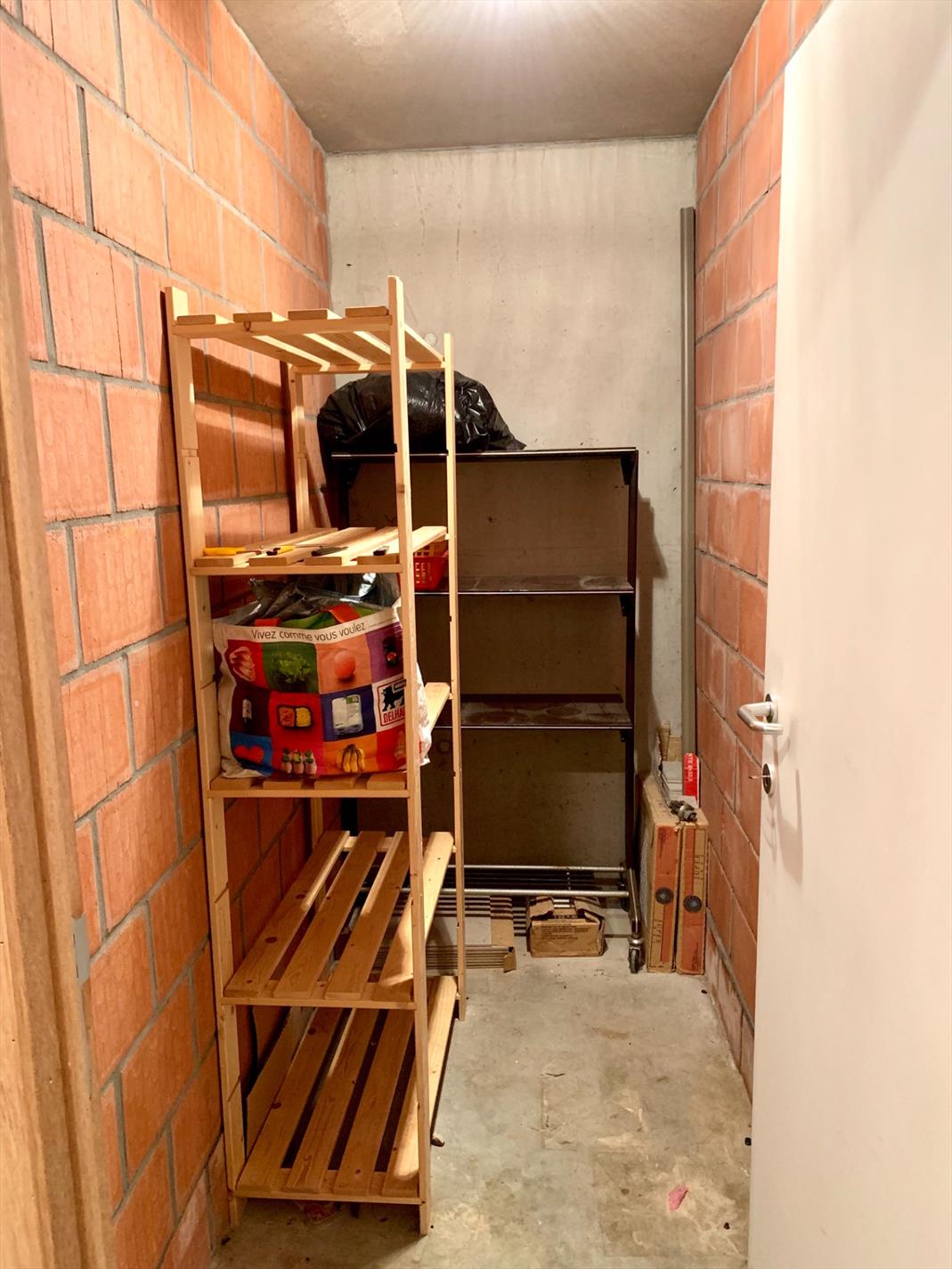 Aan de buitenzijde is al duidelijk te zien dat het om een zeer kwaliteitsvol complex gaat. Via de mooie strakke inkomhal neemt u de lift naar boven. Bij het binnen wandelen in het appartement heeft u direct zicht op het terras door het grote schuifraam. Op het terras ligt een bangkirai houten vloer waar nu een grasmat over ligt maar kan weggenomen worden. In de woonkamer is enorm veel lichtinval, de warmte blijft buiten door de recent geplaatste, automatische screens. Indien deze naar beneden zijn kan u nog steeds naar buiten kijken. Aansluitend is een open keuken met alle nodige toestellen en aparte berging.