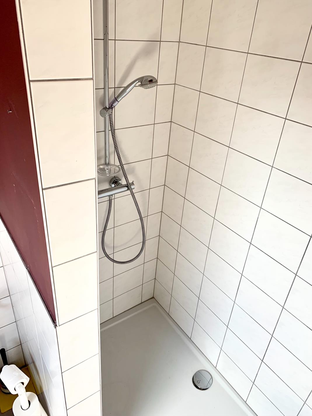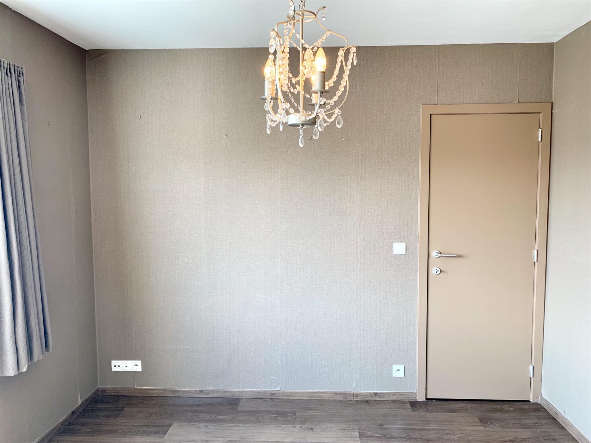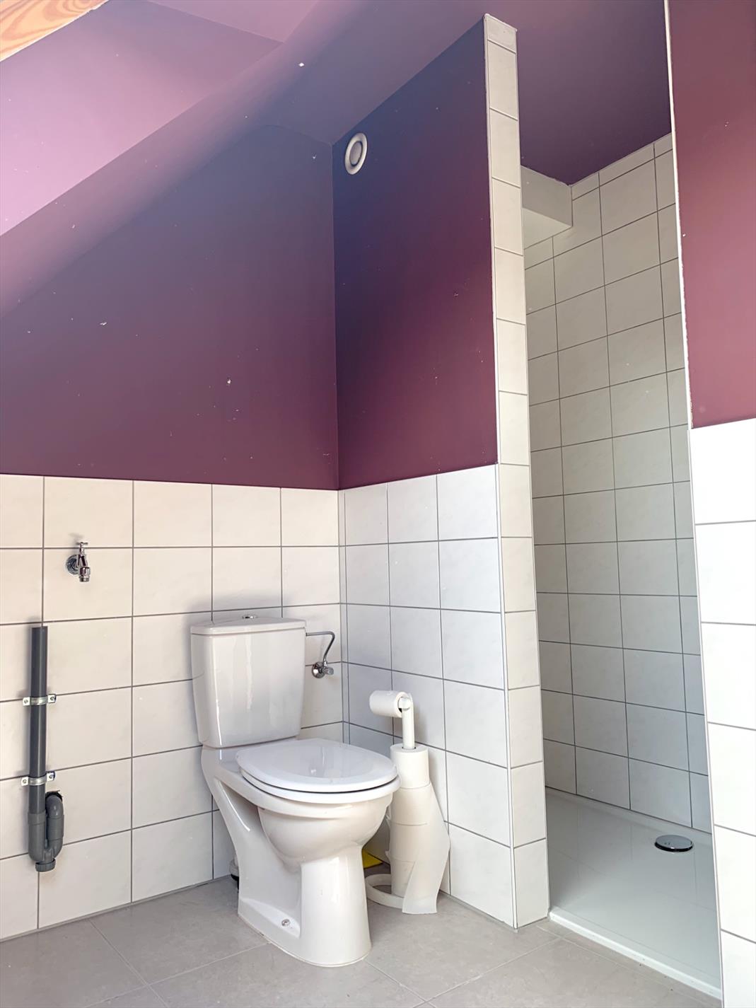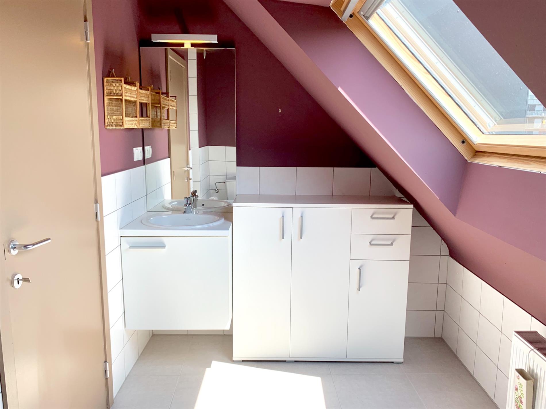 Achter de woonkamer bevinden zich 1 ruime slaapkamer en een badkamer met inloopdouche, toilet en lavabo-meubel.