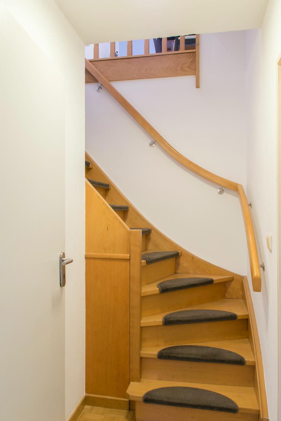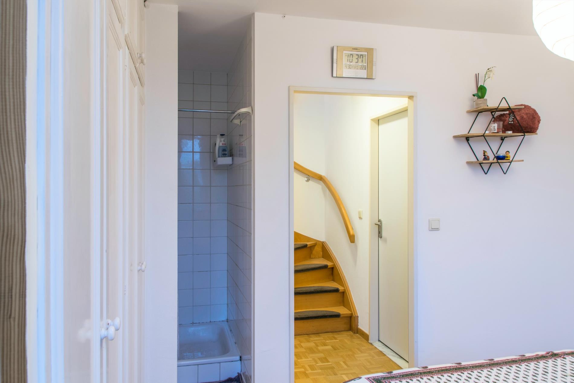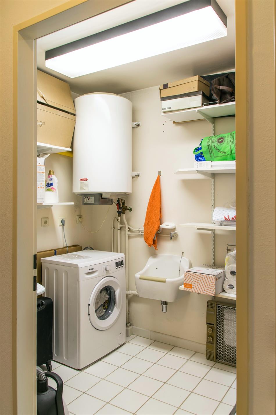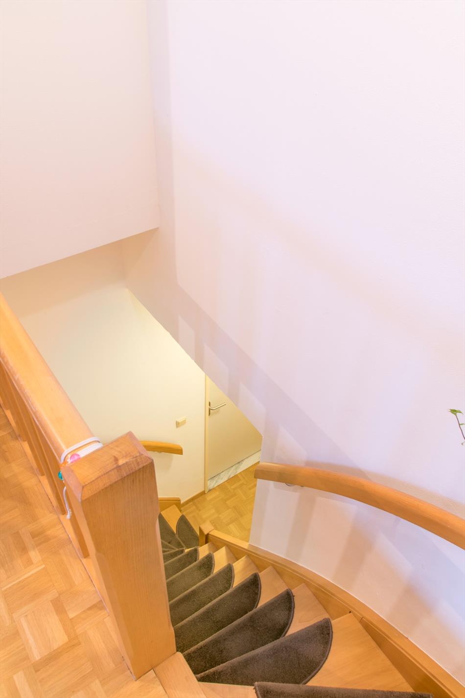 Via een praktische inkomhal (met aansluitend gastentoilet) kom je in de lichtrijke leefruimte met massief houten vloer. Er is direct contact met de praktisch ingerichte keuken, en op het gezellige terrasje kan je genieten van de combinatie van groen en de skyline van de stationsbuurt. Aan de andere kant van de keuken ligt de eerste slaapkamer, met ingemaakte kasten, een eigen lavabo en badkamer inclusief toilet, ligbad en douche. Via een trap in de leefruimte kom je in de onderste verdieping van het appartement. Daar is een ruime bergplaats/technische ruimte voorzien, en ook de tweede slaapkamer van dit appartement bevindt zich hier. Ook in deze kamer zijn ingemaakte kasten voorzien, er is dus bergruimte in overvloed. Bovendien beschikt deze kamer over een eigen doucheruimte. Bij dit appartement hoort ten slotte ook nog een garage, aan de achterzijde van het gebouw.