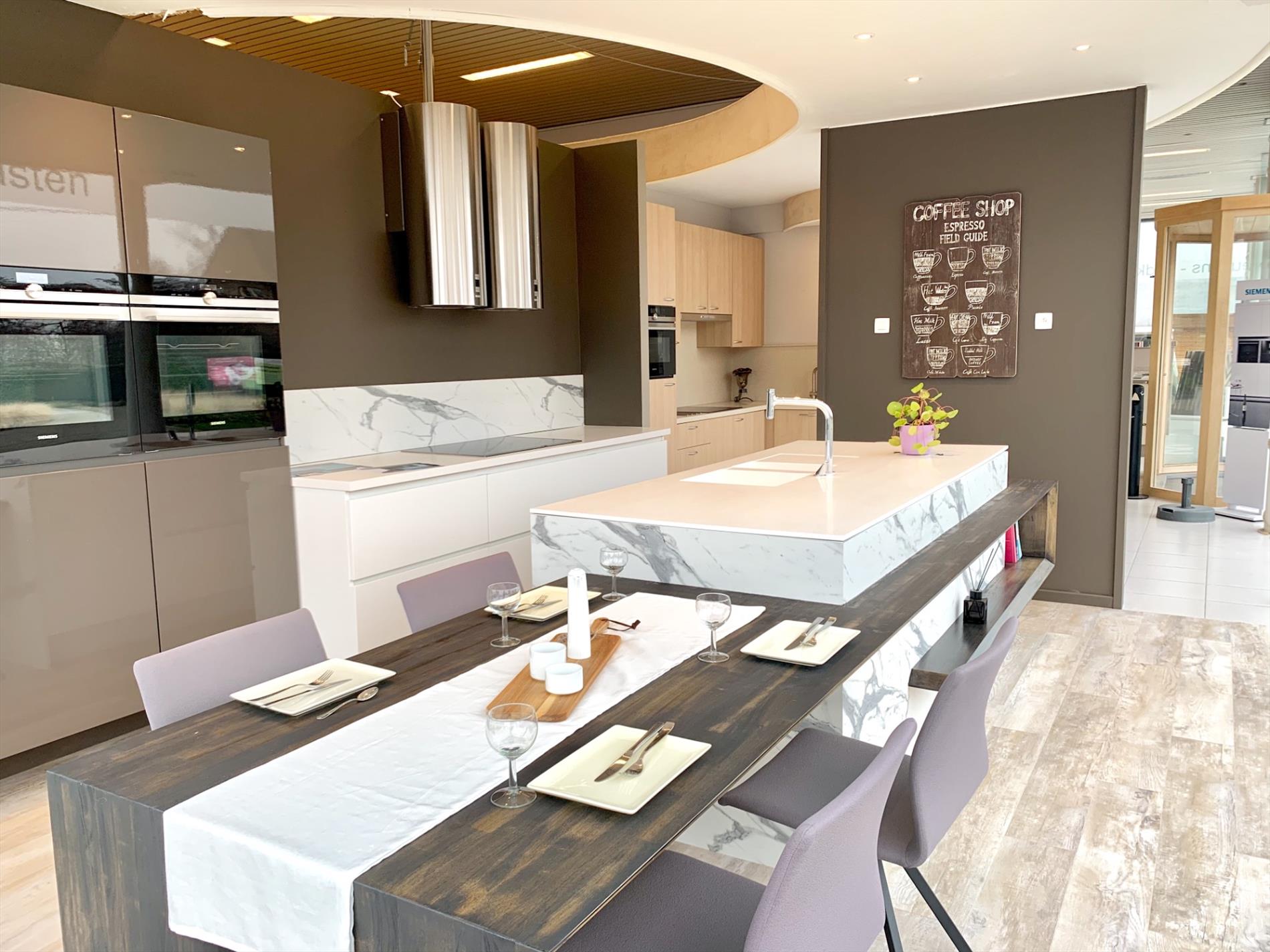 Op het gelijkvloers bevinden zich de inkomhal, ruime garage/wasplaats, enorm grote open keuken met tal van toestellen, 2 eilanden, koele kelder, open woonkamer met veel lichtinval en open haard. In de traphal is een deur naar het gastentoilet dat u ook kan bereiken via de showroom. De showroom (220m2) bestaat uit verschillende onderverdelingen waarvan 1 ook afgesloten en gebruikt wordt als ontvangt/bureauruimte met een grote aangesloten 2de keuken.