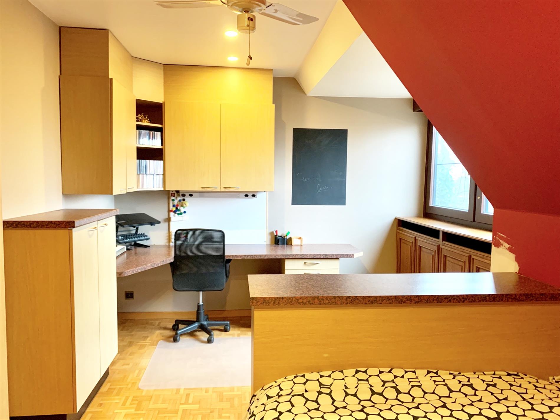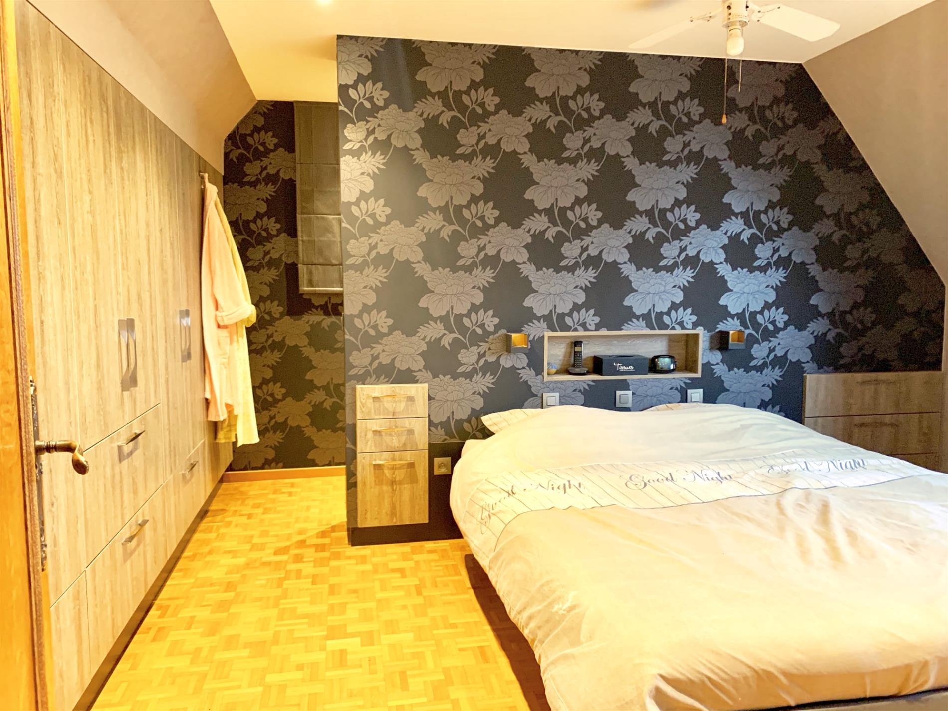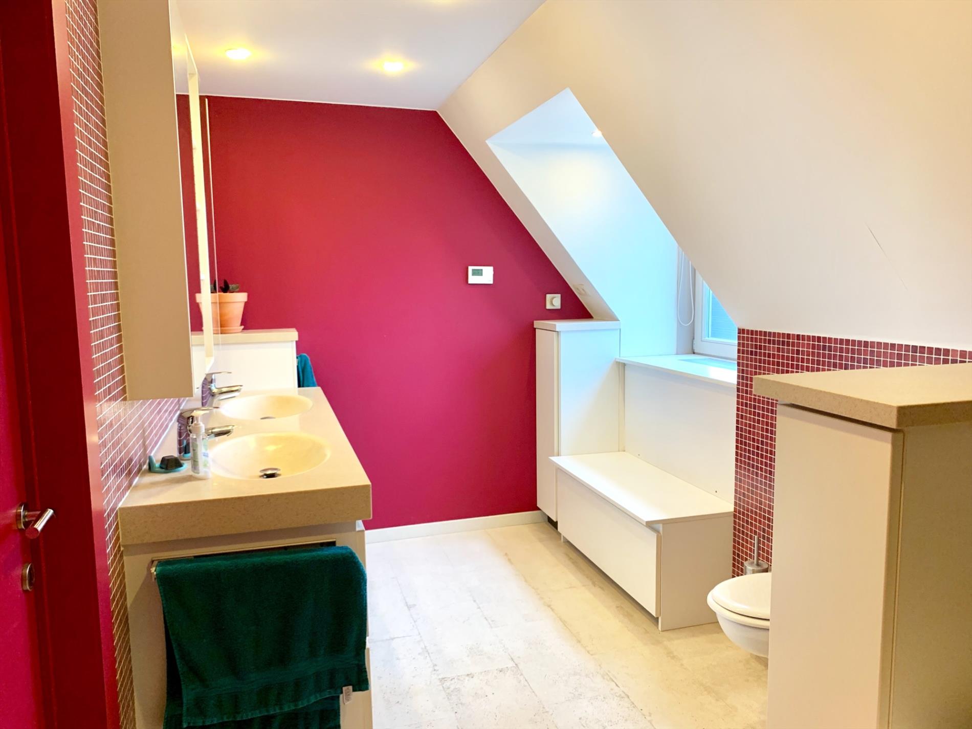 Op de bovenverdieping bevinden zich de badkamer met dubbel lavabomeubel en een massagebad voor 2 personen en 5 slaapkamers. De eerste 4 zijn allemaal voorzien van ingemaakte kasten en bureau’s. De 5de slaapkamer is meer een afgewerkte studio met aparte badkamer met inloopdouche en lavabo, sauna en relaxruimte. Kleine zolder.