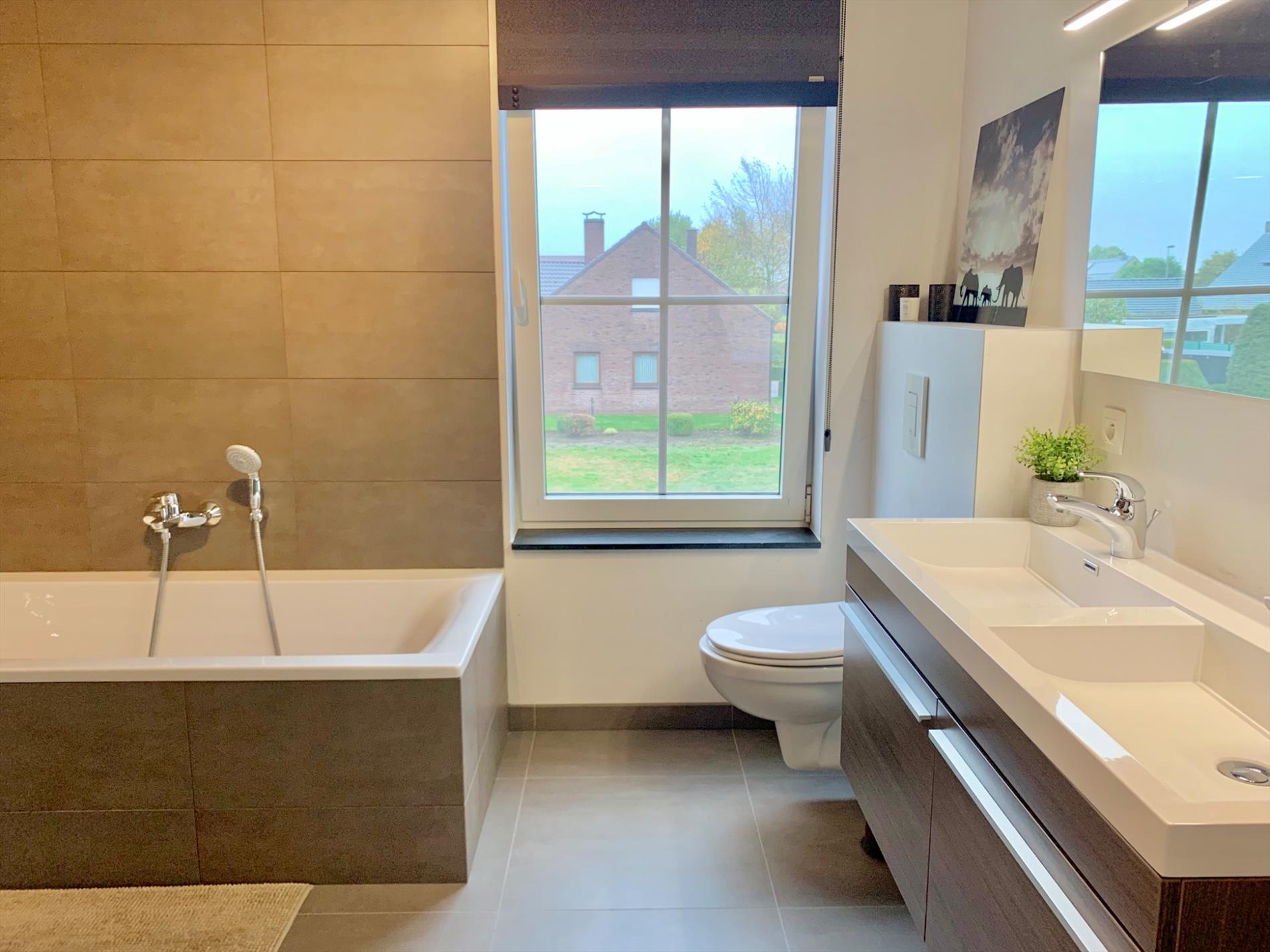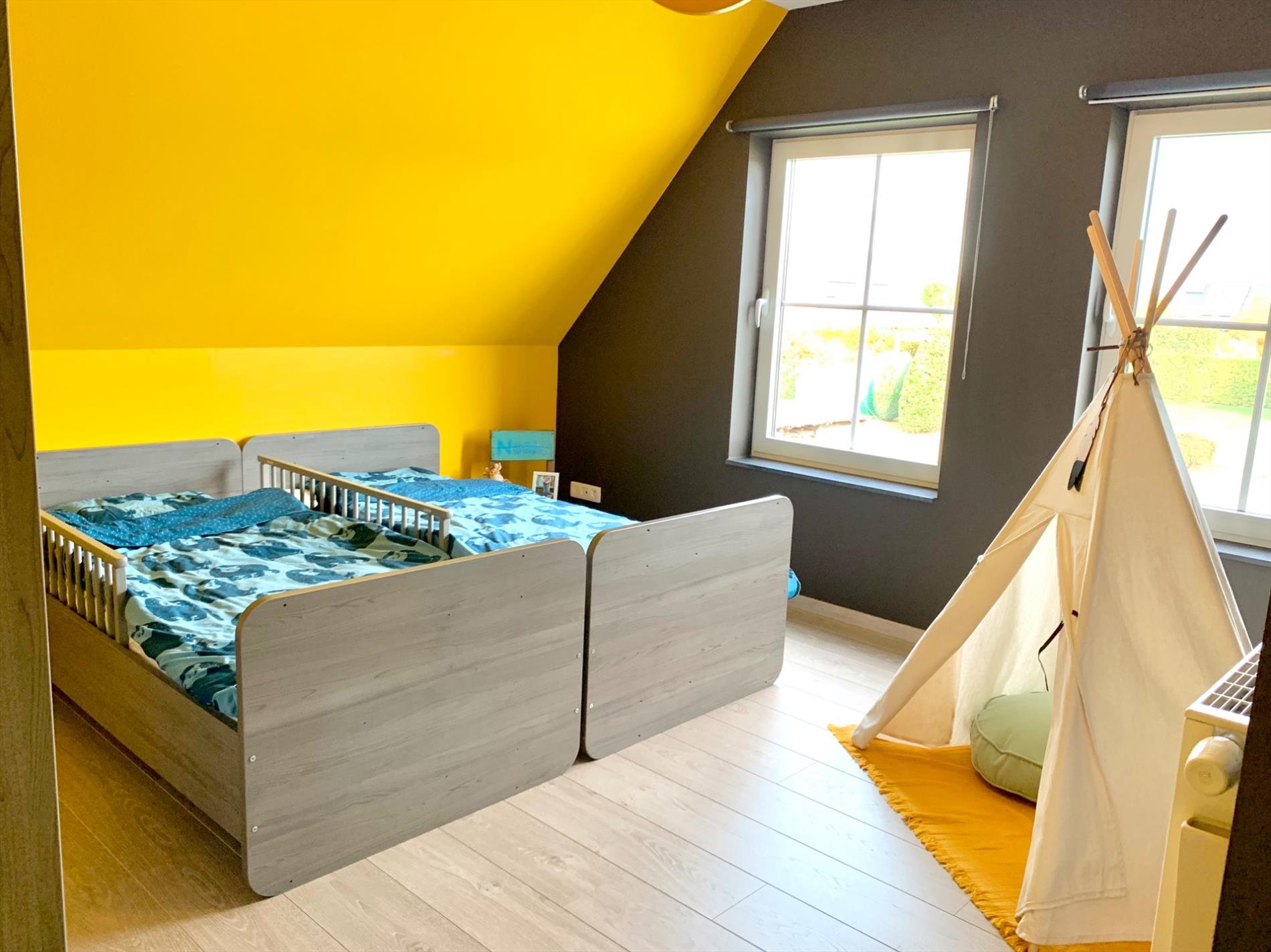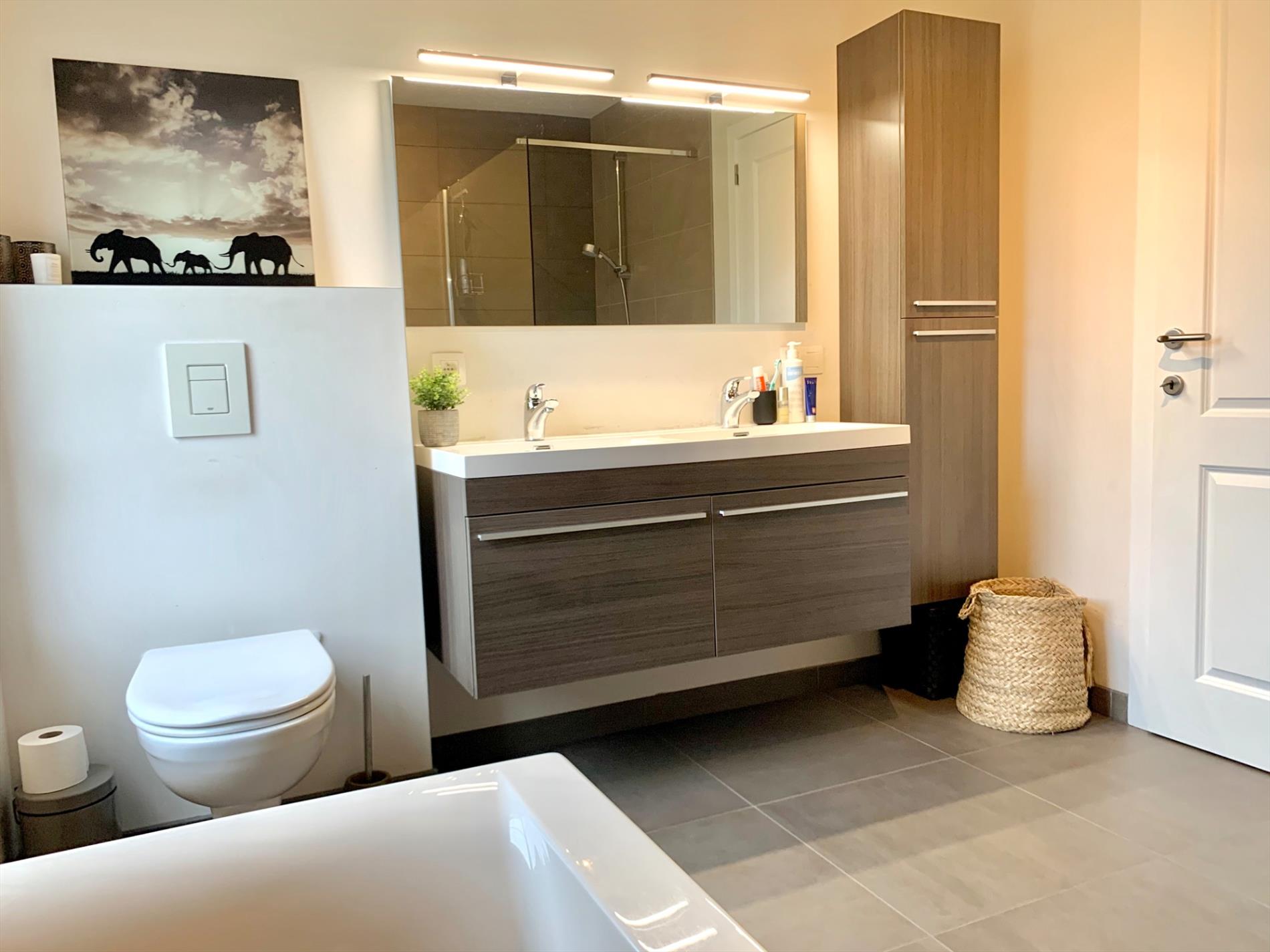 Op de eerste verdieping zijn 3 zeer ruime slaapkamers (waarvan 1 met speelruimte/dressing) , een moderne, strakke badkamer met inloopdouche, ligbad en dubbel lavabomeubel met kolomkast. De aparte dressingroom is voorzien van inbouwkasten, deze ruimte kan ook dienen om een vaste trap te plaatsen naar de enorme, perfect geïsoleerde zolder waar u ook nog 1of 2 slaapkamers kan creëren.