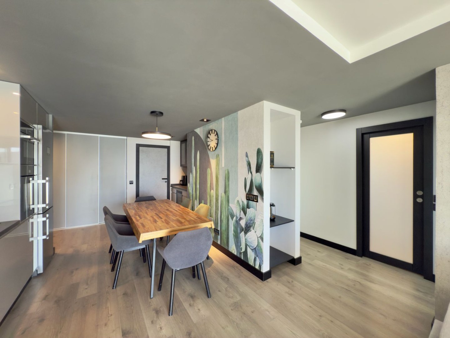 Ontworpen door een professionele interieurarchitect, is elk detail zorgvuldig uitgekozen om een ruimte van ingetogen luxe te creëren. De open woon- en eetkamer loopt naadloos over in een royaal terras, terwijl de op maat gemaakte keuken – volledig uitgerust met hoogwaardige apparatuur – zowel een culinaire werkplek als een designstatement is.