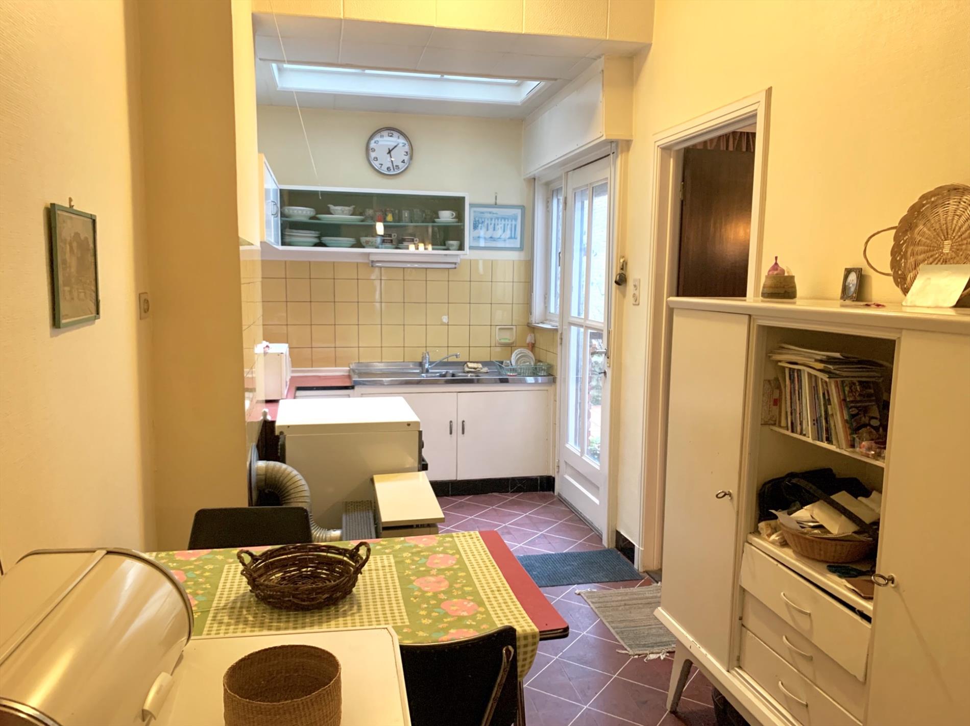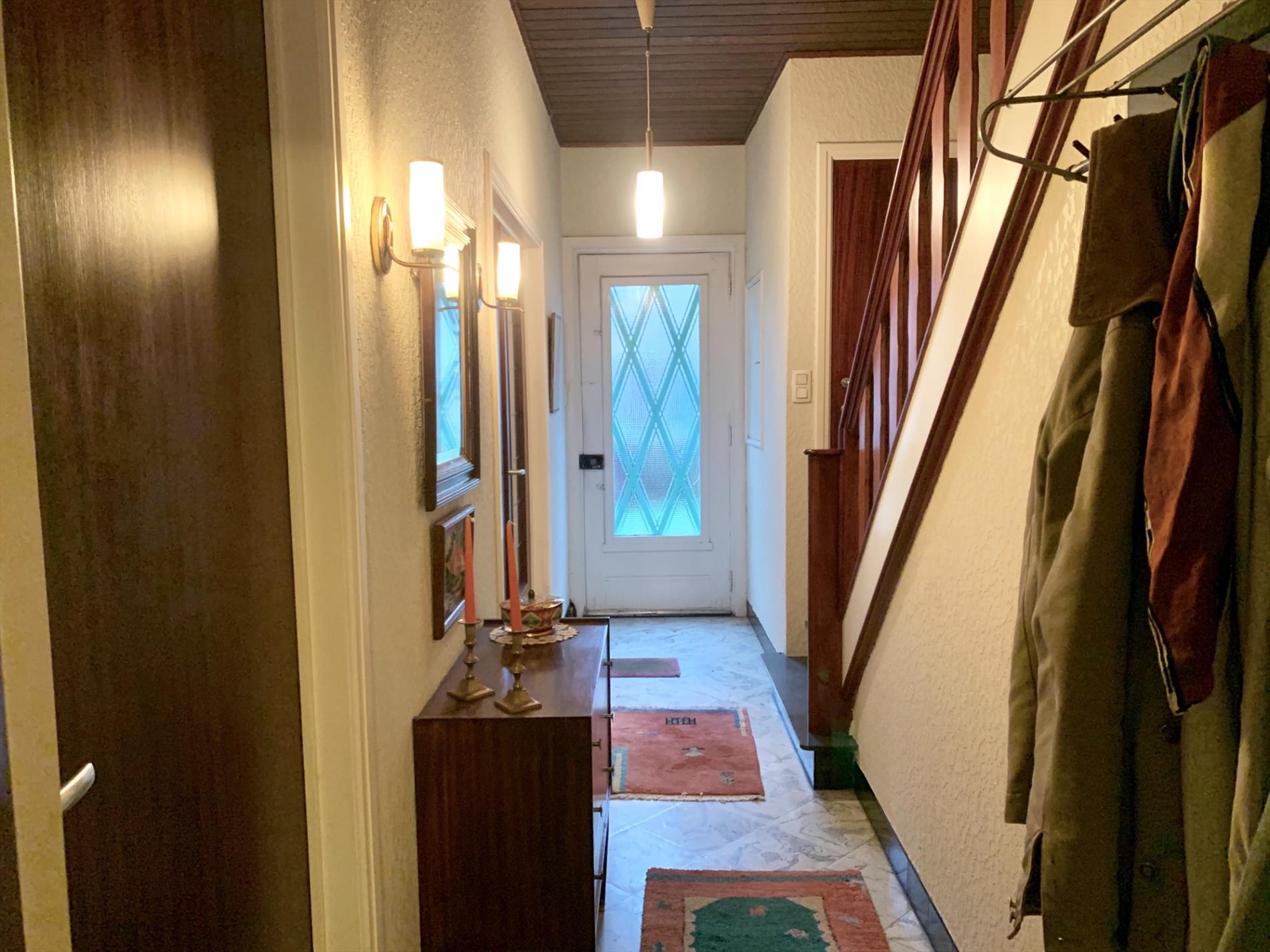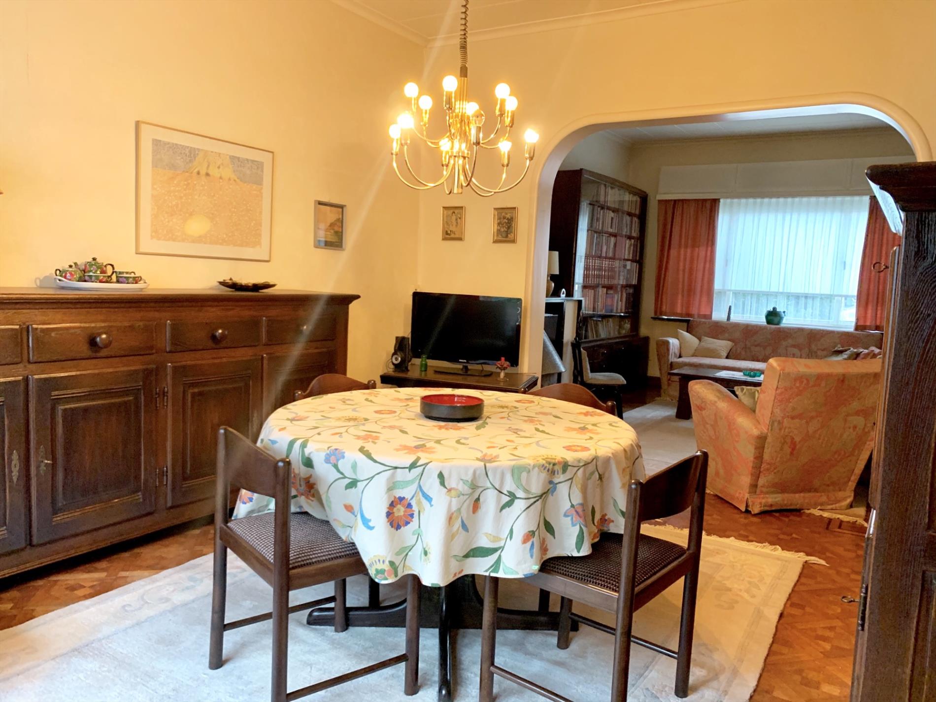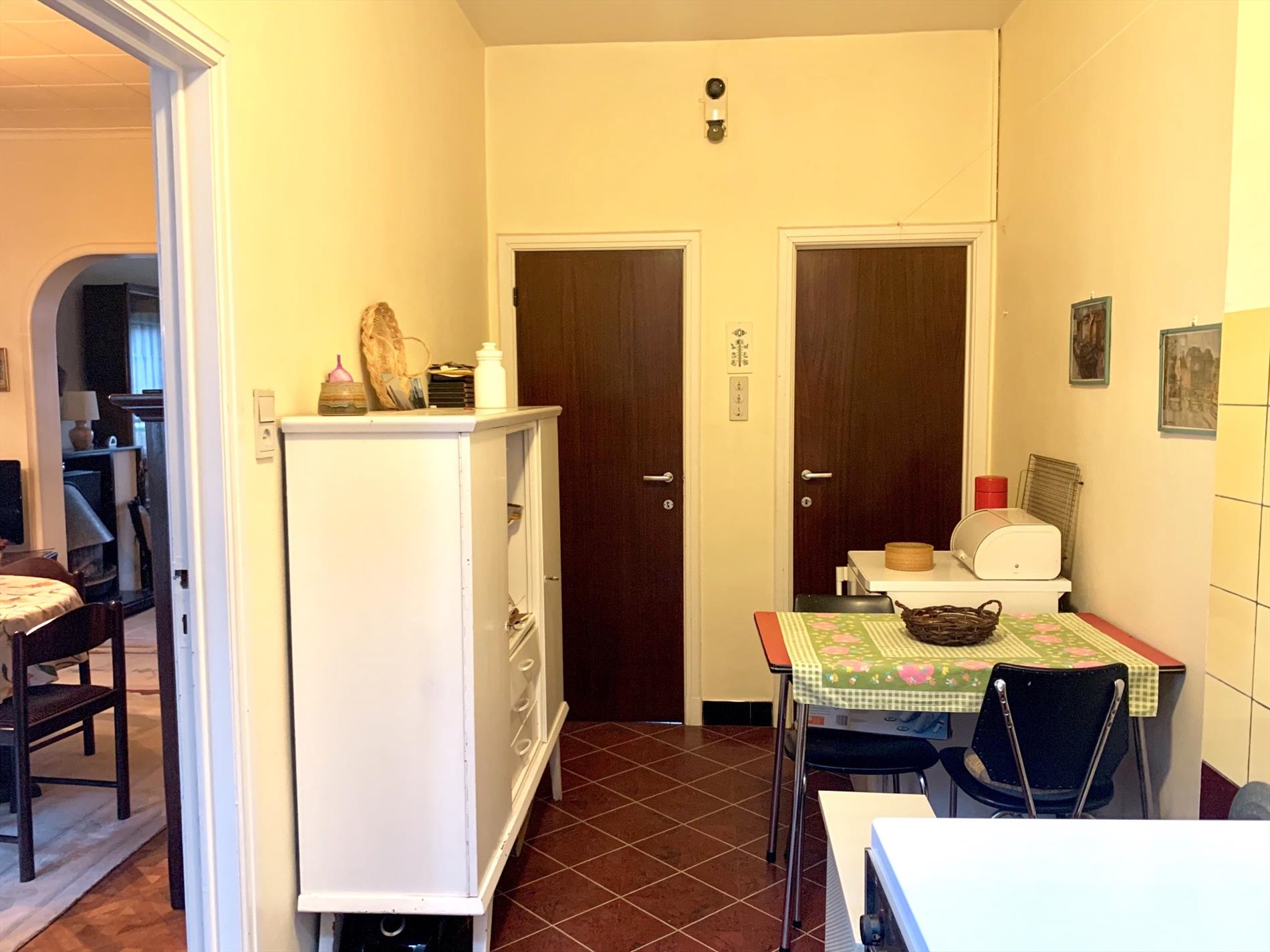 Schrijf u inDeze woning is mits enkele opfriswerken ideaal voor een gezin met kinderen. Via de voortuin kom je aan de ingang van de woning. De traphal is ruim en heeft een gastentoilet. Via de dubbele glazen deur komt u binnen in de zeer ruime woonkamer met veel lichtinval. Achteraan kijkt u uit op de tuin met terras. Aanpalend is de keuken met bijhorende enorm grote én droge kelder die uit 3 delen bestaat.