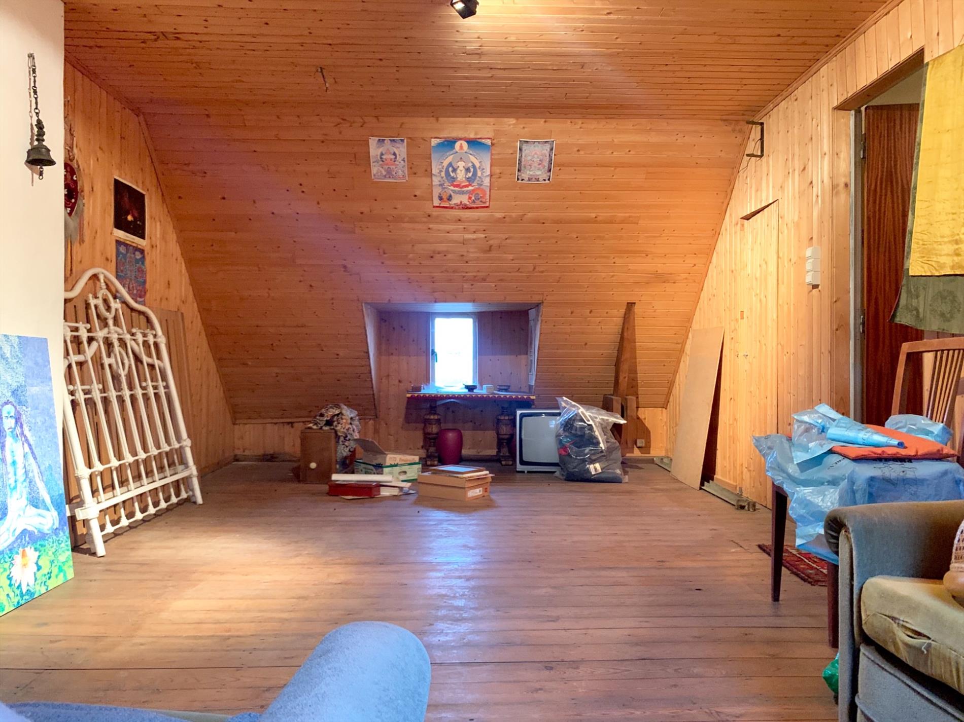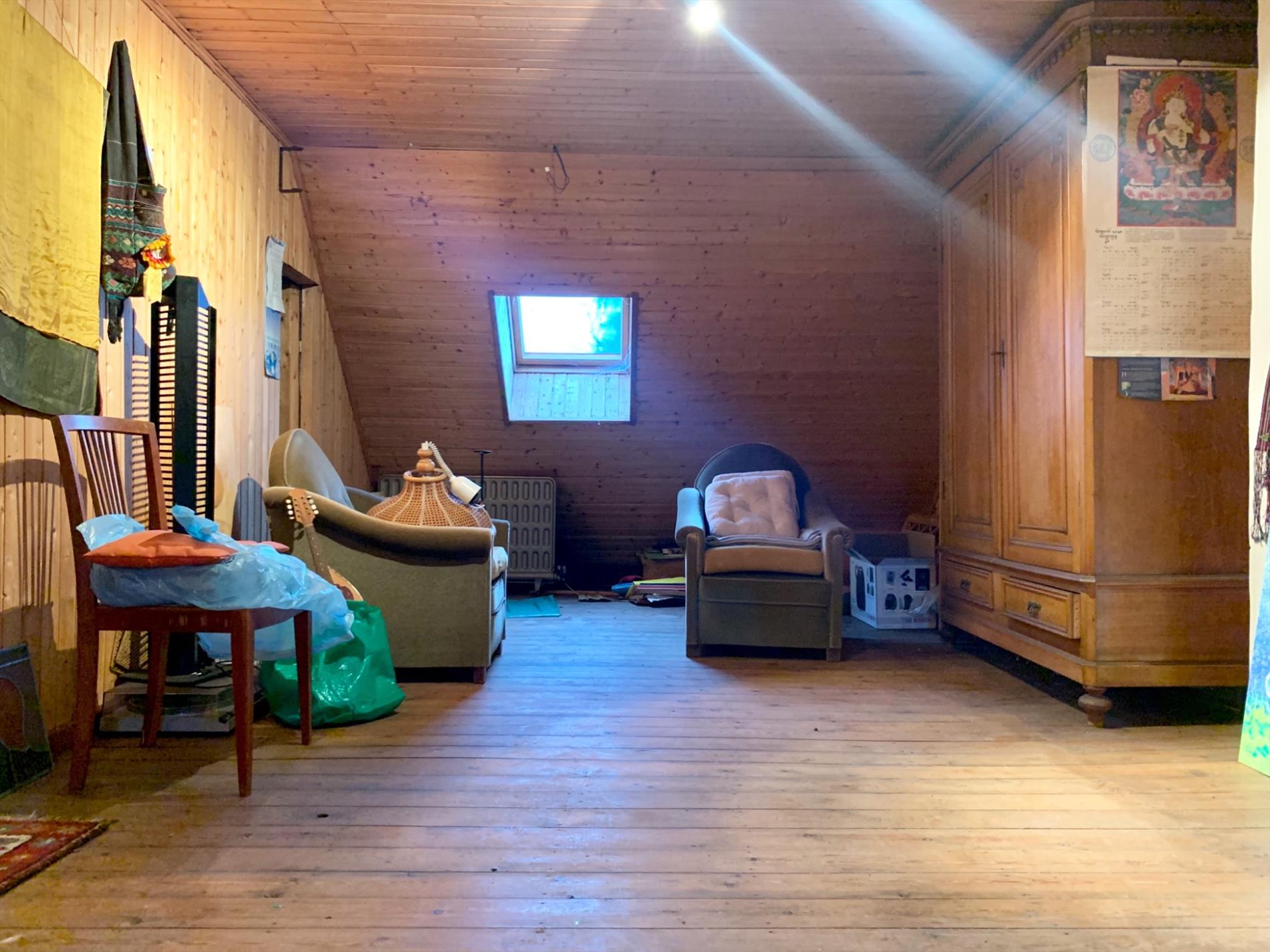 Op de 2de verdieping die toegankelijk is met dezelfde vaste trap , is een enorme zolder die ook als slaapkamer kan dienen. Deze is afgewerkt met hout en heeft nog 2 aparte zolderkamers.
