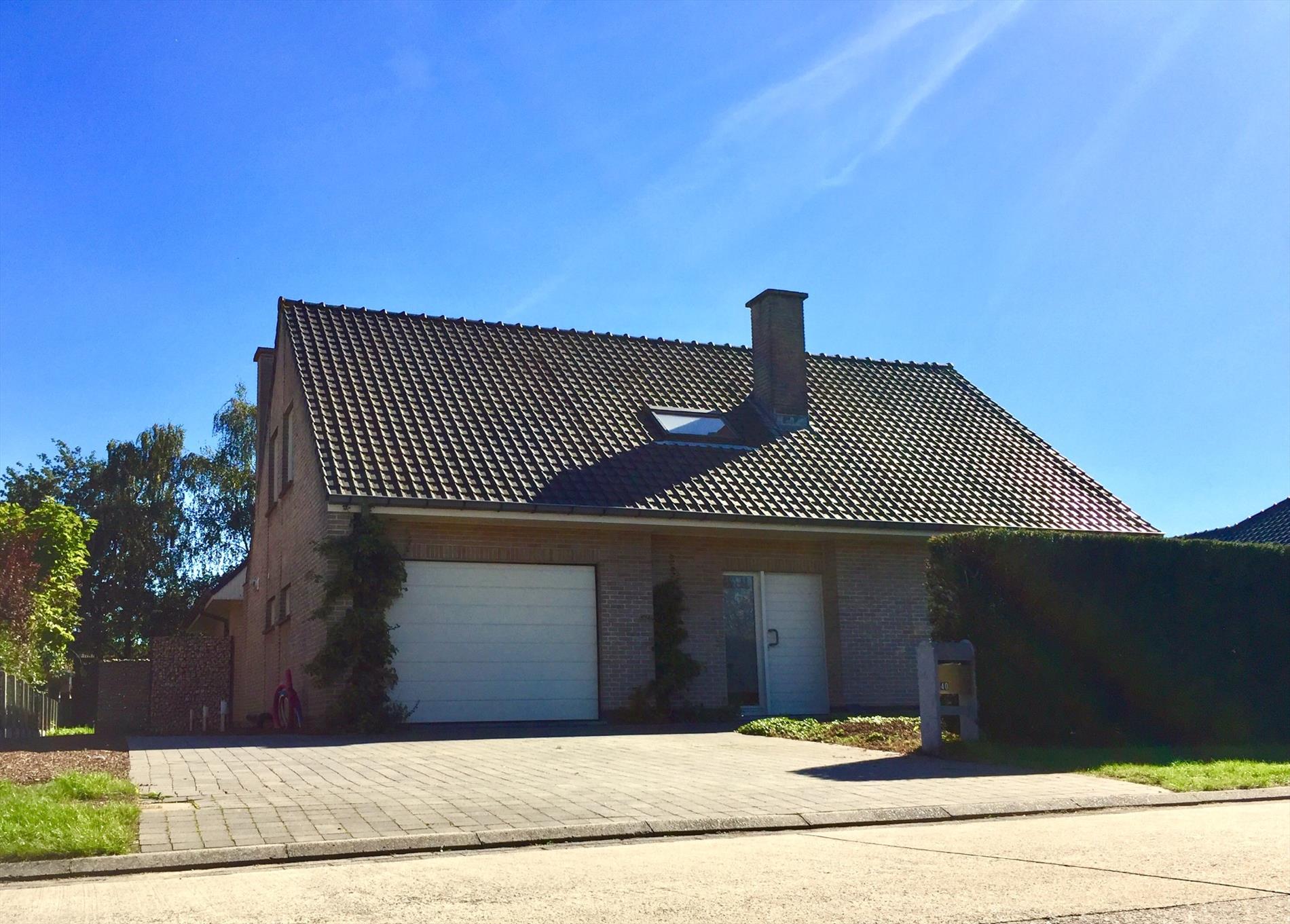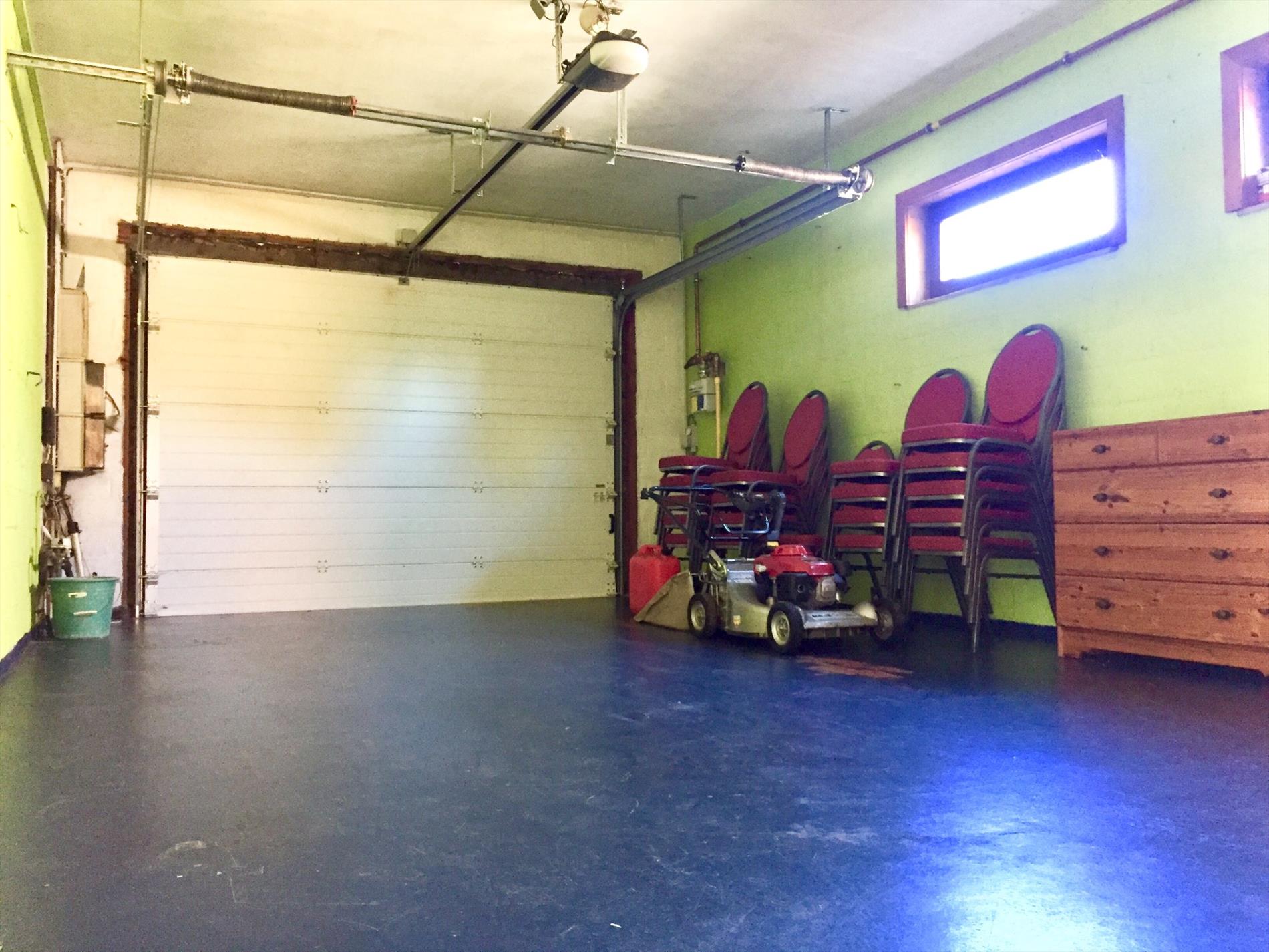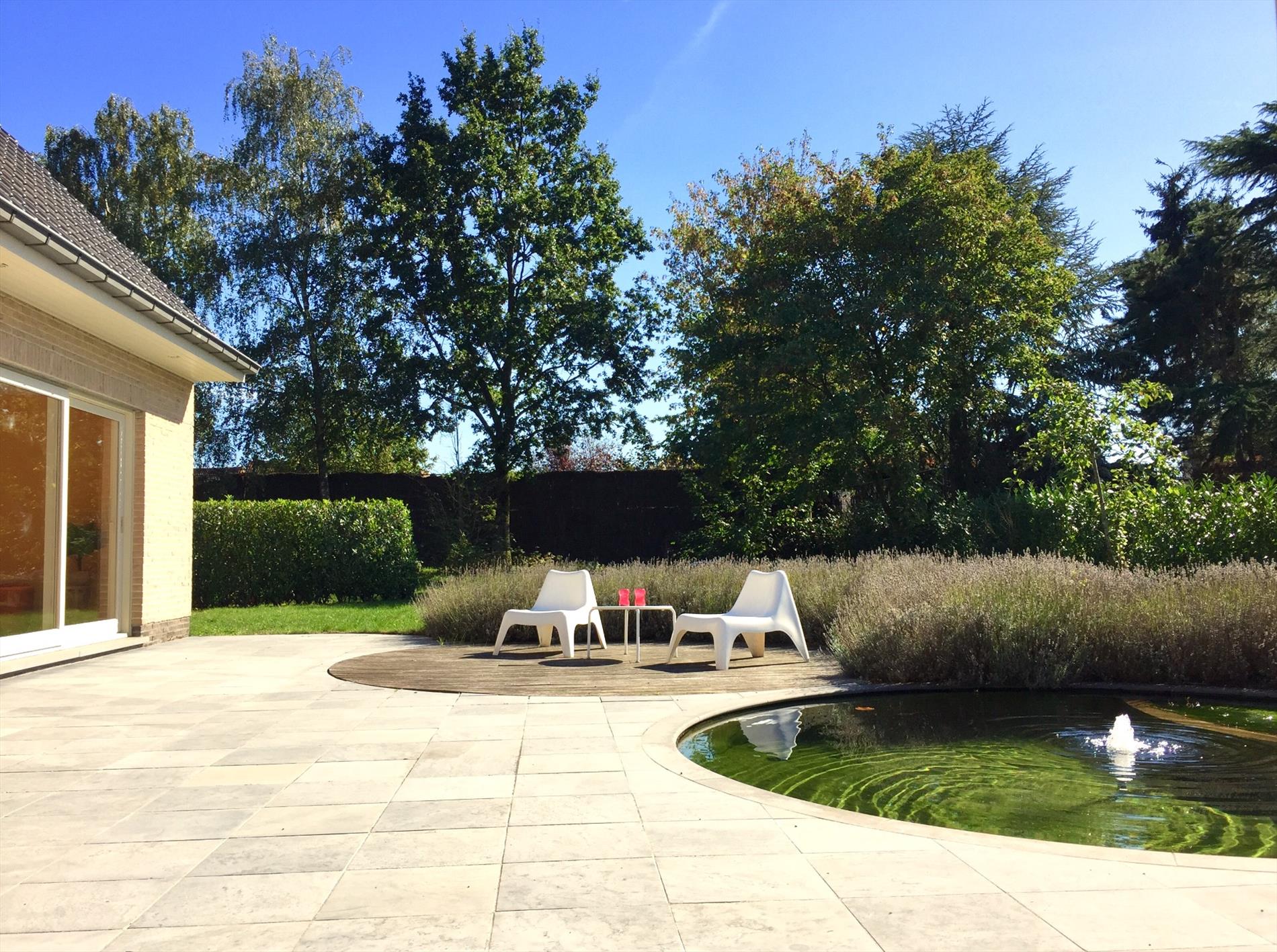De garage met elektrische poort ligt centraal, hier is ook een wasruimte voorzien. In de tuin is het zalig vertoeven op het aangelegde terras met prachtige vijver. Ook in de voortuin ligt een vijvertje. Achteraan staat een groot tuinhuis onder de prachtige bomen.