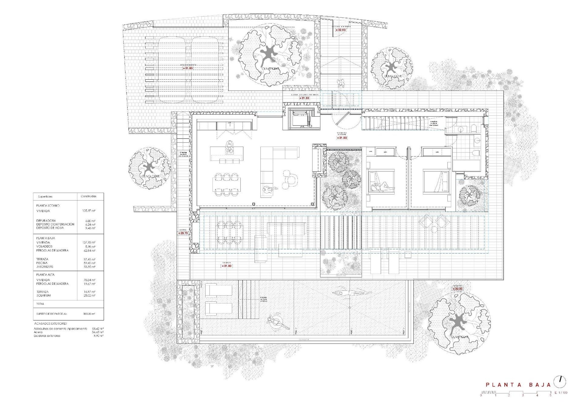 Moderne villa met panoramisch uitzicht op zee in La Fustera, Benissa Costa Deze exclusieve nieuwbouwwoning, ontworpen door een gerenommeerde architect en ontwikkeld door een lokale projectontwikkelaar met meer dan 20 jaar ervaring, ligt op een perceel van 800 m², op slechts een steenworp afstand van het strand van La Fustera. De architectuur combineert mediterrane warmte met eigentijdse elegantie en maakt gebruik van natuursteen, hout en zachte neutrale tinten, waardoor het gebouw naadloos opgaat in het kustlandschap. Met een totale bebouwde oppervlakte van 716 m², verdeeld over drie verdiepingen - kelder, begane grond en eerste verdieping - biedt de villa een perfecte balans tussen functionaliteit, design en comfort. Kelder De benedenverdieping van 105,97 m² is ontworpen met het oog op zowel functionaliteit als ontspanning. Het omvat een volledig uitgeruste fitnessruimte, wasruimte en technische ruimtes, met de mogelijkheid om extra ruimtes aan te passen als wijnkelder, bioscoop of multifunctionele ruimte. Op dit niveau bevinden zich ook het filtersysteem en de watertanks van het zwembad, waardoor een efficiënt beheer van alle technische installaties wordt gegarandeerd. Begane grond De hoofdverdieping, met een oppervlakte van 137,93 m², heeft een lichte, open indeling die de essentie van het mediterrane leven weerspiegelt. De ruime woonkamer, eetkamer en keuken komen via grote ramen van vloer tot plafond uit op het hoofdterras en het overloopzwembad, met een prachtig panoramisch uitzicht op zee dat het karakter van deze woning bepaalt. Twee tweepersoonsslaapkamers, een complete badkamer en een gastentoilet maken deze verdieping compleet en bieden comfort en functionaliteit. Buiten zorgt een houten pergola voor schaduw in de buitenlounge en eetgedeeltes, omgeven door weelderige tuinen, zonneterrassen en een 59,40 m² groot overloopzwembad dat visueel versmelt met de zee. Eerste verdieping De bovenverdieping, met een oppervlakte van 70,19 m², is gereserveerd voor de master suite - een privéretraite met een inloopkast, een en-suite badkamer en een groot privéterras met adembenemend uitzicht op de Middellandse Zee. Een tweede slaapkamer of kantoorruimte maakt deze verdieping compleet, die ook toegang biedt tot een solarium van 25,02 m², ideaal om te ontspannen in de zon en te genieten van de rust van de omgeving. Buitenkant en locatie Deze woning ligt in een rustige woonstraat, omringd door moderne villa's, en geniet van een uitzonderlijke ligging op slechts 3 minuten lopen van het strand van La Fustera (150 m), de Mandala Beach Bar & Restaurant en essentiële voorzieningen zoals supermarkten en lokale diensten. Deze villa is ontworpen met de nadruk op licht, ruimte en een naadloze overgang tussen binnen en buiten, en belichaamt de moderne mediterrane levensstijl: elegant, ontspannen en in perfecte harmonie met het spectaculaire panoramische uitzicht op zee. Verzeker uzelf van uw droomvilla in La Fustera, Benissa Costa, en omarm de ultieme mediterrane levensstijl met adembenemend uitzicht op zee en ongeëvenaard comfort.