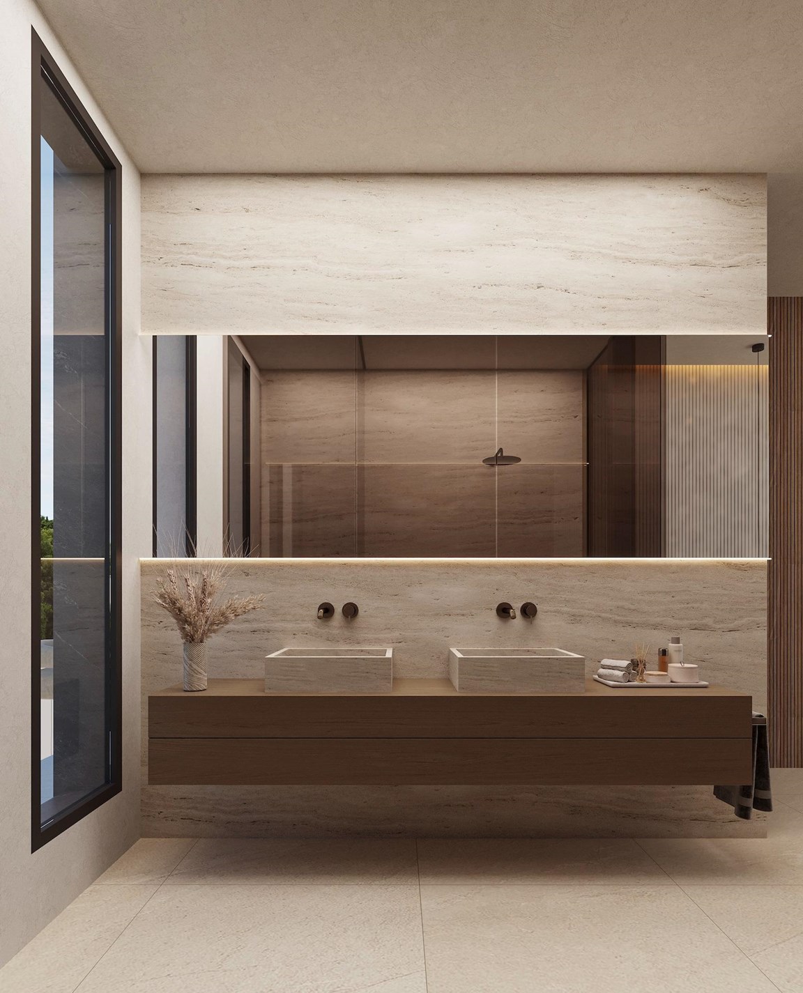 De villa is ontworpen met het oog op functionaliteit en gemak en is verdeeld over één verdieping, waardoor hij ideaal is voor zowel gezinnen als gepensioneerden. De entree komt uit in een lichte hal die uitkomt op een ruime open woon- en eetkamer met een moderne keuken met kookeiland en een aparte bijkeuken. Grote schuifdeuren verbinden het interieur met een overdekte veranda met ingebouwde barbecue, een groot terras en een privézwembad van 52 m².