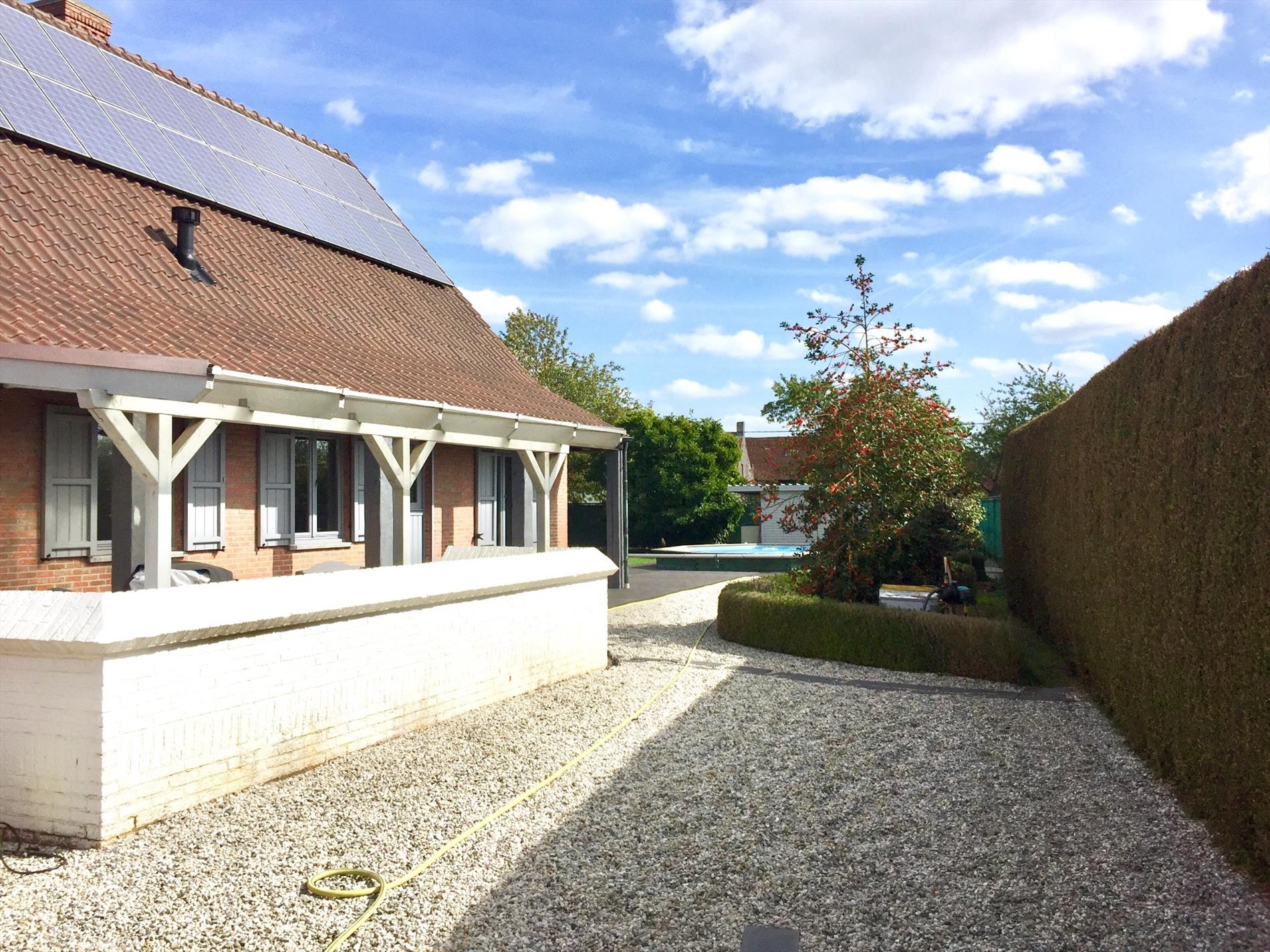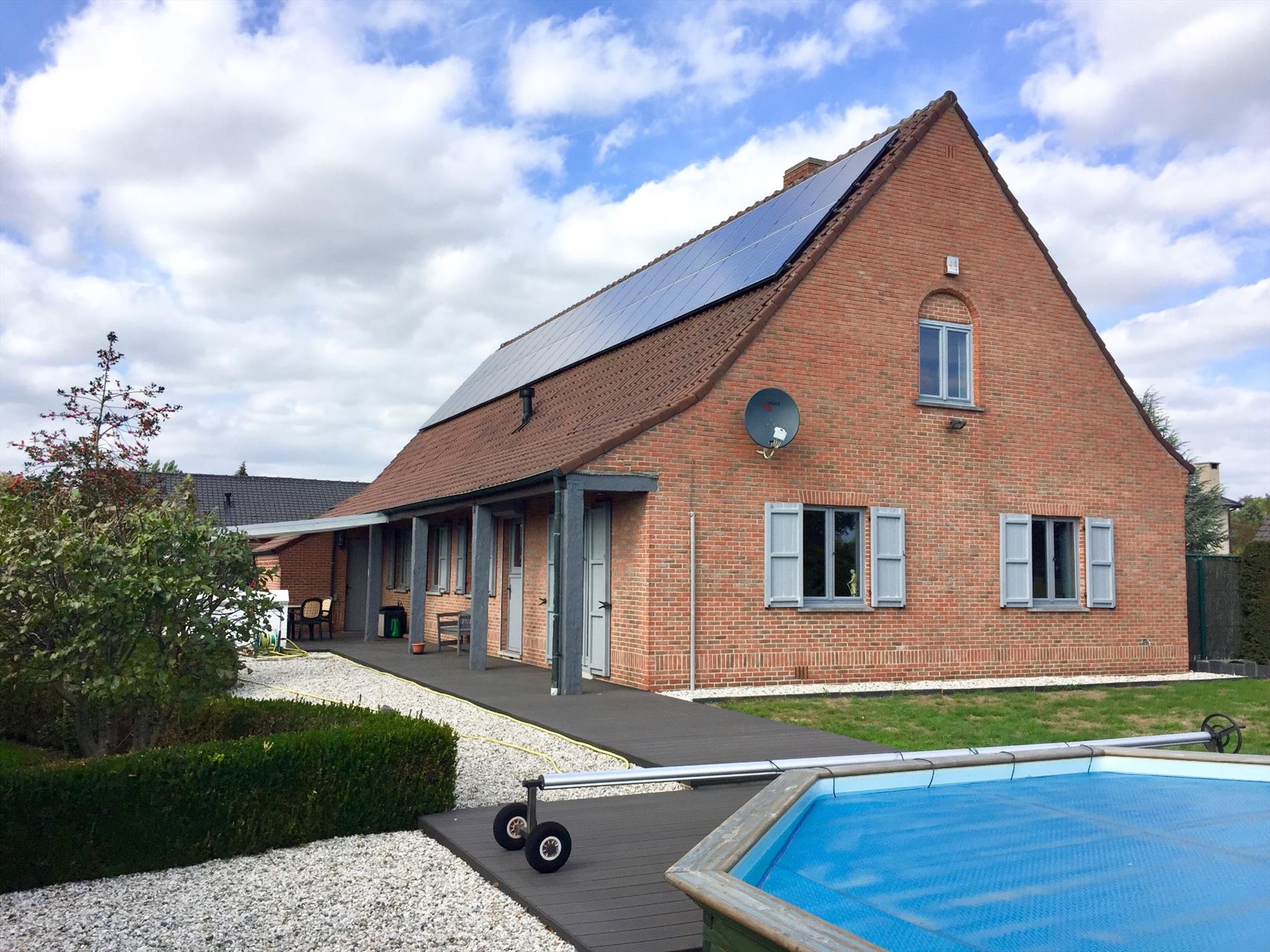 Vanop de oprit kan u via de 3de elektrische poort naar de carport. Naast de garage is er een tuinberging aanpalend aan het overdekt terras. Via het nieuw aangelegde composiet terras loopt u door naar het zwembad met poolhouse. Ook kan u genieten in de mooi aangelegde tuin. Alarminstallatie aanwezig, 38 zonnepanelen met een min.waarde van 35000€!