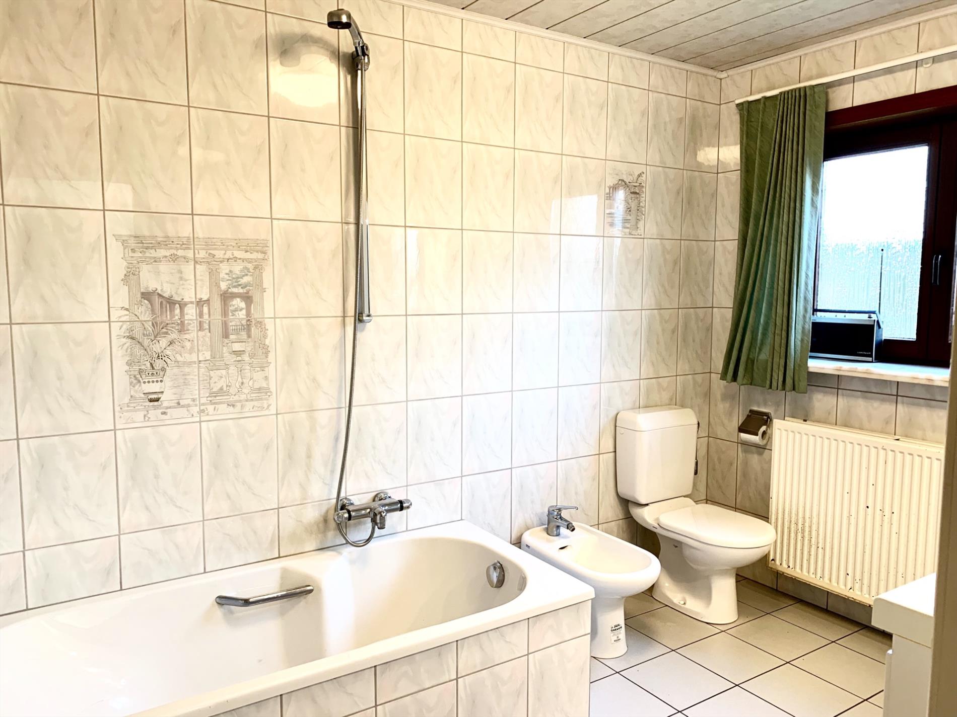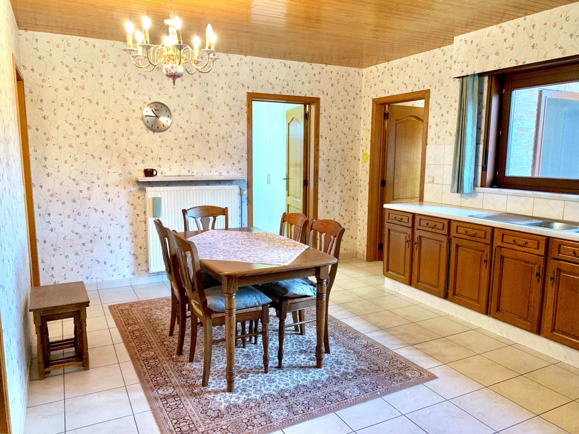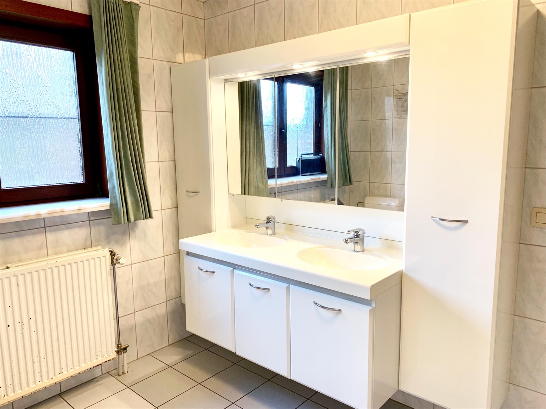 Op het gelijkvloers bevinden zich een ruime inkomhal met gastentoilet, 1 slaapkamer of bureau, ruime woonkamer en aanpalende grote keuken met extra berging. Ook de badkamer met ligbad, bidet, toilet, dubbele wastafel en aparte wasplaats met ingemaakte kasten zijn gelijkvloers. De garage is bereikbaar via een tussensas, van hieruit kan u ook een aparte ingang creëeren naar garage en/of bovenverdieping.