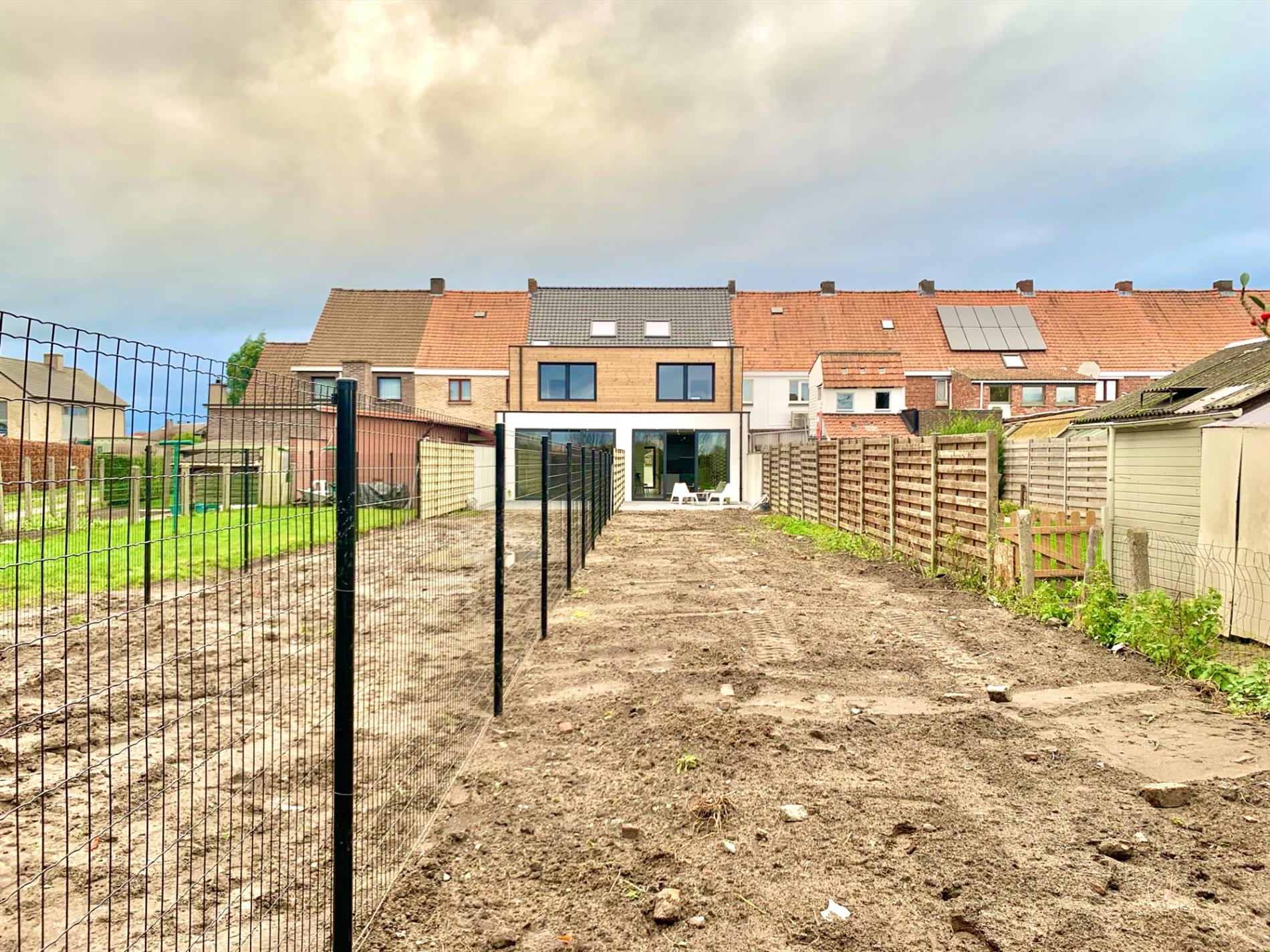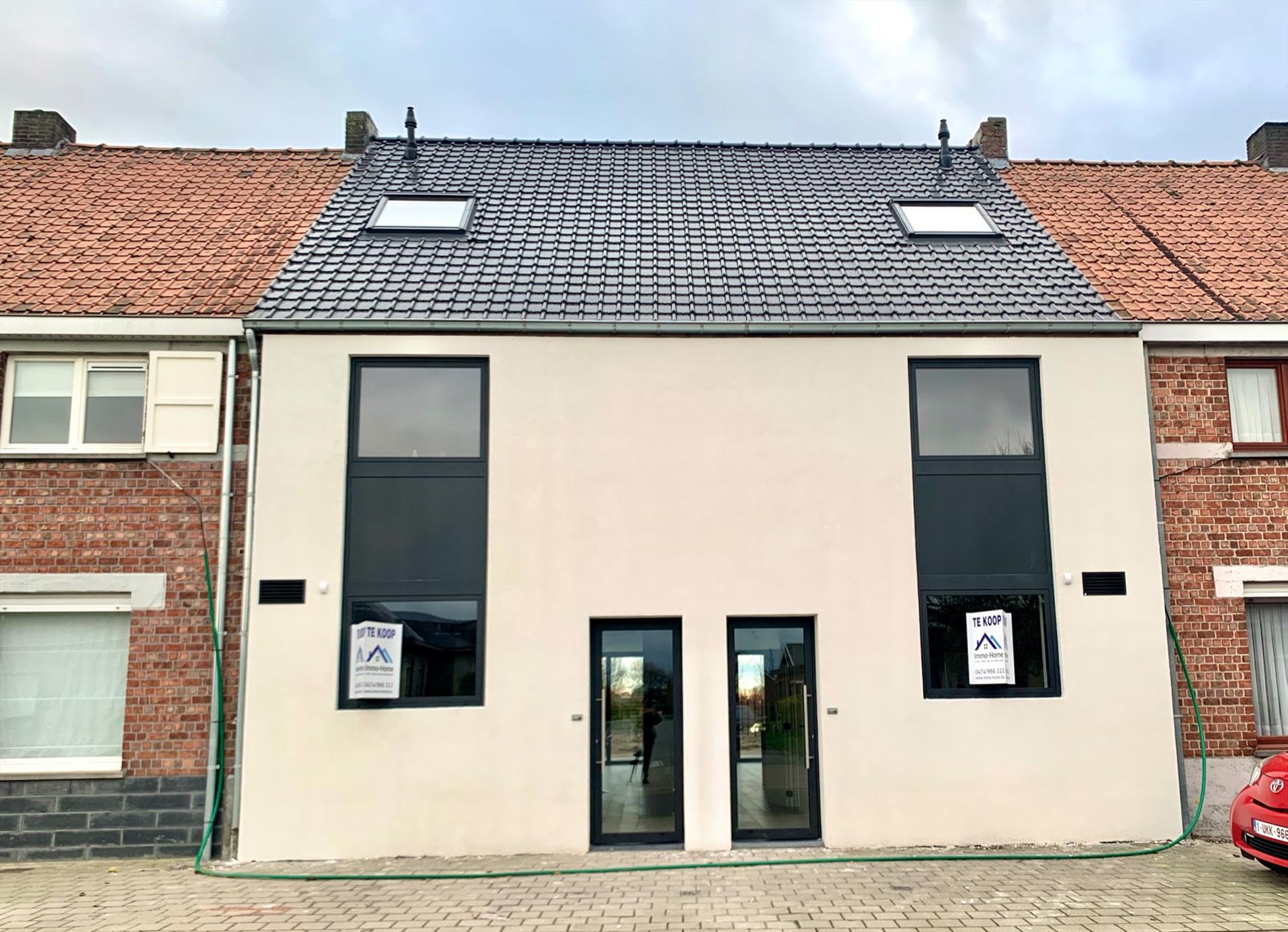 Achter de nieuwe strakke gevel (witte crepi met zwarte aluminium ramen) vindt u op het gelijkvloers het gastentoilet, de technische berging met ruimte voor fietsen!, en de open living/keuken.