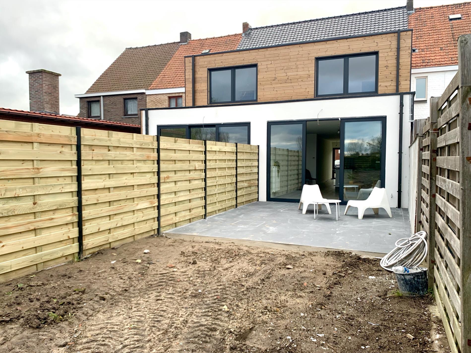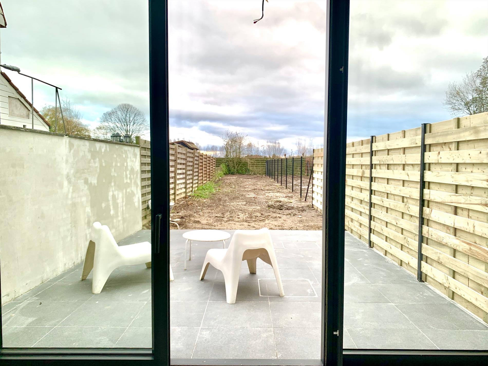Aan de zithoek grenst het nieuw aangelegde terras aan de zonnige tuin waar het aangenaam vertoeven is.