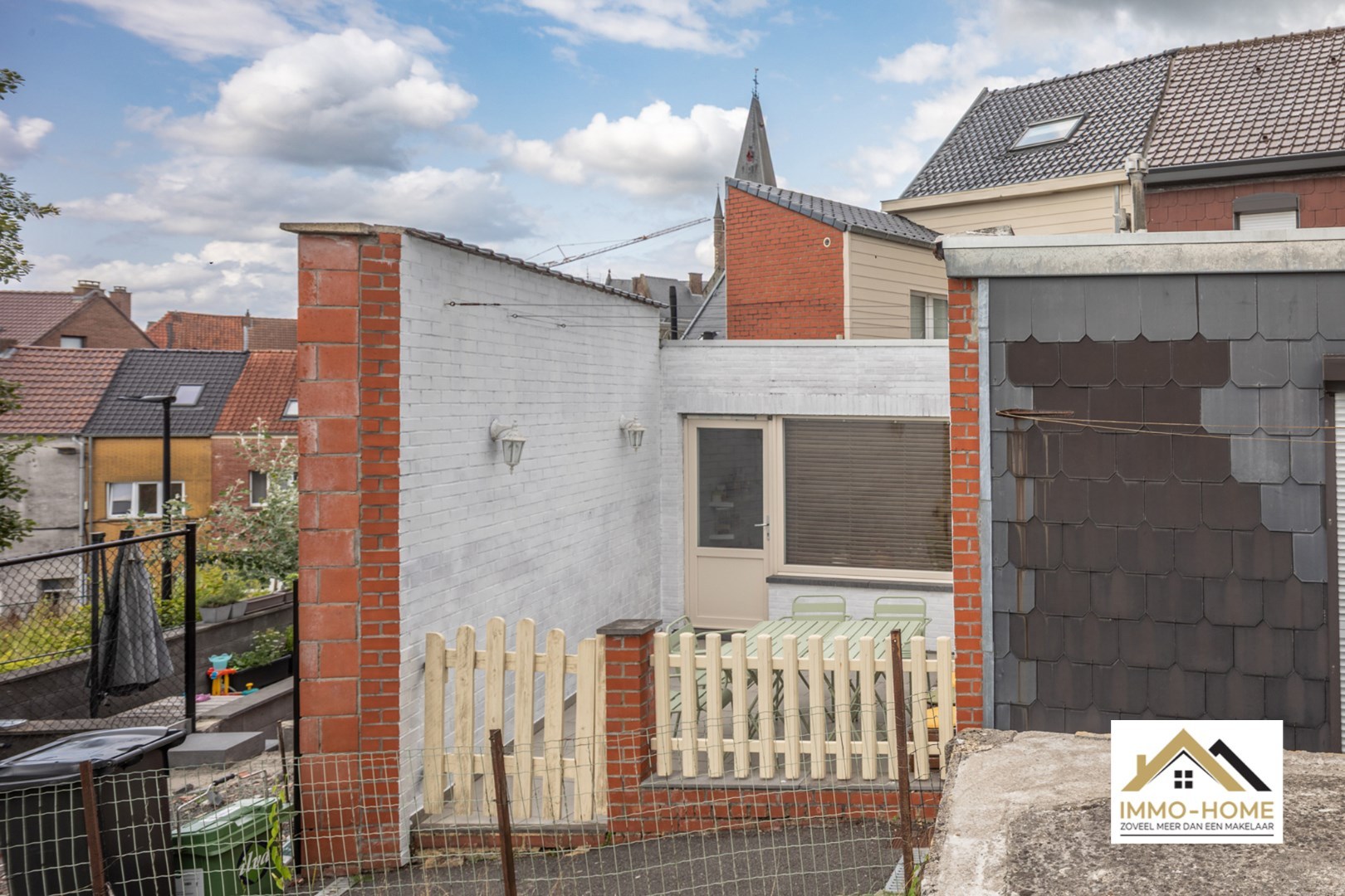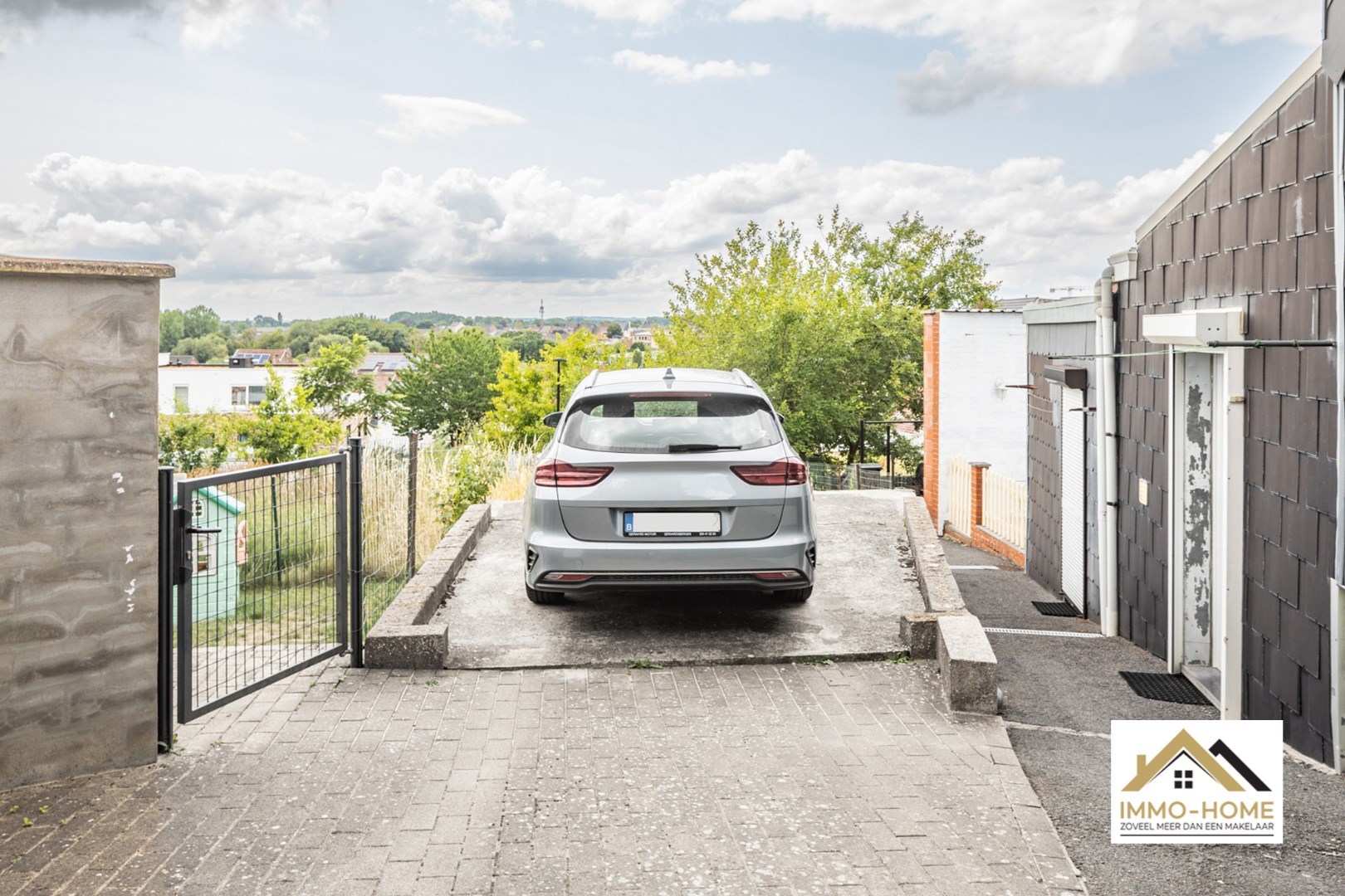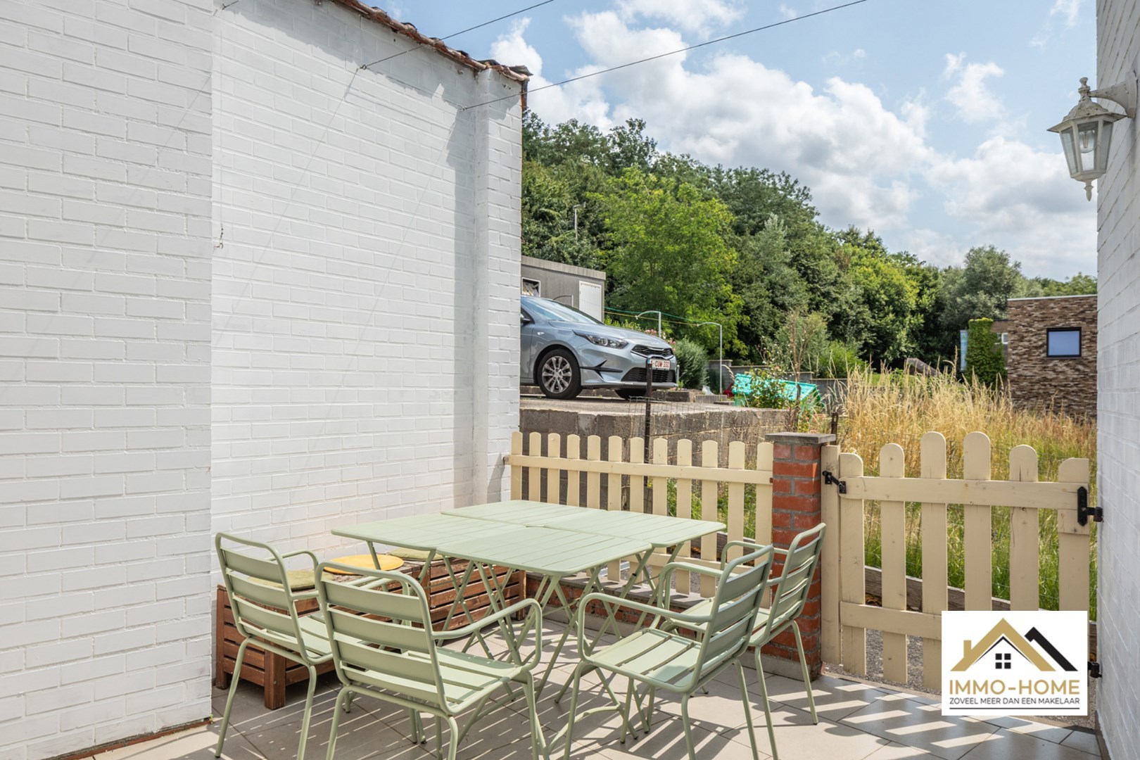Buiten is er een gezellig betegeld terras met open uitzicht. Achteraan de woning is er een private parkeerplaats, vlot bereikbaar en praktisch in gebruik.