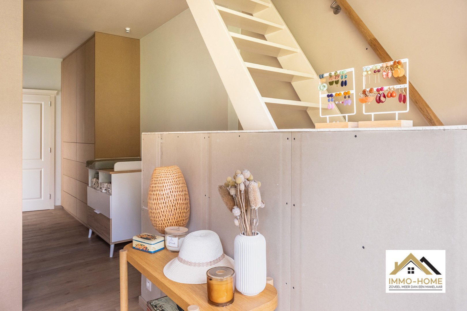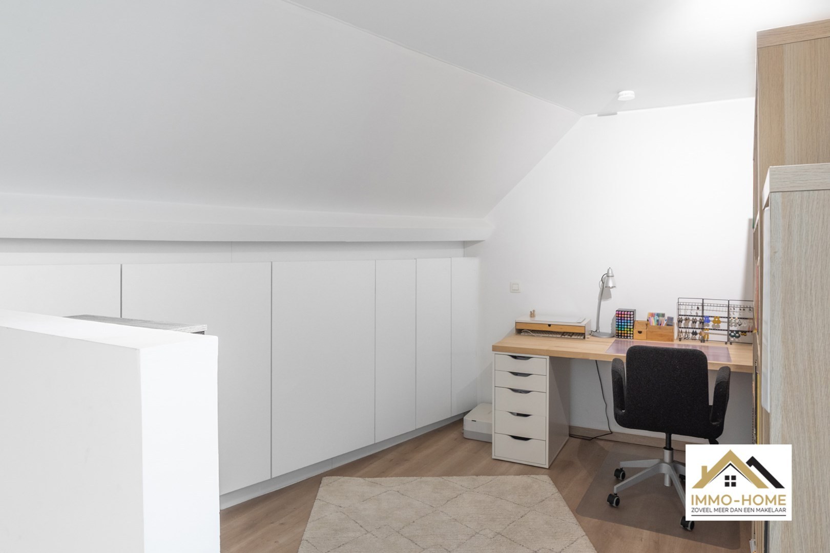 De verbindingsgang is functioneel ingericht met ingemaakte kasten en biedt toegang tot de hoger gelegen verdieping. Hier vind je een open bureauruimte en een extra slaapkamer, ideaal als werk- of logeerkamer.