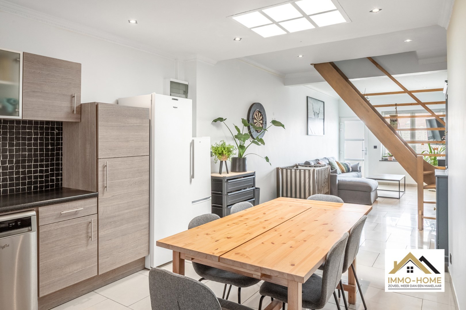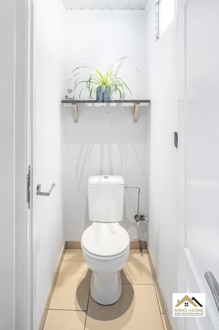 Aansluitend vind je de open, goed uitgeruste keuken, die dankzij een lichtkoepel baadt in natuurlijk daglicht. Op het gelijkvloers is er tevens een gastentoilet en een doorgang naar het achtergelegen steegje en toegang tot de tuin.