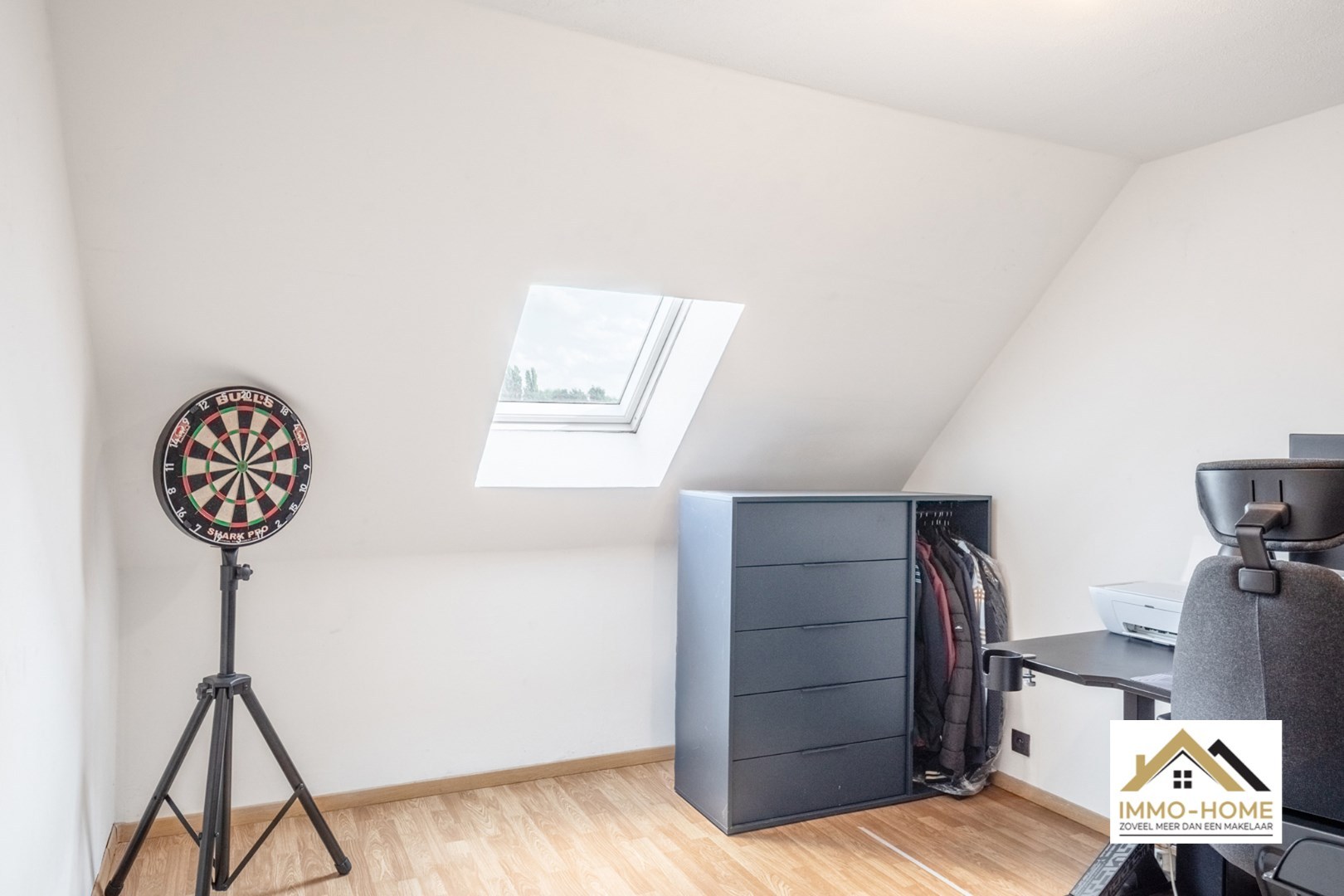 De tweede kamer, bereikbaar via een vaste trap, is momenteel ingericht als bureau en bergruimte, met een dakraam dat zorgt voor extra lichtinval.