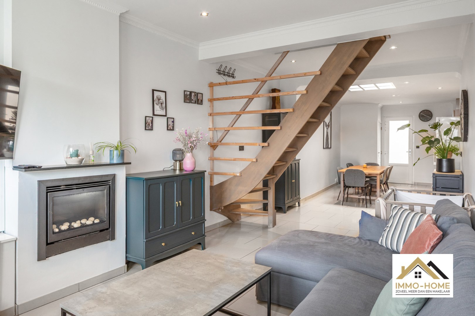 Bij het betreden van de woning kom je in een heldere leefruimte met inbouwcassette en een open trap naar de bovenverdieping.