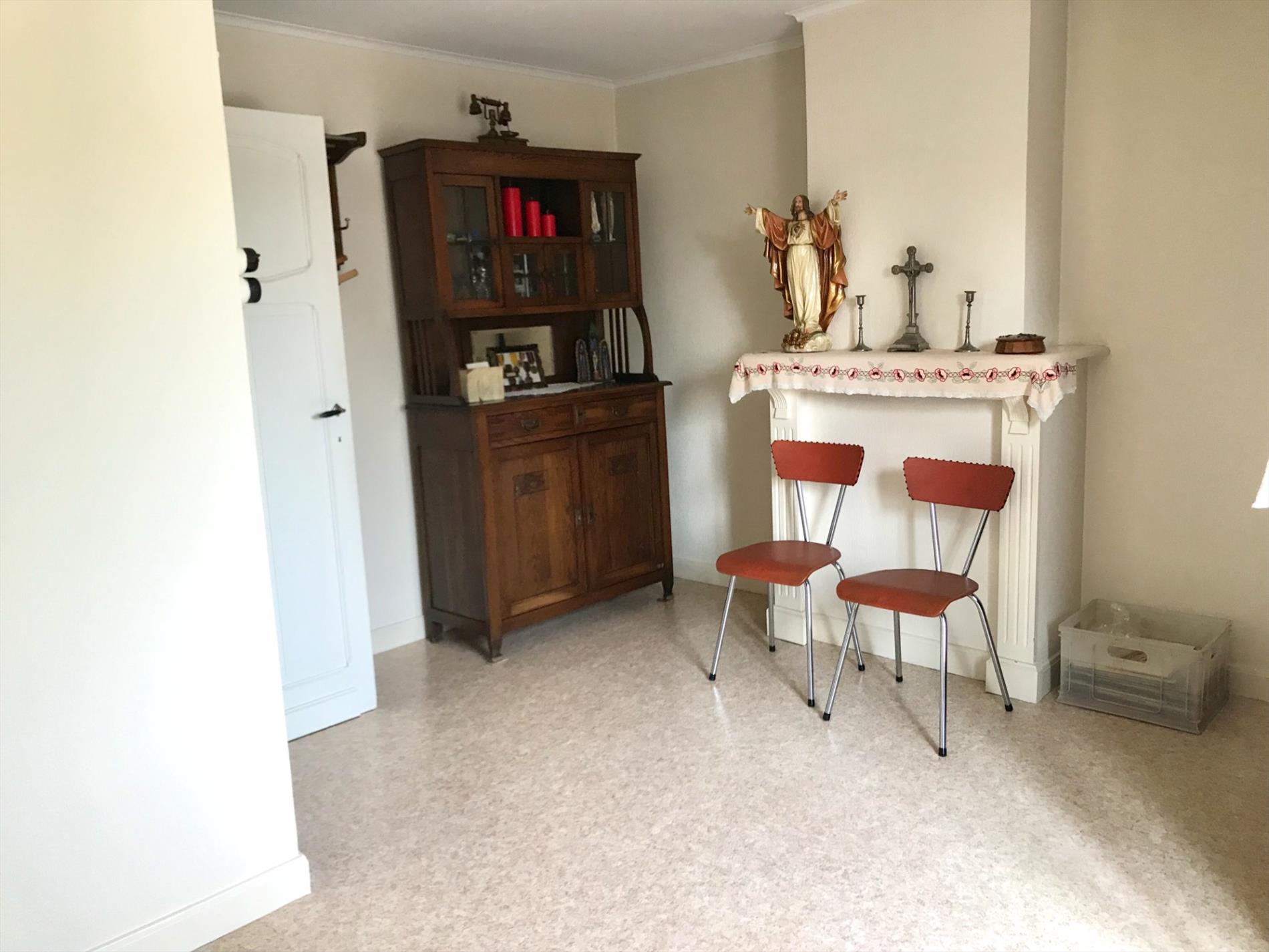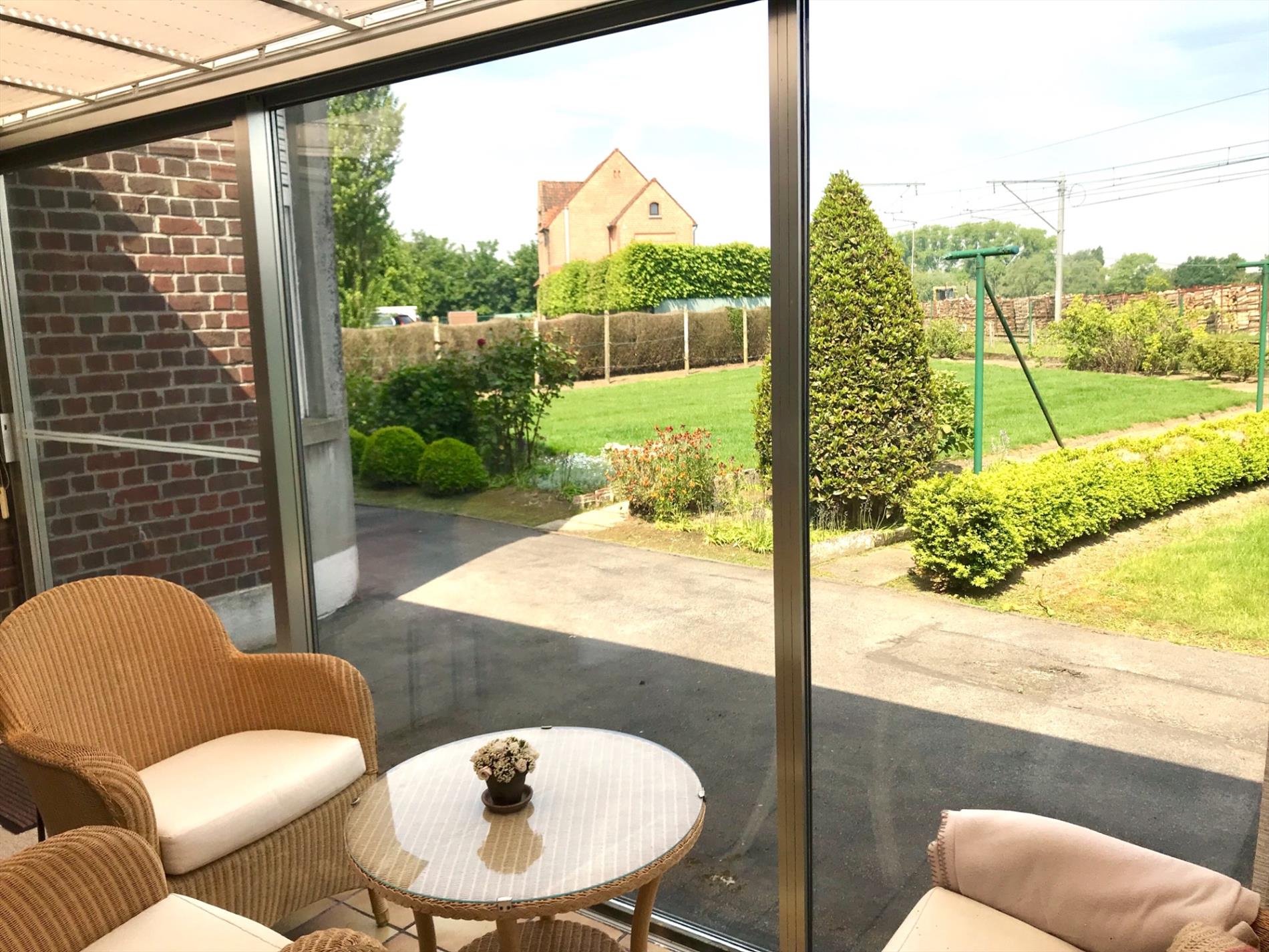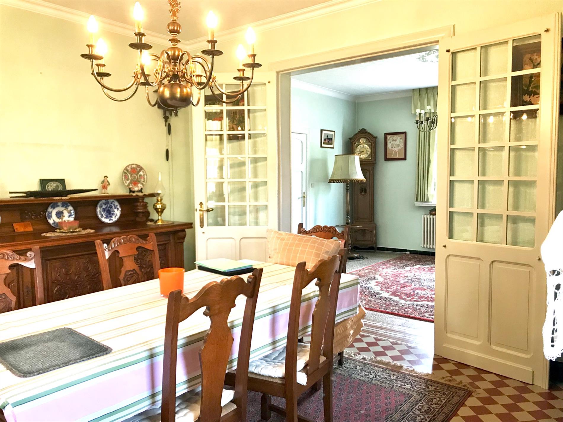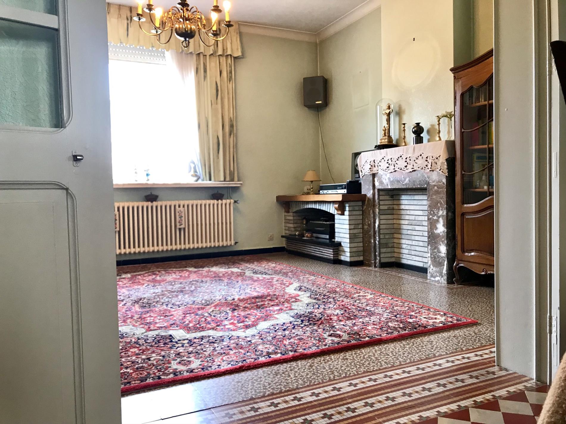 Deze woning is momenteel op het gelijkvloers ingedeeld met een inkomhal, woonkamer, keuken met toestellen, badkamer, toilet en een veranda die uitkijkt op de grote tuin. (545m2)