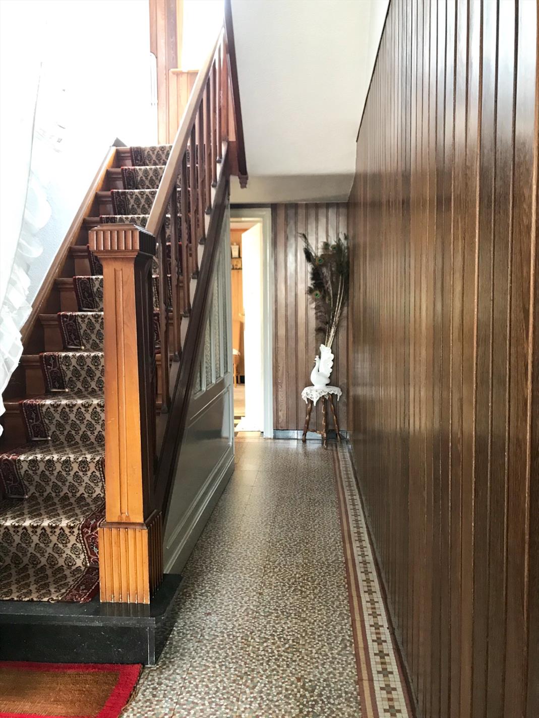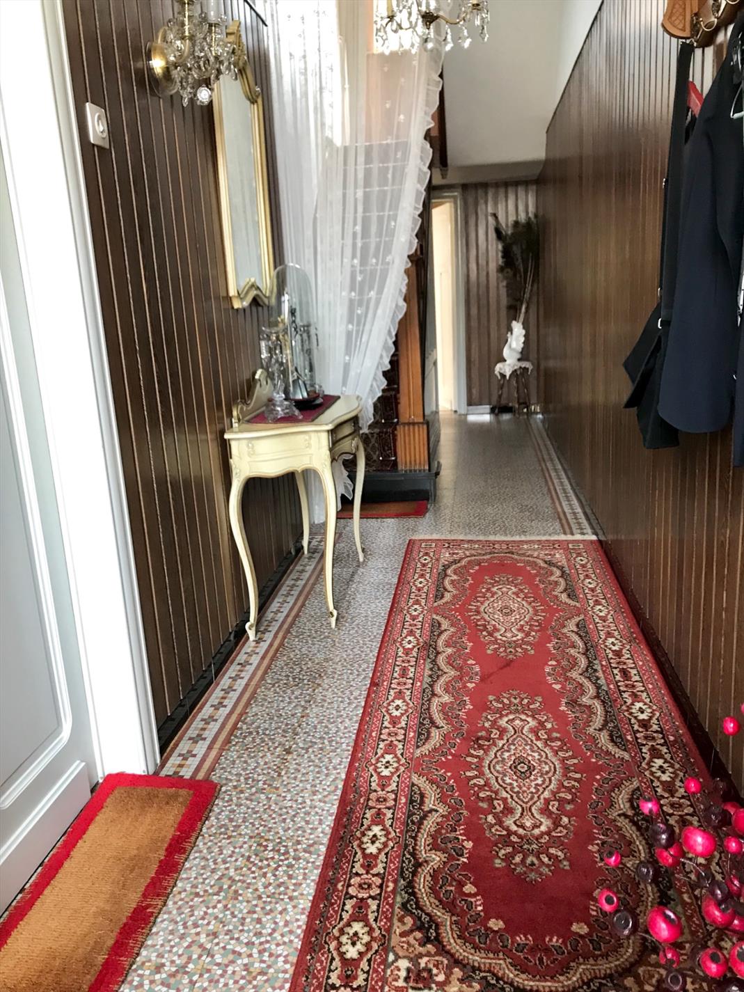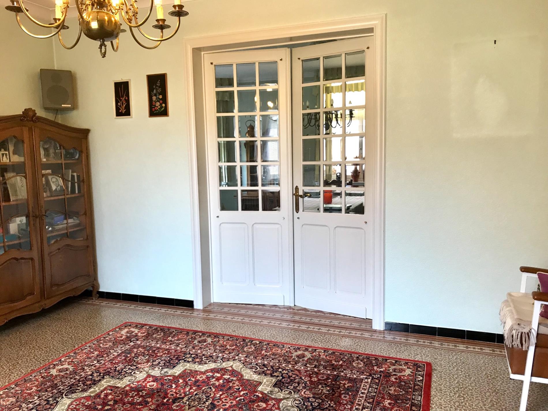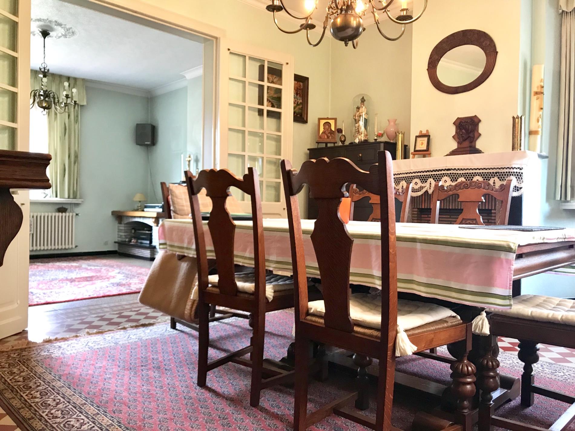 Deze woning is momenteel op het gelijkvloers ingedeeld met een inkomhal, woonkamer, keuken met toestellen, badkamer, toilet en een veranda die uitkijkt op de grote tuin. (545m2)