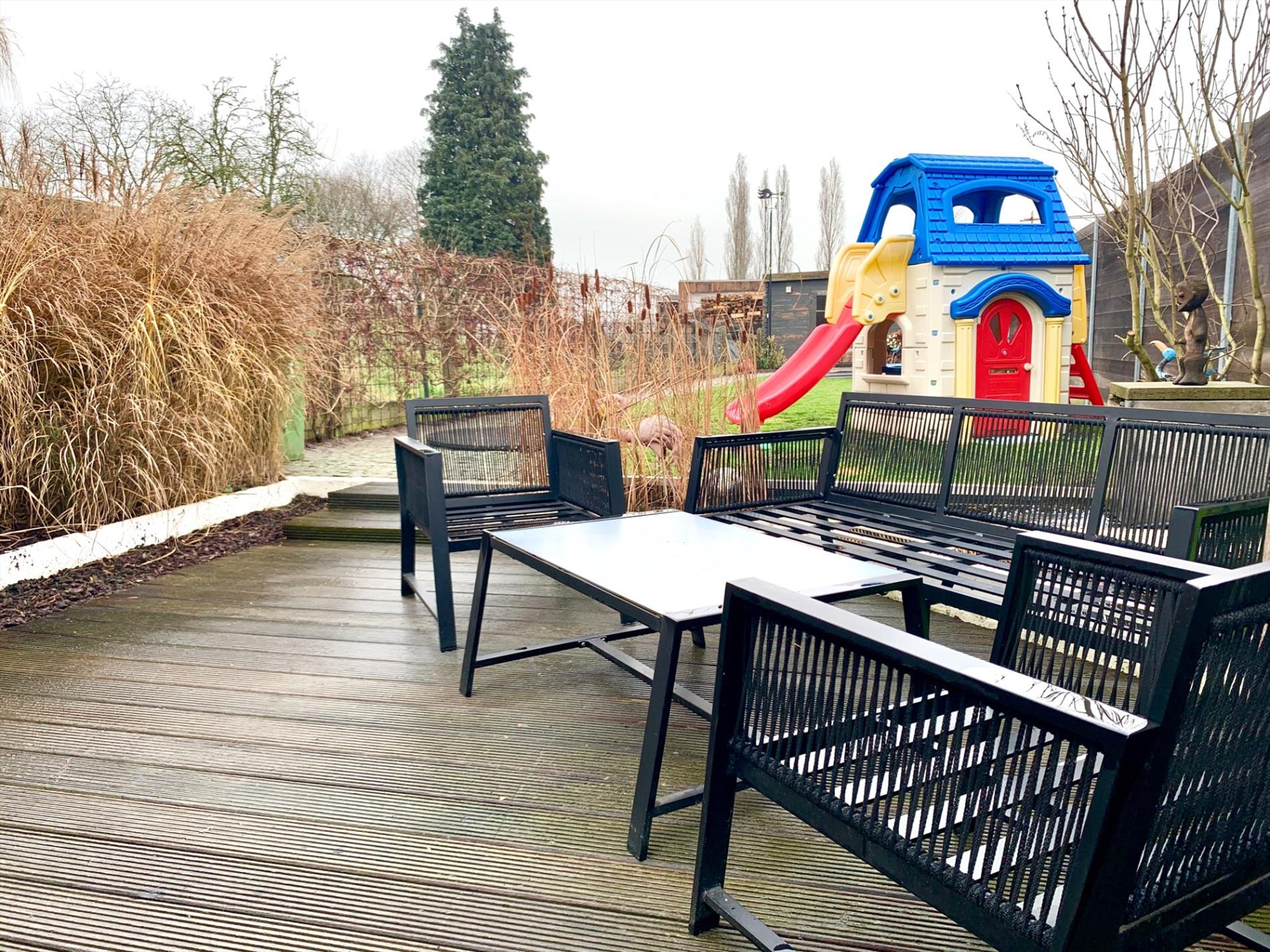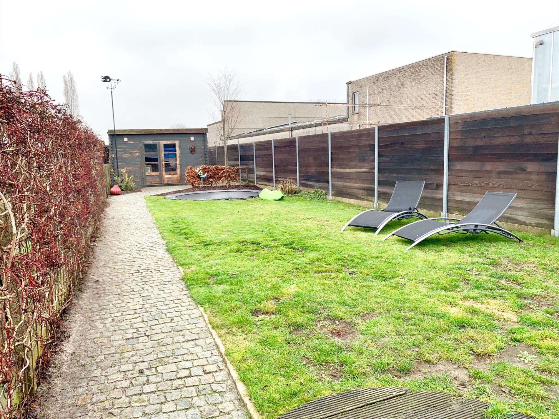 Ook buiten is het gezellig vertoeven op het bangkirai terras met kleine vijvertje, achteraan is een grote tuin die volledig afgesloten is en ook een tuinhuis en houten fietsenstalling/opbergruimte.