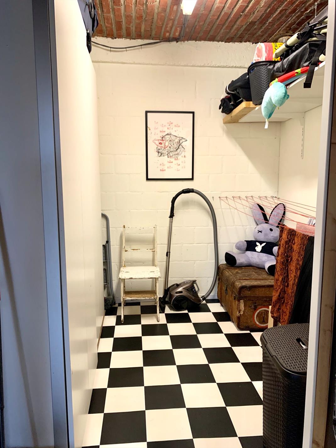 Naast de keuken is gang naar buiten met ingemaakte kasten en aansluiting voor wasmachine e.d., ook het gastentoilet en een aparte grote opbergplaats.